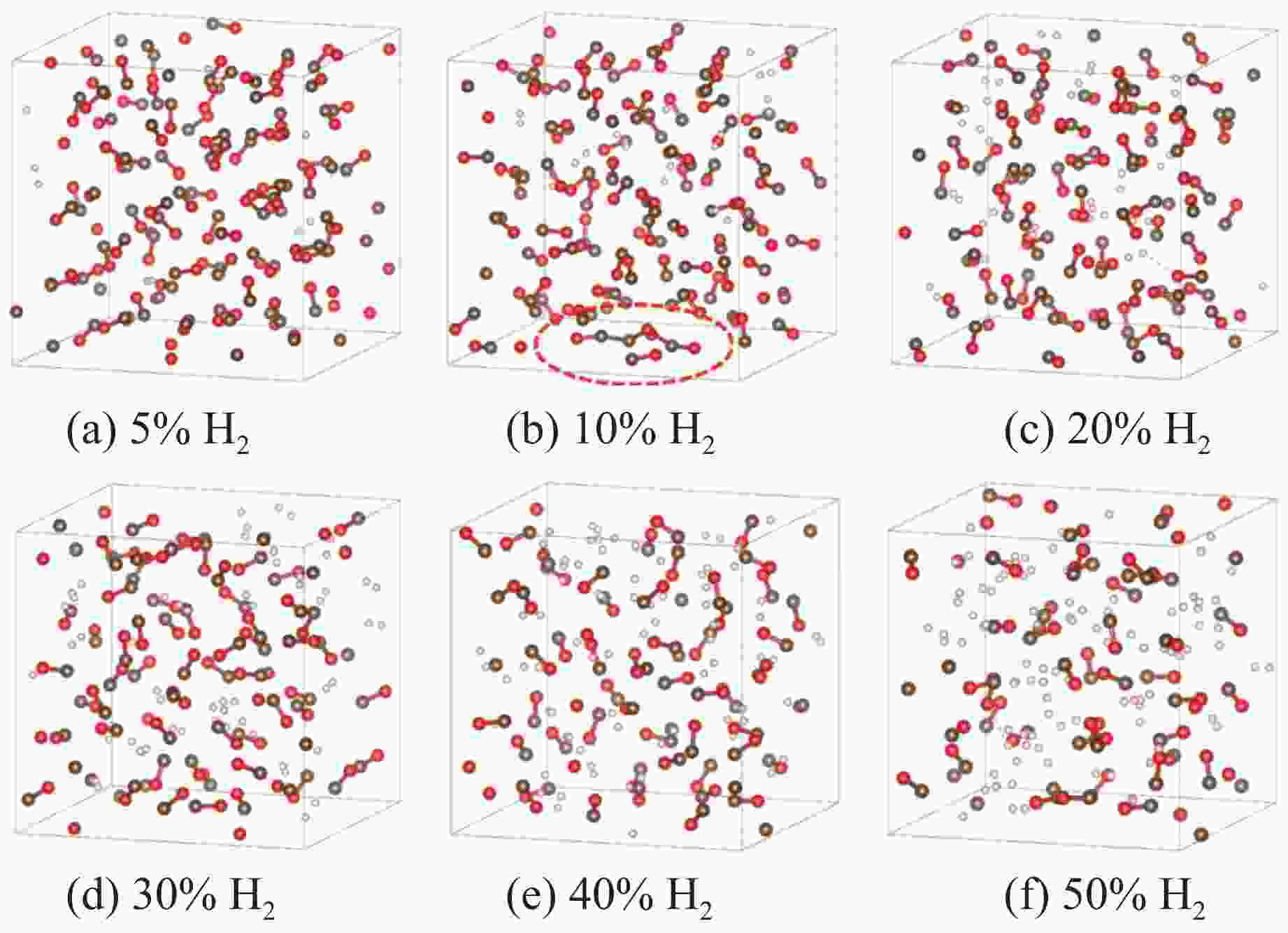 Figure 4. Structural models of H2/CO mixed systems with different H2 molarratios under 4 GPa (The brown, red and white balls denote C, O and H atoms, respectively; the red circle indicates CO oligomer; the H―H bonds are omitted for clarity.)