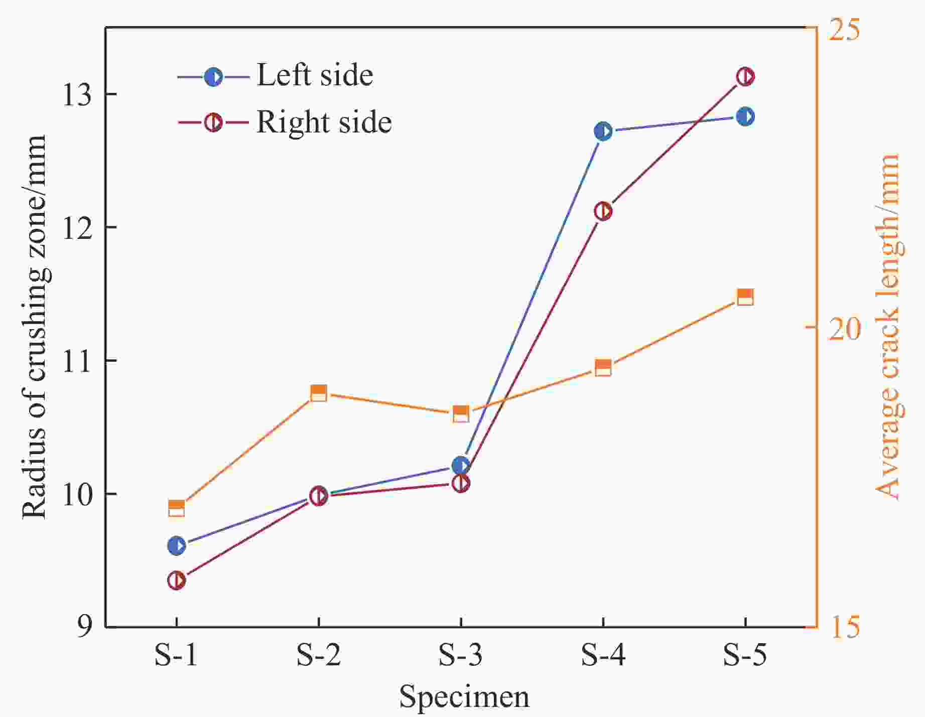 Figure  6.  Radius of the crushing zone of the specimen and the average length of the crack