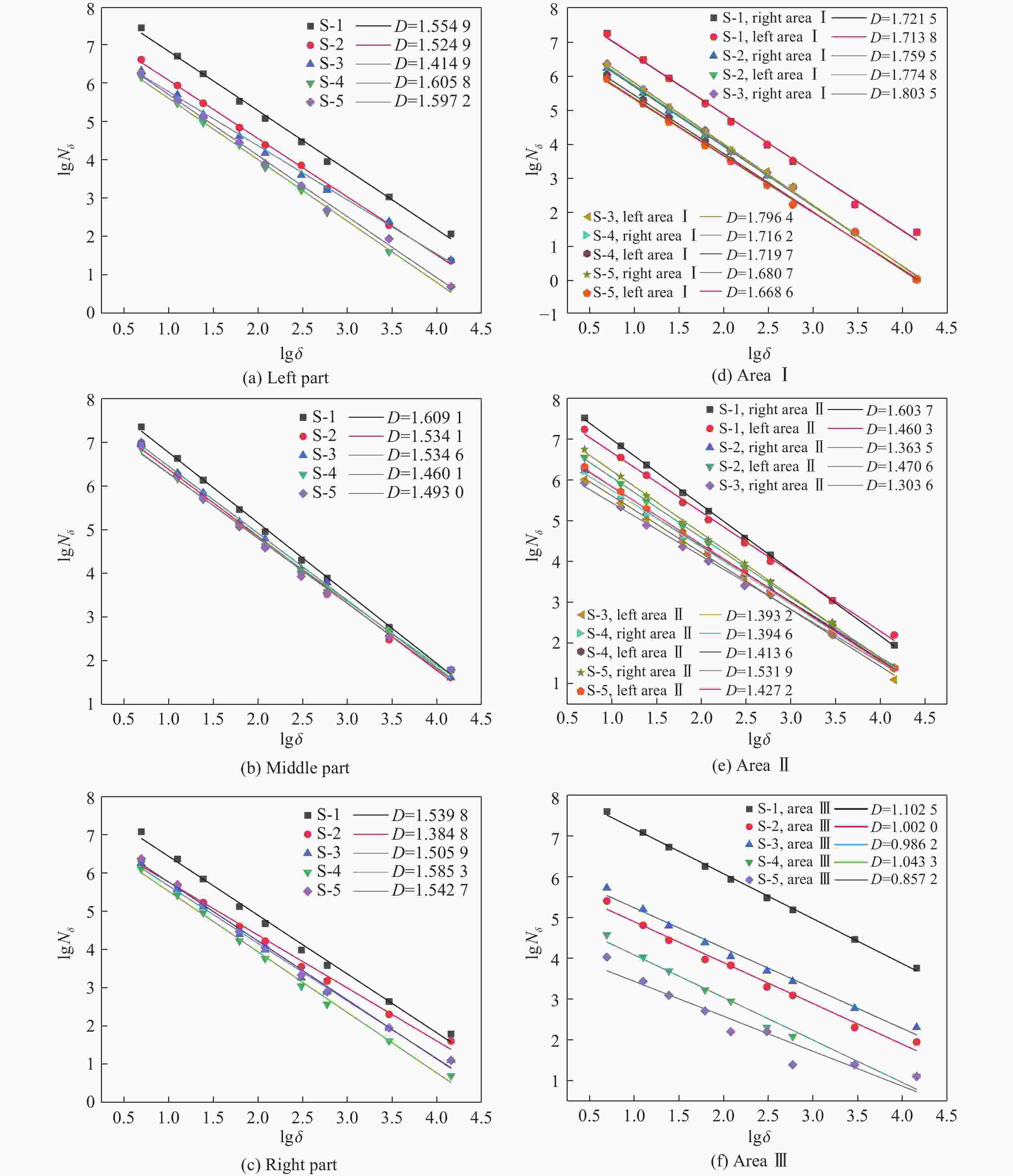 Figure  8.  Fractal dimension fitting curves for different regions of each specimen
