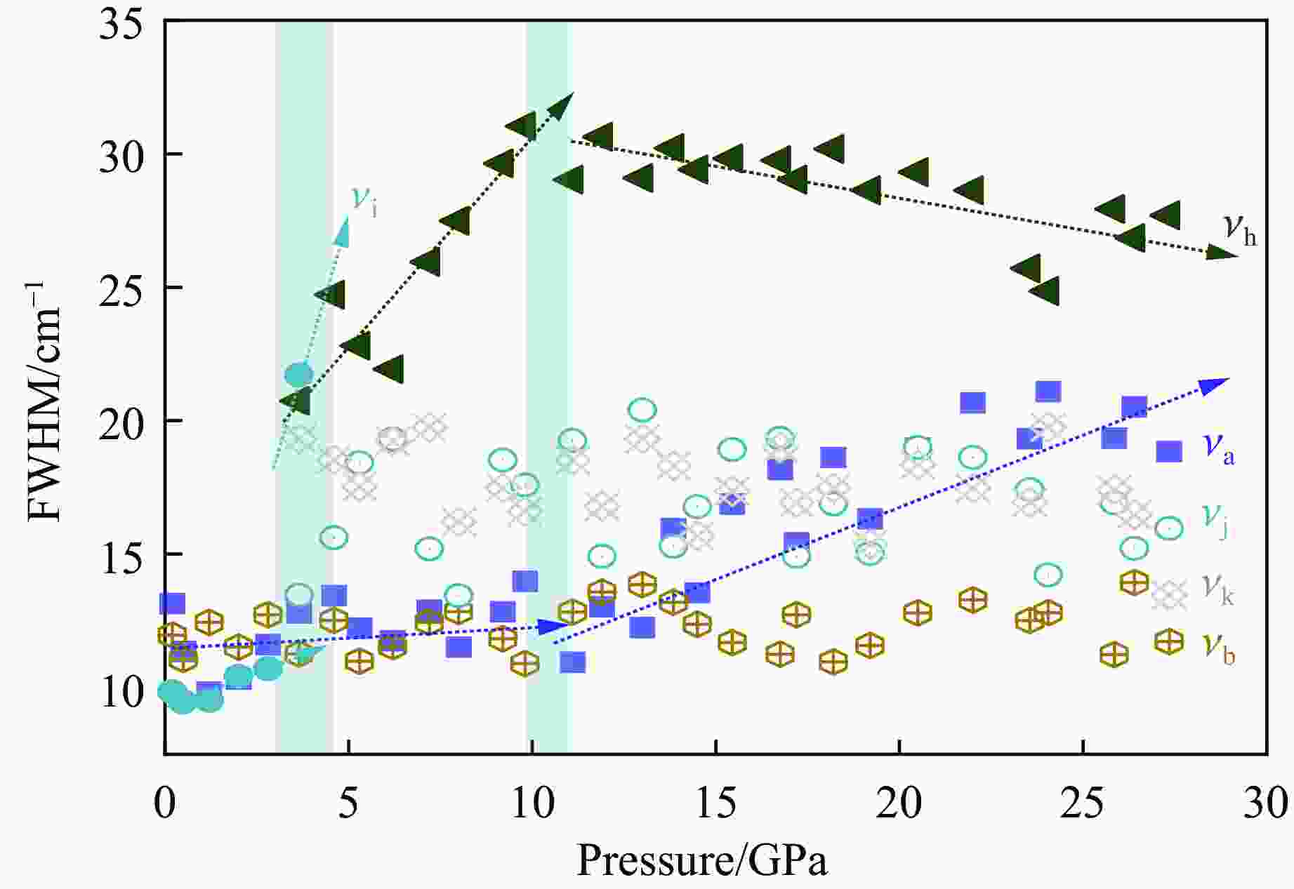 cm−1νc/cm−1 νd/cm−1 νe/cm−1 νf/cm−1 νg/cm−1 10−4 186.70(1) 6.8(1) 284.89(1) 7.4(1) 389.98(1) 415.99(1) 439.61(1) 0.2 187.55(1) 13.1(1) 286.24(1) 11.9(1) 418.87(1) 442.53(1) 0.5 187.90(1) 11.3(1) 287.27(1) 11.0(1) 420.55(1) 444.29(1) 1.2 189.45(1) 9.8(1) 289.33(1) 12.4(1) 397.59(1) 422.21(1) 446.54(1) 2.0 191.25(1) 10.3(1) 290.39(1) 11.5(1) 402.20(1) 425.39(1) 451.92(1) 2.8 192.77(1) 11.6(1) 291.58(1) 12.7(1) 405.51(1) 427.74(1) 455.99(1) 3.6 193.95(1) 12.7(1) 291.93(1) 11.2(1) 406.79(1) 429.17(1) 456.85(1) 516.39(1) 550.13(1) 4.6 194.88(1) 13.4(1) 292.57(1) 12.5(1) 523.21(1) 551.41(1) 5.3 196.21(1) 12.2(1) 293.91(1) 10.9(1) 527.35(1) 551.88(1) 6.2 197.20(1) 11.7(1) 294.49(1) 11.5(1) 529.14(1) 552.78(1) 7.2 198.66(1) 12.9(1) 295.08(1) 12.4(1) 531.08(1) 553.03(1) 8.0 199.80(1) 11.5(1) 295.55(1) 12.8(1) 532.51(1) 553.99(1) 9.2 200.22(1) 12.8(2) 297.00(1) 11.8(1) 554.27(1) 9.8 202.60(1) 13.9(1) 297.89(1) 10.9(1) 555.51(1) 11.1 203.84(1) 10.9(1) 298.46(1) 12.8(1) 555.83(1) 11.9 204.62(1) 13.0(2) 299.56(1) 13.5(1) 556.92(1) 13.0 205.06(1) 12.2(1) 300.12(1) 13.8(1) 557.22(1) 13.8 205.42(1) 15.9(2) 300.45(1) 13.2(1) 558.42(2) 14.5 205.82(1) 13.5(2) 300.85(1) 12.3(1) 558.92(1) 15.4 207.44(1) 16.8(2) 301.31(1) 11.6(1) 559.02(2) 16.7 207.98(1) 18.1(2) 301.88(1) 11.2(1) 560.70(1) 17.2 208.42(1) 15.4(2) 302.53(1) 12.7(1) 561.07(1) 18.2 209.53(1) 18.6(1) 303.45(1) 10.9(1) 561.52(3) 19.2 210.02(1) 16.3(2) 303.62(1) 11.5(1) 561.77(1) 20.5 210.08(1) 18.9(2) 303.98(1) 12.8(1) 562.12(3) 22.0 211.62(1) 20.6(3) 304.63(1) 13.2(1) 563.32(2) 23.5 212.45(1) 19.3(2) 304.93(1) 12.5(1) 564.38(2) 24.0 213.19(1) 21.0(2) 305.06(1) 12.8(1) 565.32(2) 25.8 213.82(1) 19.3(2) 305.62(1) 11.2(1) 564.99(1) 26.4 214.31(1) 20.5(3) 306.24(1) 13.9(1) 565.92(1) 27.3 214.72(1) 18.8(3) 306.62(1) 11.7(1) 566.85(3) 表 2 不同压力下α-FePO4或FePO4-Ⅱ的拉曼振动峰峰位和半高宽(900~