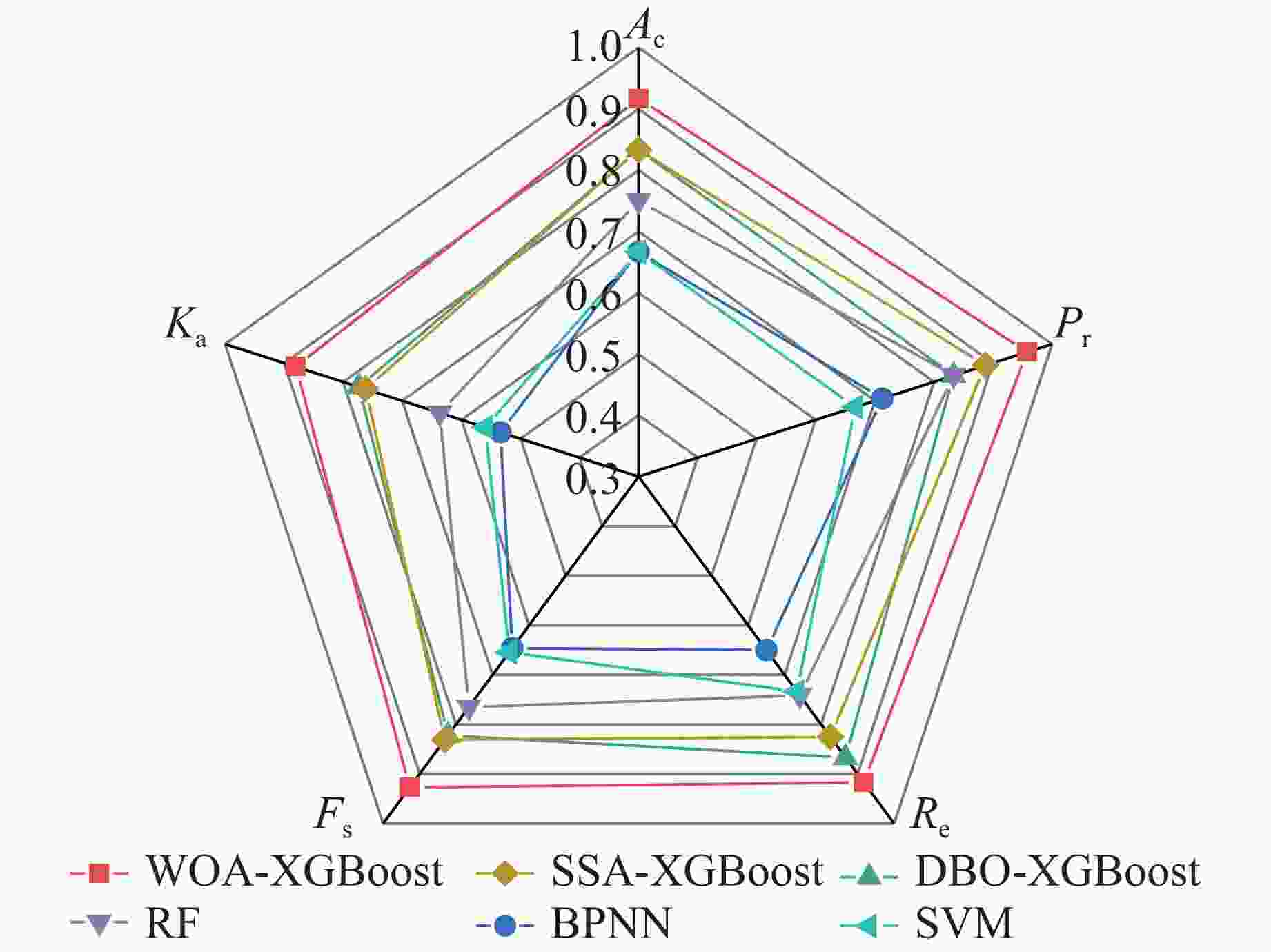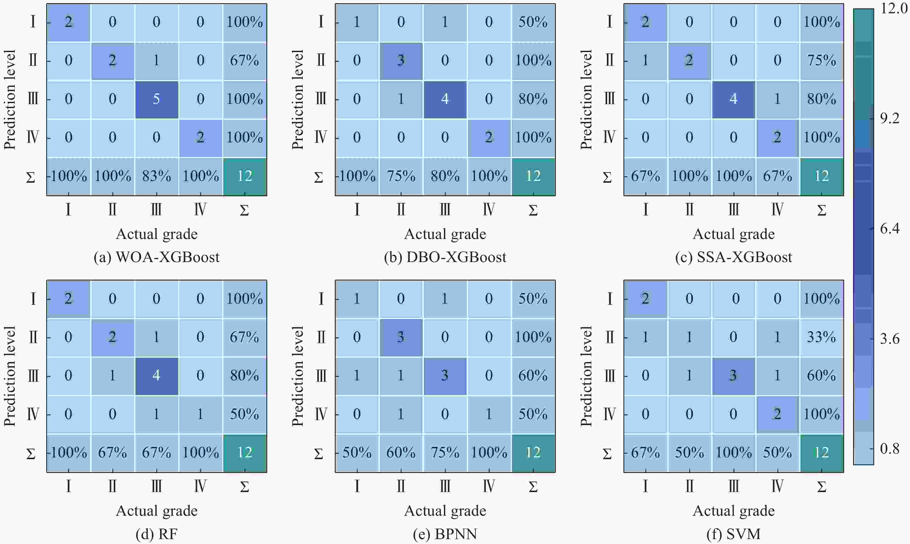 Parameter Parameter meaning Range Initial value Num_iters Maximum number of iterations [10, 100] 30 Max_depth Maximum depth of tree [1, 18] 6 Eta Learning rate [0, 1] 0.3 表 8 模型各等级预测情况