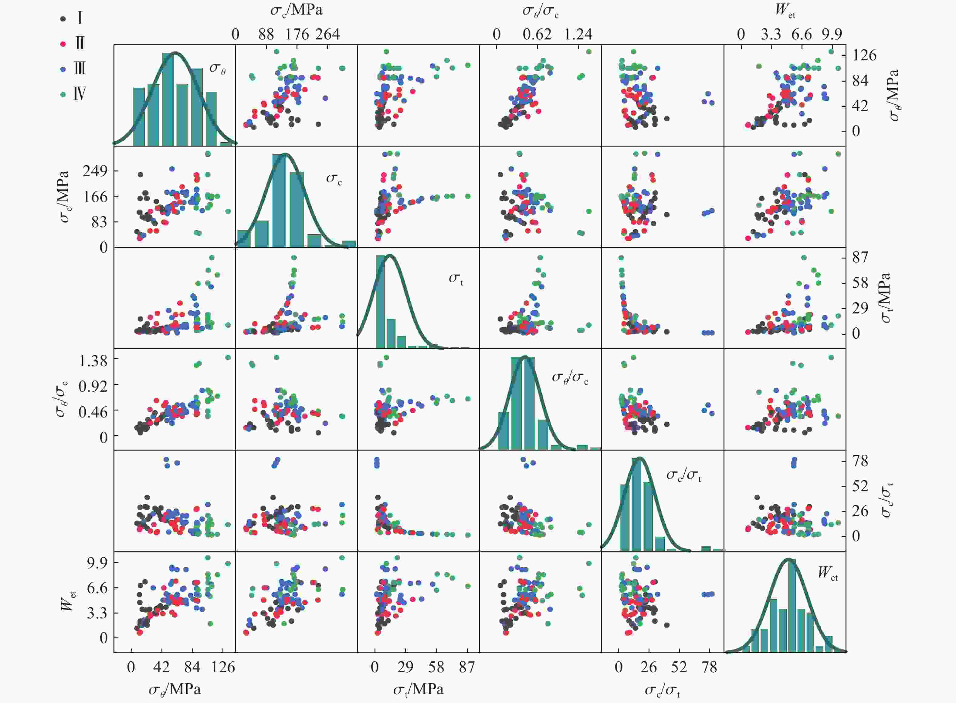 Rock burst level σc/MPa σθ/MPa σt/MPa σc/σt σθ/σc Wet No rock burst (Ⅰ) <80 <24 <5 >40.0 <0.3 <2.0 Minor rock burst (Ⅱ) 80−120 24−60 5−7 26.7−40.0 0.3−0.5 2.0−4.0 Moderate rock burst (Ⅲ) 120−180 60−126 7−9 14.5−26.7 0.5−0.7 4.0−6.0 Strong rock burst (Ⅳ) >180 126−200 9−30 <14.5 >0.7 >6.0 Serial No. σθ/MPa σc/MPa σt/MPa σc/σt σθ/σc Wet Rock burst level 1 22.40 91.20 5.99 15.23 0.25 2.60 Ⅰ 2 12.60 41.70 3.15 13.24 0.30 1.70 Ⅰ … … … … … … … … 105 110.35 167.19 87.53 1.91 0.66 6.83 Ⅳ 106 26.06 118.46 19.61 6.04 0.22 2.89 Ⅱ 表 3 变量的基本信息
