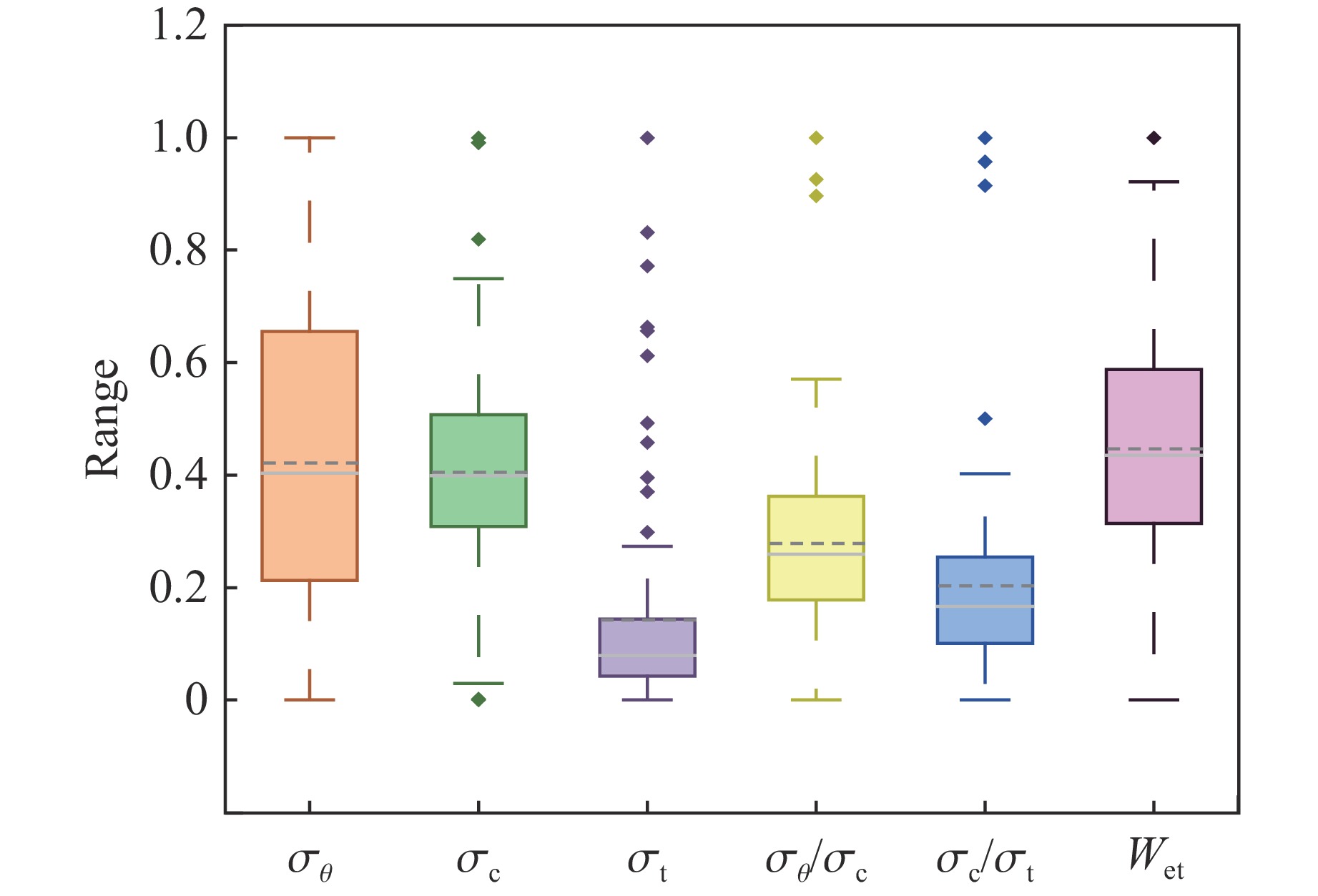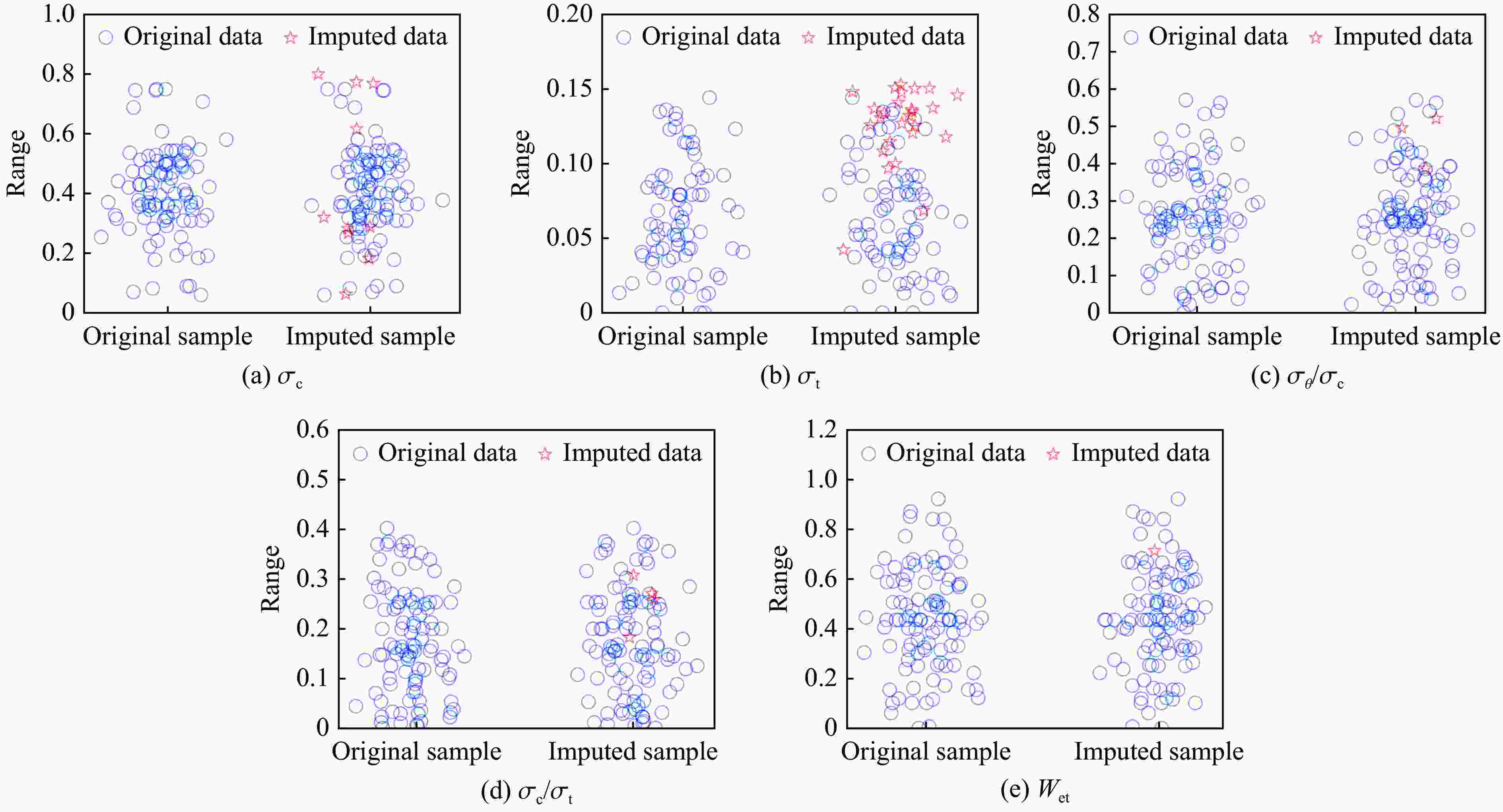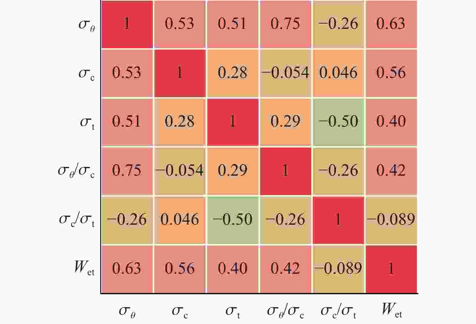 Statistic σθ/MPa σc/MPa σt/MPa σθ/σc σc/σt Wet Average 60.20 141.75 13.76 0.43 17.74 5.11 Standard deviation 31.97 55.12 15.55 0.23 13.22 2.05 Minimum value 7.50 29.45 1.50 0.05 1.91 0.70 Maximum value 132.60 306.58 87.53 1.40 80.00 10.57 25% percentile (Q1) 34.24 115.45 5.20 0.29 9.79 3.80 50% percentile (Q2) 57.92 140.00 8.30 0.40 14.90 5.00 75% percentile (Q3) 89.53 169.52 13.73 0.54 21.75 6.50 Median 57.92 140.00 8.30 0.40 14.90 5.00 Mode 105.00 115.00 8.30 0.38 17.50 5.00 表 4 部分标准化数据