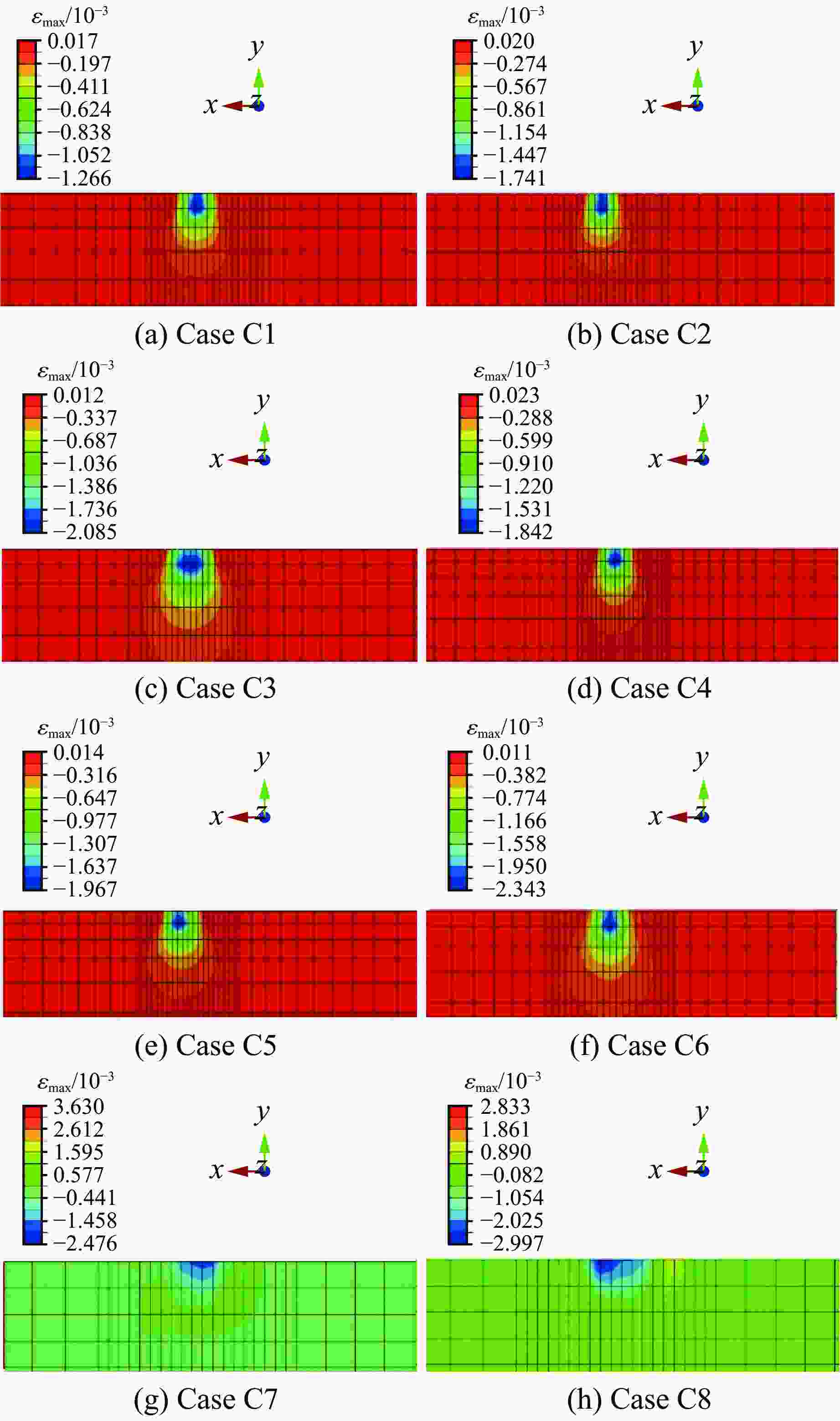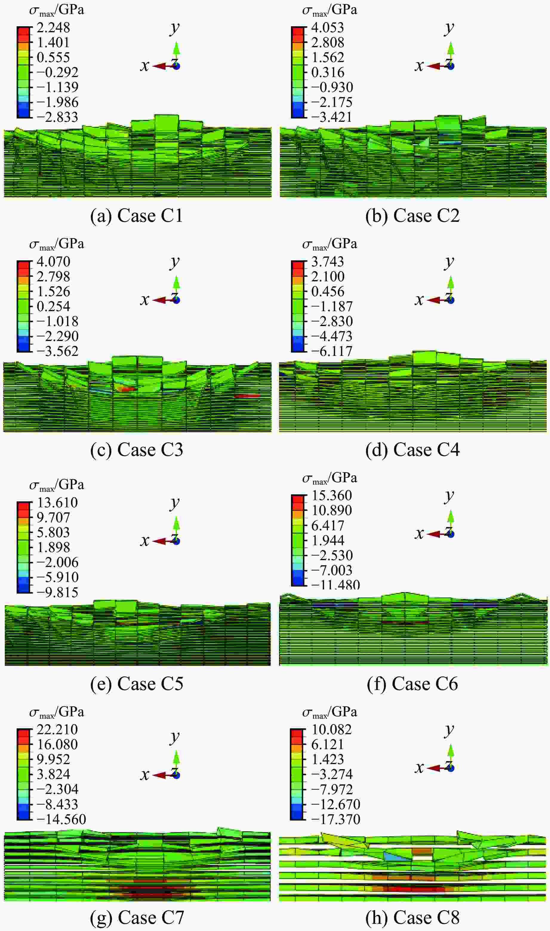 Case σmax/GPa εmax True value Predicted value True value Predicted value C1 2.83 2.76 0.012 6 0.013 4 C2 3.42 3.51 0.017 4 0.018 9 C3 3.56 4.15 0.020 8 0.022 6 C4 6.12 6.19 0.018 4 0.019 7 C5 9.02 9.12 0.019 6 0.021 8 C6 11.41 12.52 0.023 4 0.026 1 C7 14.56 15.32 0.024 8 0.027 2 C8 17.37 16.81 0.029 9 0.030 3 -