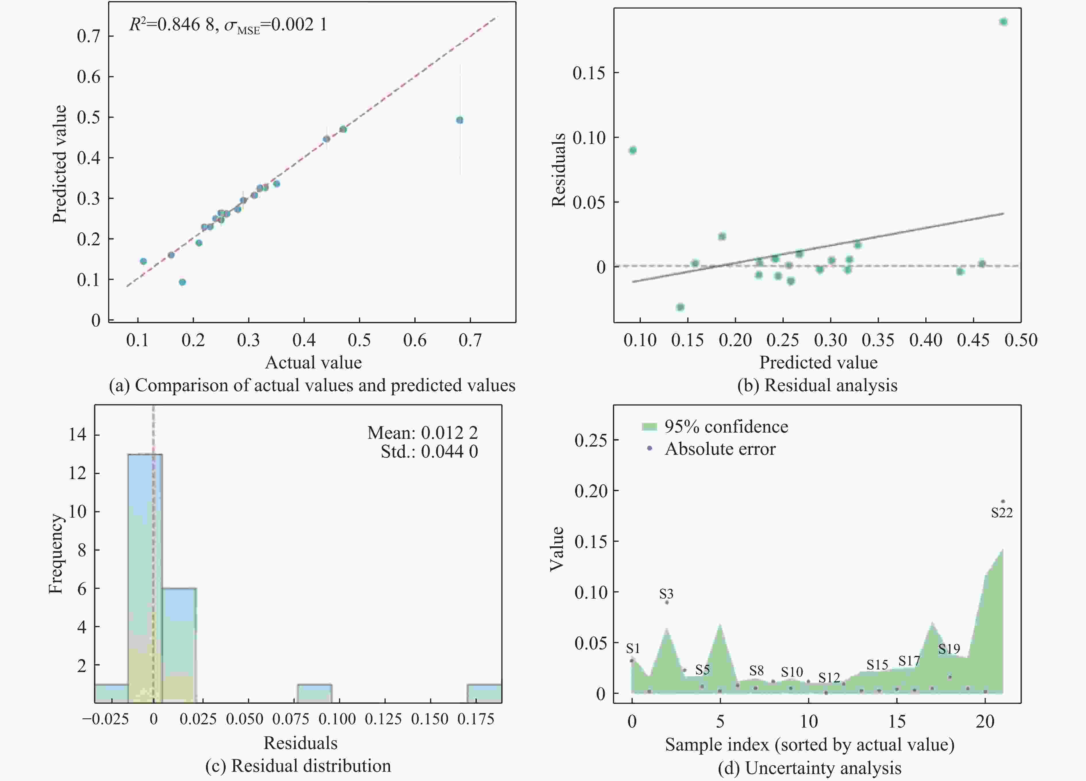 Abstract: Engine high-pressure turbine blades operating in extreme environments, such as deserts, are subjected to long-term high-velocity impacts from sand particles carried by hot combustion gases, significantly reducing their service life. Owing to its high hardness and toughness, the TiN/Ti multilayer coating has emerged as a preferred surface coating material for such blades. However, its erosion resistance is highly dependent on structural parameters, and traditional experimental trial-and-error methods and finite element simulations are often time-consuming and labor-intensive. To address this challenge, this study proposes a TiN/Ti multilayer coating design framework that integrates small-sample machine learning (ML) with finite element analysis. Multiple regression algorithms were evaluated, and Gaussian process regression (GPR) was selected for its superior performance, enabling high-accuracy prediction of the maximum intralayer stress and the maximum plastic strain in the substrate under dynamic impact conditions (with R2 values of 0.88 and 0.85, respectively). The modelʼs fitting capability was further enhanced through residual and uncertainty analyses. Moreover, shapley additive explanations (SHAP) analysis was employed to elucidate the contribution of each feature to the target variables. Finally, eight new coating structures under varying impact conditions were designed and simulated to validate the predictive accuracy of the ML model. This framework offers a data-efficient and computationally economical solution for impact-resistant coating design in high-dimensional parameter spaces.-