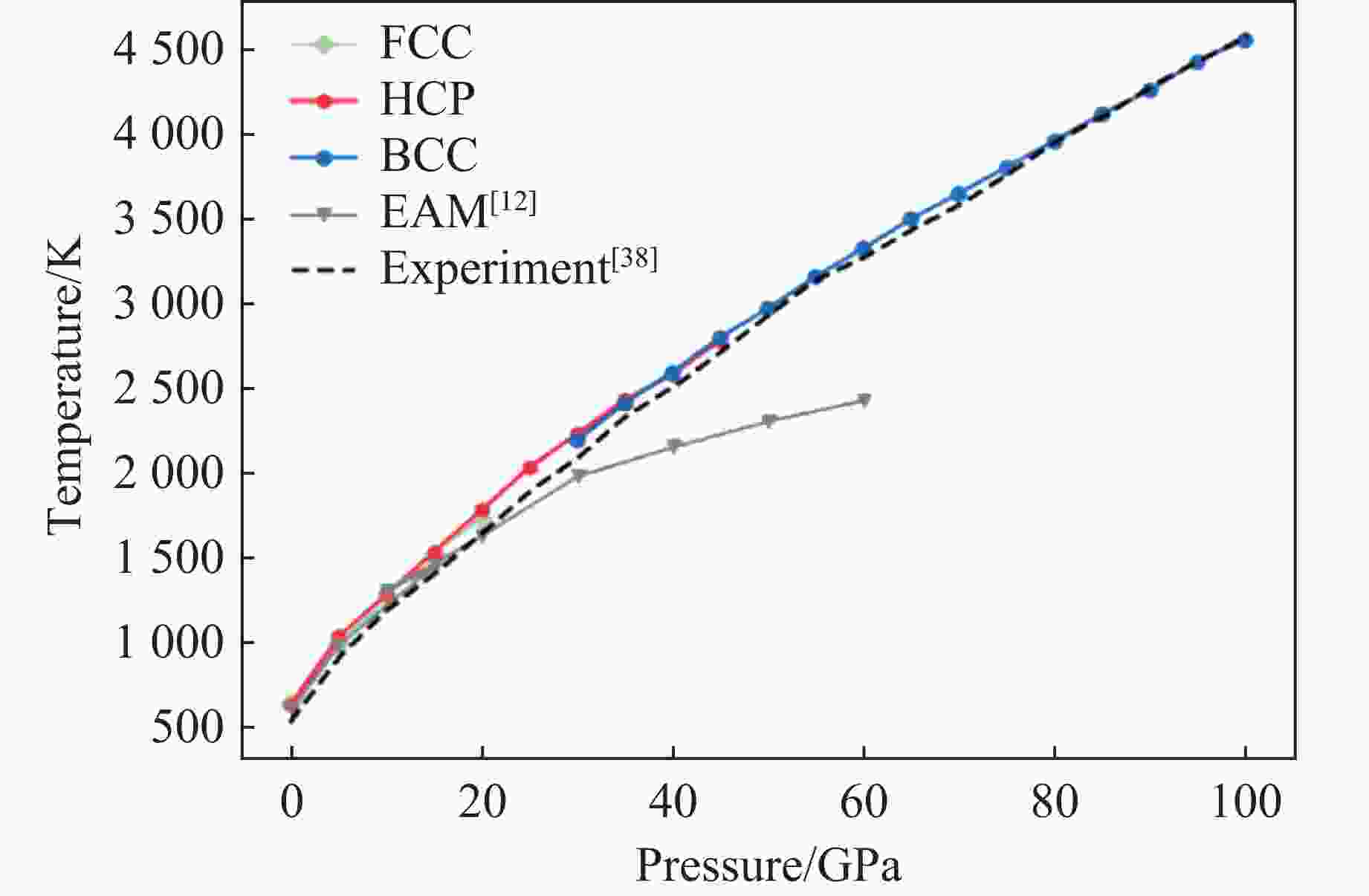 图  DP-PbSn及现有的EAM势函数[12]对0~100 GPa下的Pb熔点预测结果