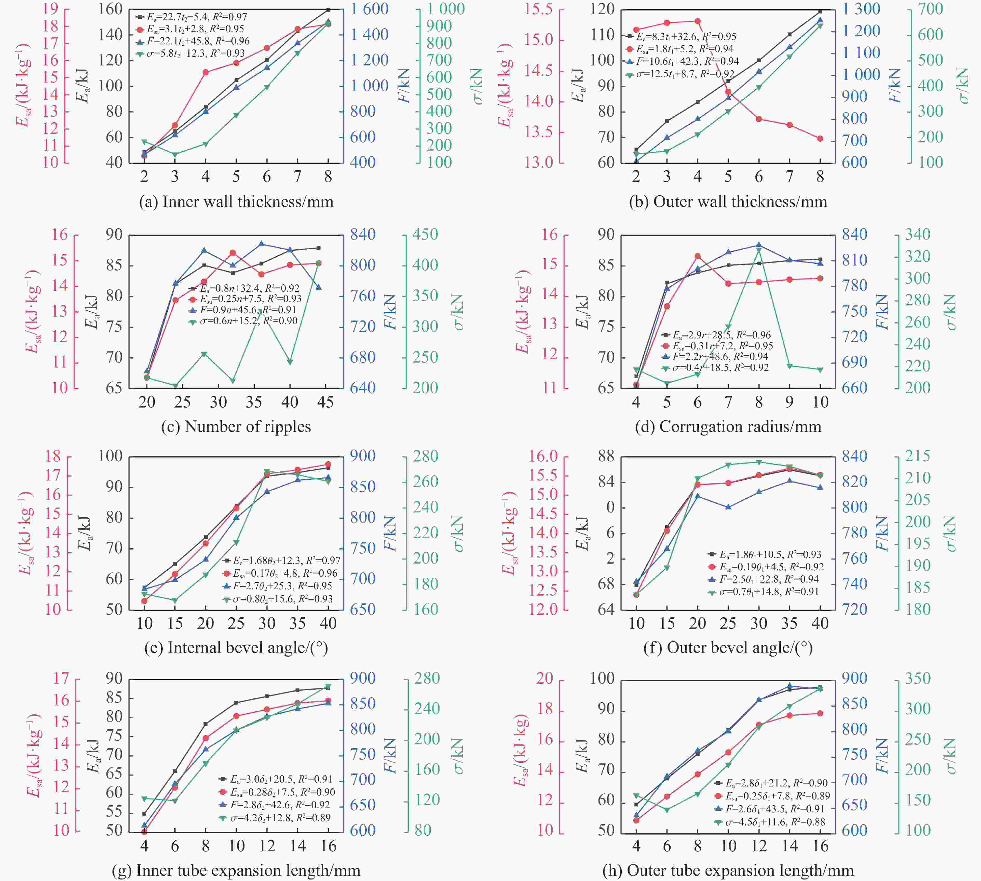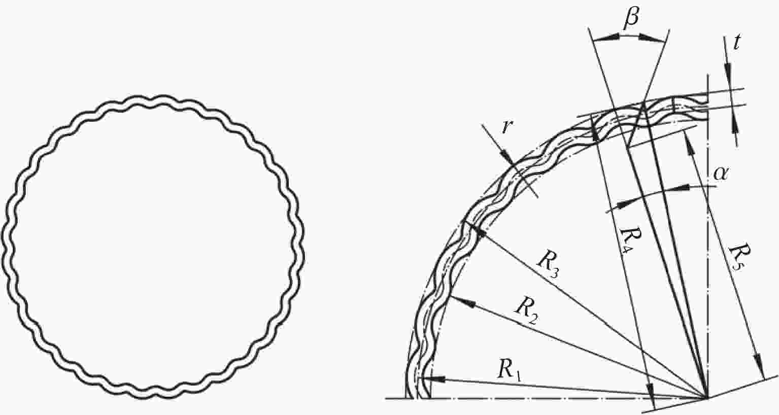 Wall thickness/mm Number of ripples Corrugation radius/mm Bevel angle/(°) Tube expansion length/mm Inner Outer Internal Outer Inner Outer 2 2 20 4 10 10 4 4 3 3 24 5 15 15 6 6 4 4 28 6 20 20 8 8 5 5 32 7 25 25 10 10 6 6 36 8 30 30 12 12 7 7 40 9 35 35 14 14 8 8 44 10 40 40 16 16 表 4 设计变量名称、范围及符号