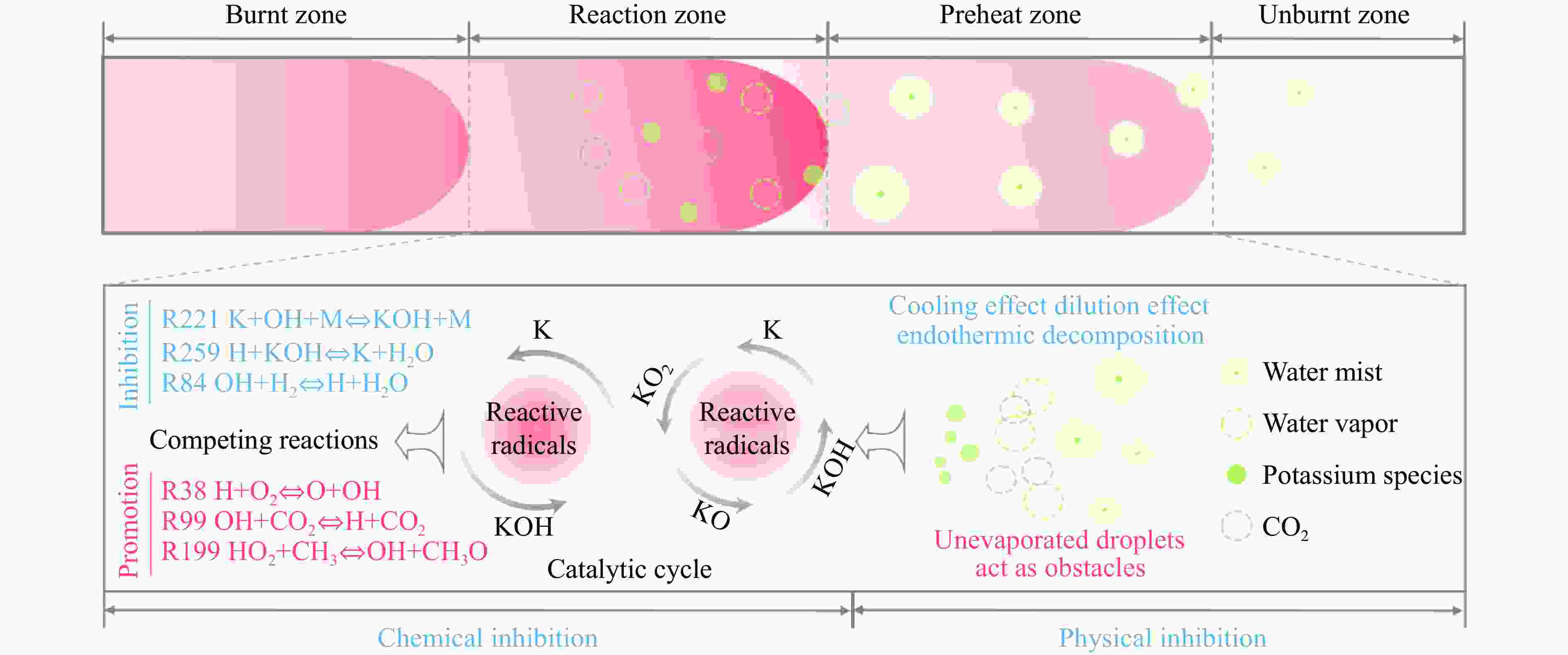 摘要: 甲烷-氢气混合气体的爆炸防控技术是保障氢能安全应用的重要课题。通过实验与数值模拟相结合的方法,系统研究了含KHCO3细水雾对甲烷-氢气预混爆燃的抑制机理。结果表明,含KHCO3细水雾对甲烷-氢气预混爆燃具有显著抑制效果,且抑制性能与KHCO3的质量分数呈正相关。以氢气体积分数为10%的混合气体为例,与对照组相比,KHCO3的质量分数为11%时,峰值压力和平均压力上升速率分别降低34.64%和44.57%,层流燃烧速度最高下降66.43%。KHCO3兼具物理与化学双重抑制效应:物理上,雾滴相变吸热和蒸气稀释效应降低火焰温度并稀释可燃物;化学上,KHCO3分解产生的钾化合物通过KOH→K→KOH重组循环消耗关键自由基(·H、·O、·OH),与链分支反应形成竞争,中断燃烧链式反应。此外,抑制过程是抑制与促进效应的竞争。高掺氢比和高KHCO3质量分数下,物理蒸发效率成为限制化学抑制作用的瓶颈,导致抑制效率出现饱和现象,但整体上仍表现出显著的抑制效果。Abstract: Explosion prevention and mitigation technologies for hydrogen-methane gas mixtures represent a critical research area for ensuring the safe application of hydrogen energy. This study systematically investigates the inhibition mechanism of potassium bicarbonate (KHCO3)-containing fine water mist on methane-hydrogen premixed deflagration using a combined approach of experiment and numerical simulation. The results indicate that KHCO3-containing fine water mist exhibits a significant inhibitory effect on methane-hydrogen premixed deflagration, with its suppression performance positively correlated to the KHCO3 mass fraction. Taking the condition of H2 volume fraction of 10% as an example, 11% KHCO3 addition resulted in reductions of the maximum explosion pressure and the average pressure rise rate by 34.64% and 44.57%, respectively. The laminar burning velocity was reduced by up to 66.43%. KHCO3 contributes to suppression through both physical and chemical mechanisms. Physically, droplet phase change (evaporation) absorbs heat and the generated steam dilutes the fuel mixture, thereby lowering the flame temperature and reducing reactant concentrations. Chemically, the decomposition of KHCO3 generates potassium compounds, which undergo the KOH→K→KOH recombination cycle to scavenge key radicals (·H, ·O, ·OH). This process competes with chain-branching reactions and interrupts the combustion chain reactions. Furthermore, the suppression process is governed by a competition between inhibitory and promotional effects. At high hydrogen blending ratios and high mass fractions of KHCO3, the physical evaporation efficiency becomes a bottleneck that constrains the chemical inhibition, leading to a saturation of the overall suppression efficiency. Nevertheless, a significant inhibitory effect is still maintained.