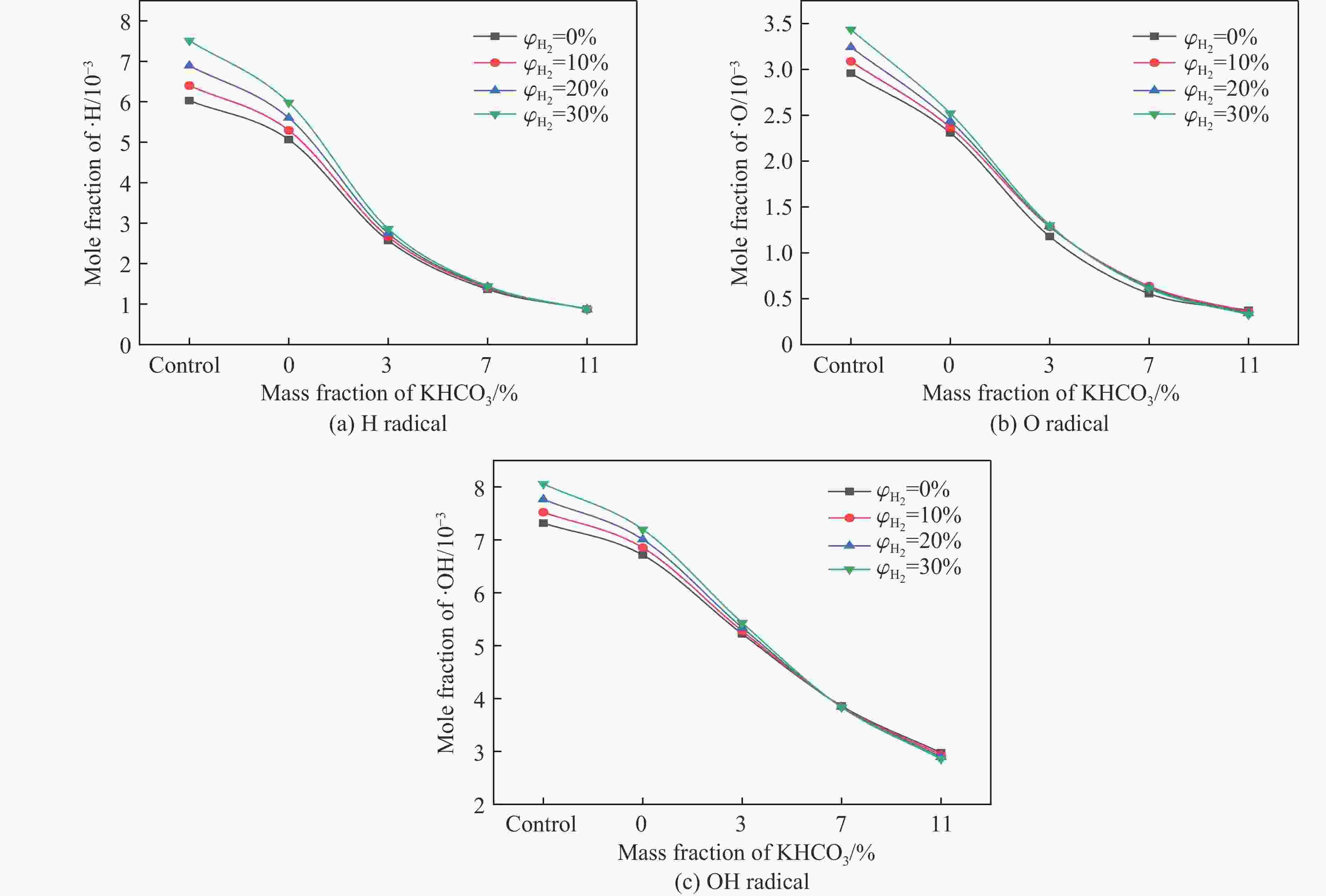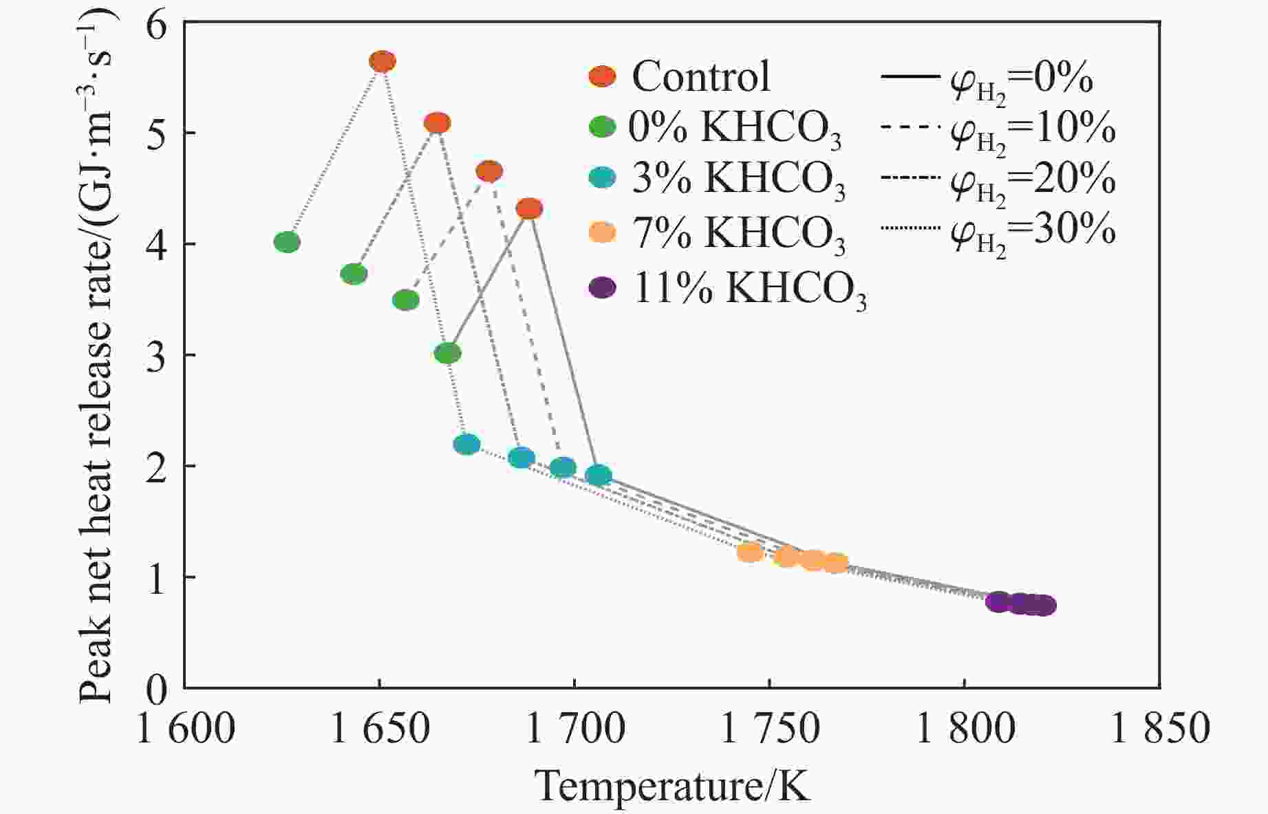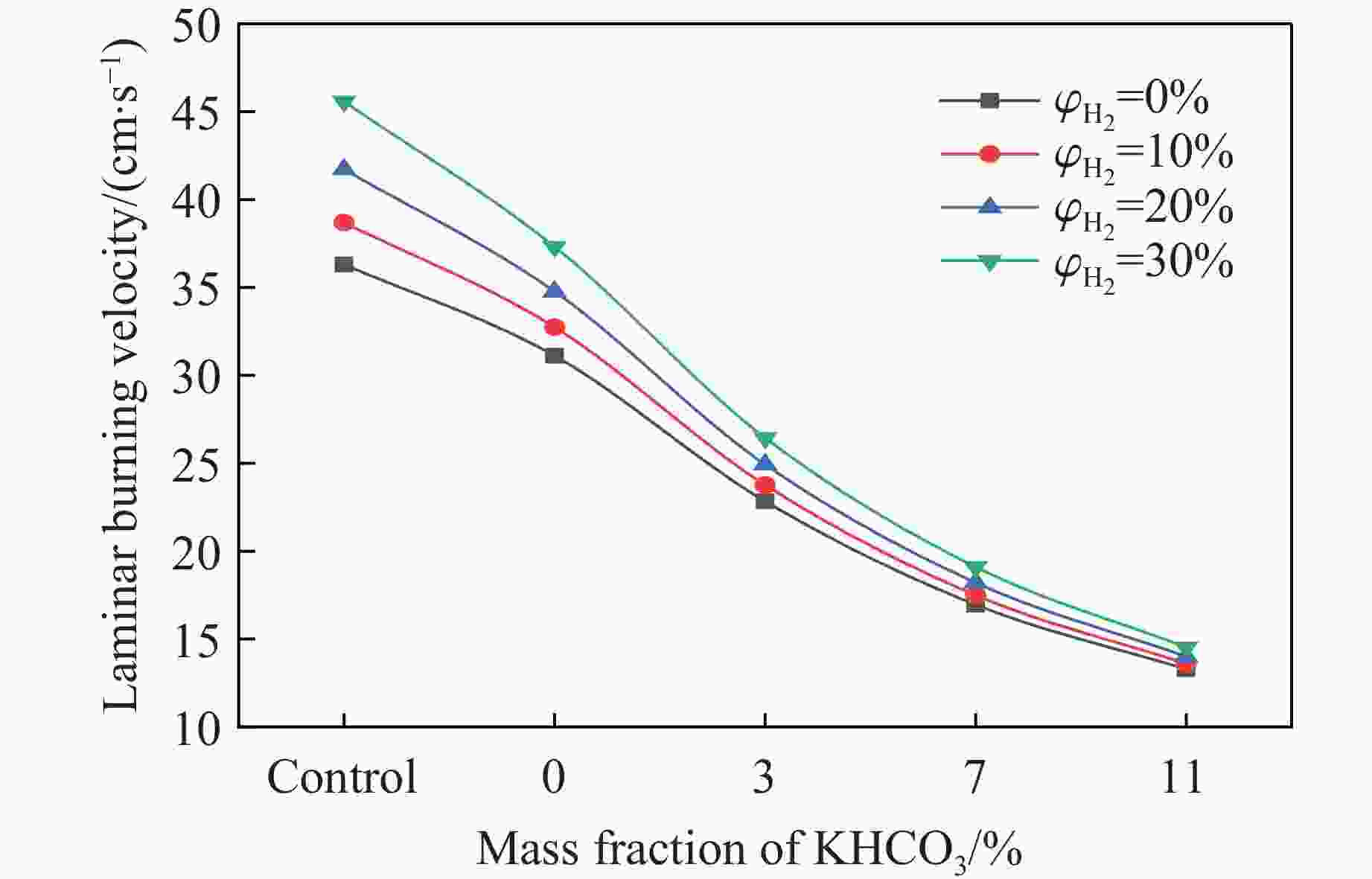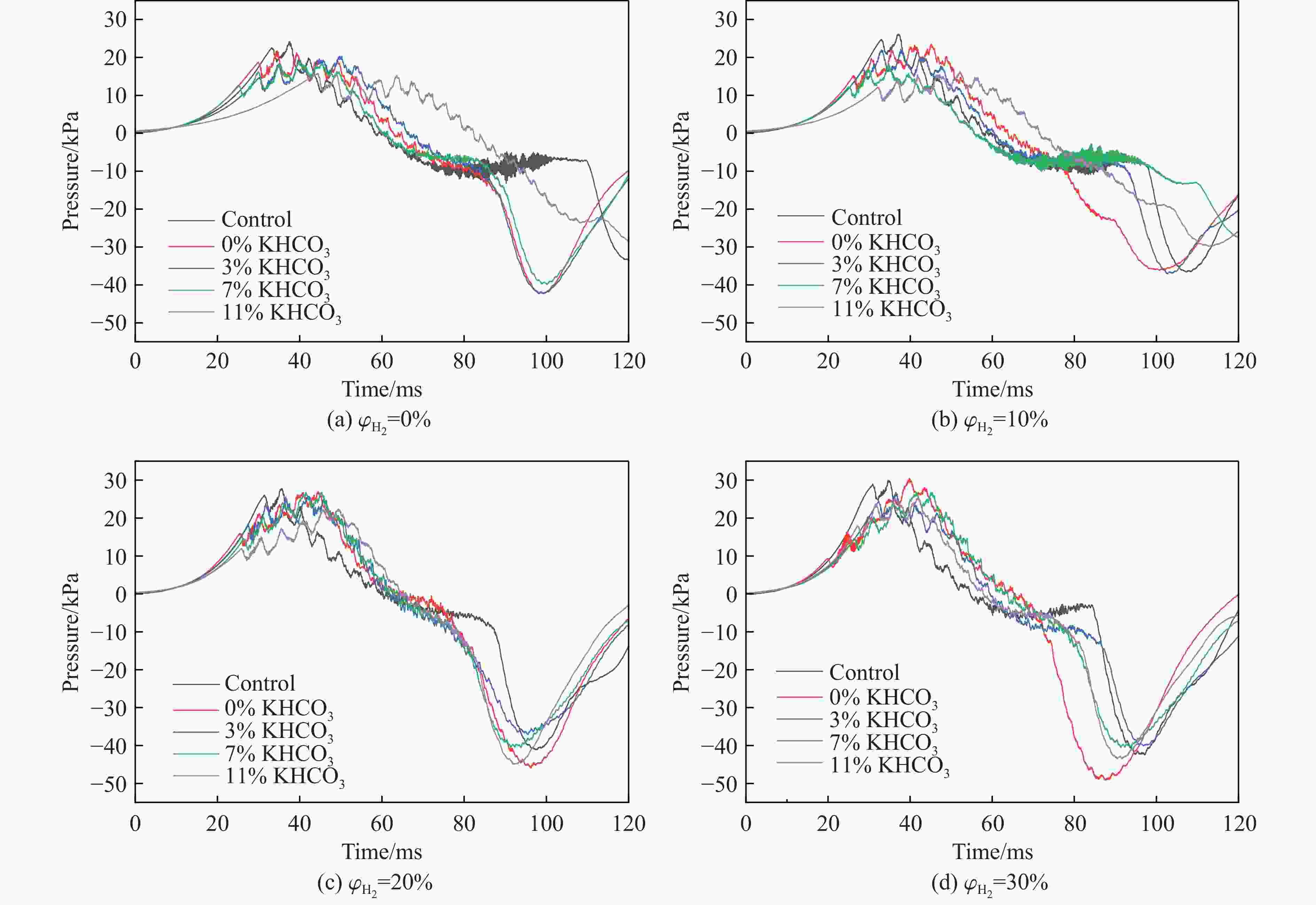 $ {\varphi}_{{{\mathrm{H}}_{2}}} $/% Mass fraction of KHCO3/% $ {t}_{{{\mathrm{p}}_{\max }}} $/ms pmax/kPa $ {(\mathrm{d}p/\mathrm{d}t)}_{\text{avg}} $/(MPa·s−1) 0 Control 37.62 24.13±0.84 0.64±0.03 0 34.54 21.74±0.61 0.63±0.03 3 49.80 20.34±0.92 0.41±0.02 7 39.90 18.71±0.41 0.47±0.02 11 44.36 15.77±0.63 0.36±0.01 10 Control 37.18 26.16±0.81 0.70±0.03 0 45.14 23.46±0.59 0.52±0.02 3 37.70 22.16±0.95 0.59±0.02 7 34.82 18.31±0.73 0.53±0.02 11 52.12 16.29±0.34 0.31±0.01 20 Control 35.54 27.75±0.83 0.78±0.03 0 44.48 26.95±1.12 0.61±0.03 3 42.02 25.74±0.62 0.61±0.02 7 41.50 26.79±1.23 0.65±0.02 11 49.42 22.40±0.72 0.45±0.02 30 Control 34.88 29.92±0.78 0.86±0.03 0 39.82 30.49±1.49 0.77±0.03 3 36.52 26.72±0.88 0.73±0.02 7 41.50 26.79±0.75 0.65±0.03 11 41.84 25.36±1.07 0.61±0.02 -