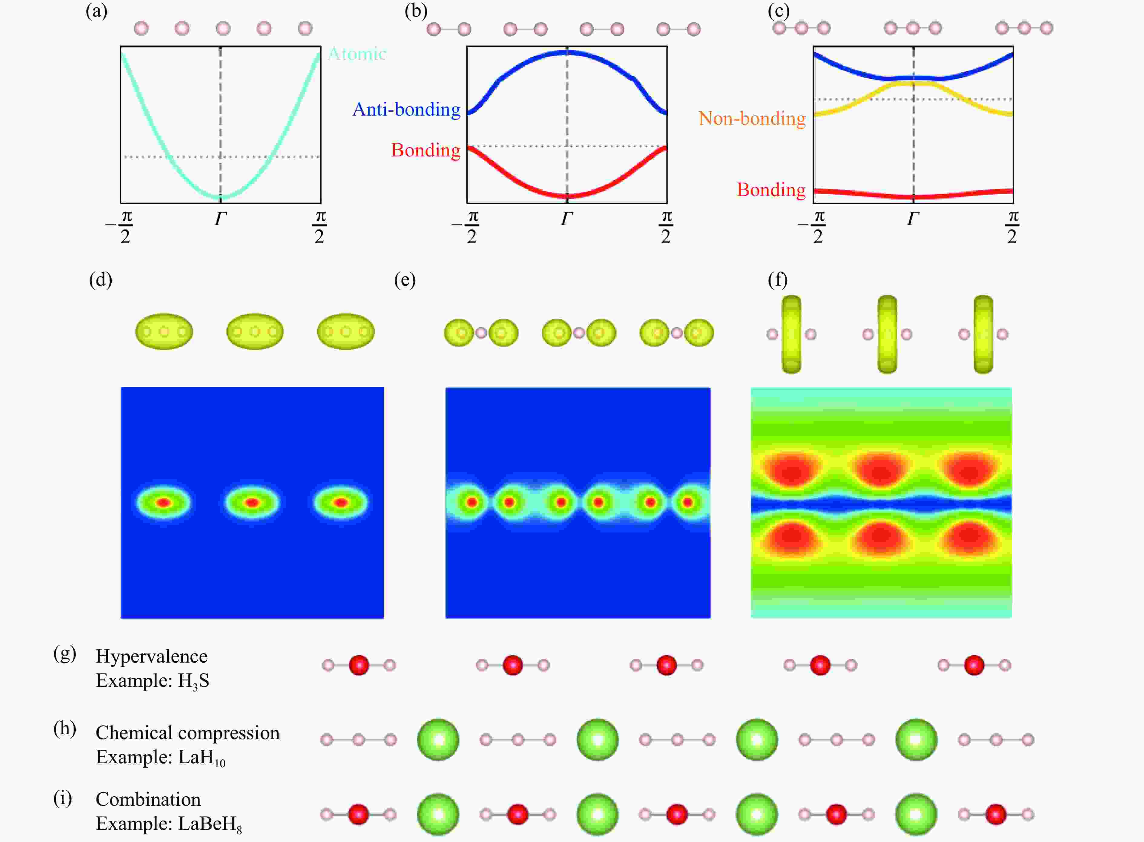 Figure  1.  Atomized, dimerized, and trimerized one-dimensional infinite hydrogen-atom-chain models: crystal structure and electronic structure of (a) atomized, (b) dimerized, and (c) trimerized one-dimensional hydrogen atom chains; electron density of (d) bonding orbitals, (e) non-bonding orbitals, and (f) anti-bonding orbitals of trimerized one-dimensional hydrogen atom chain; the pathways for reducing the stability pressure of metallic hydrogen of one-dimensional atomic chains in (g) three-center one-dimensional hypervalent hydride chain, (h) one-dimensional trimerized hydrogen atom group compressed by cations, and (i) three-center one-dimensional hypervalent hydride chain compressed by cations