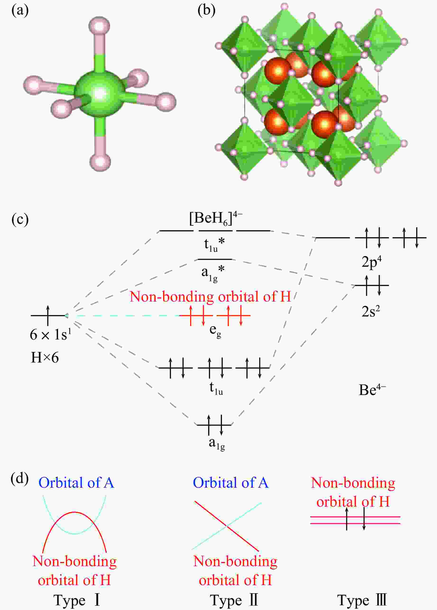 Figure  2.  Crystals and orbitals of the hydrogen ligand compound Mg2BeH6 and potential topological electronic structures[2829]: (a) structure of BeH6 group; (b) structure of Mg2BeH6 hydride; (c) orbital analysis of the BeH6 group; (d) potential electronic topology of the hydride isostructural to Mg2BeH6