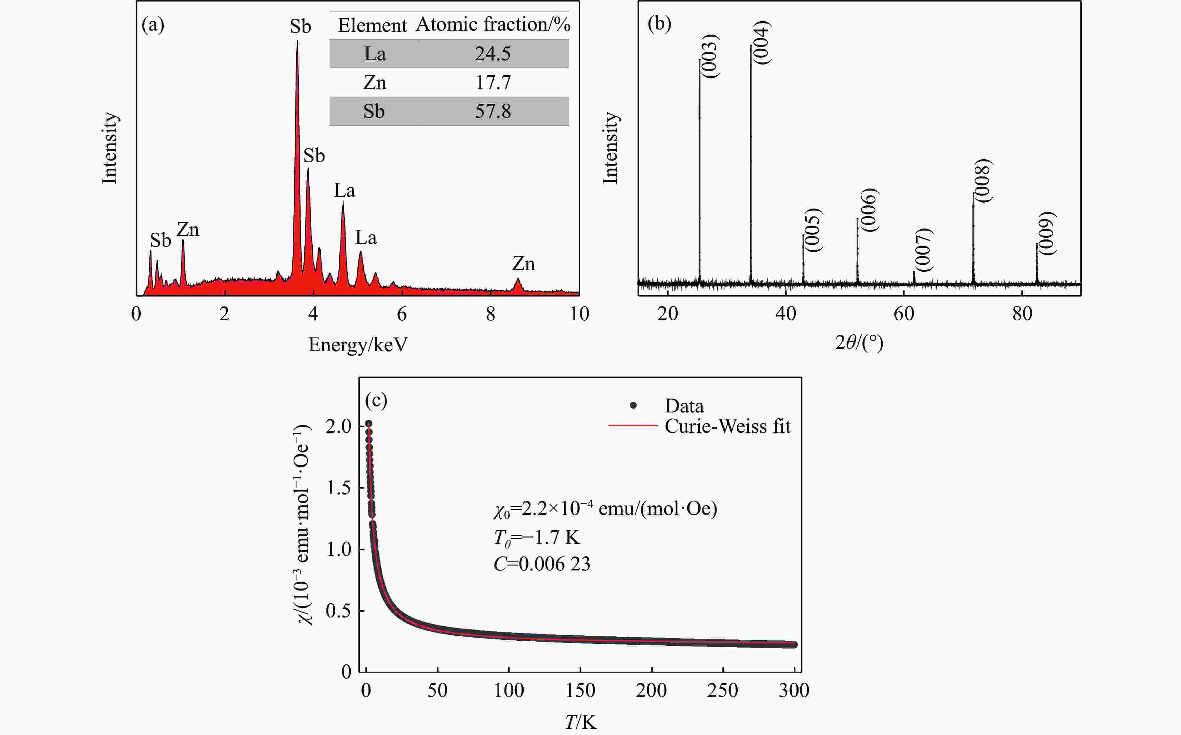 Figure 3. (a) Typical EDS of LaZn1–δSb2 (Inset shows the atomic concentration of different elements.); (b) XRD pattern of the single crystal, showing that the largest natural face is ab-plane; (c) temperature dependence of magnetic susceptibility (χ-T) curve measured with an external field of 1 T (The solid red line is the Curie-Weiss fitting line.)