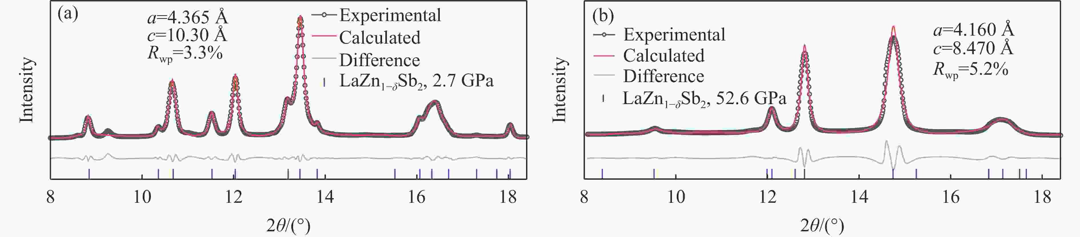 摘要: 在新超导材料的探索中,某些特定的结构单元被认为对超导的产生至关重要,如铜氧和铁基高温超导体中的CuO2面和Fe-As层等。为此,研究了具有Zn-Sb层的锌基112型LaZn1–δSb2在常压和高压下的结构和输运性质。研究发现:LaZn1–δSb2在常压下具有四方结构,并存在一定的Zn空位;其低温物理性质表现出顺磁金属行为,具有一定的各向异性和正磁阻现象;同时,空穴型霍尔系数随温度变化明显,表明该材料的输运行为由多带效应主导。在高压下,LaZn1–δSb2依然维持四方结构,但是体积被压缩超过25%;与此同时,高压下的绝对电阻值以及剩余电阻比均随压力的升高先减小后增大。进一步拟合发现,压力下LaZn1–δSb2的输运行为依然由电子-声子散射主导,且几乎不随压力变化。在所测试的最高达50.9 GPa的压力下,没有观测到2 K以上的超导现象;LaZn1–δSb2中超导电性的缺失可能与Zn空位导致的晶格缺陷有关。该研究结果可为探索同类结构化合物中的新型超导电性提供有意义的参考。