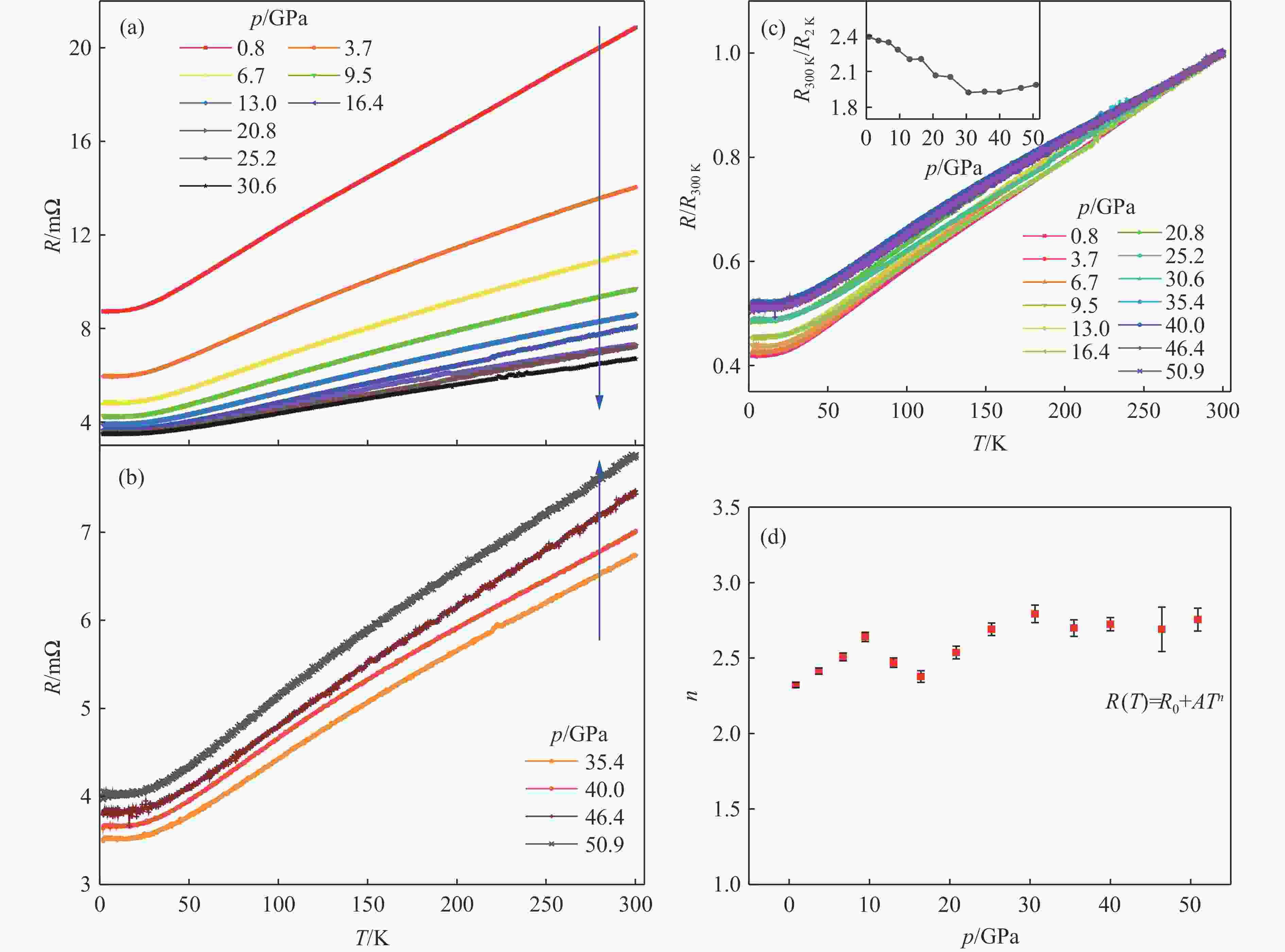 图 7 (a)~(b) 最高至50.9 GPa时不同压力下LaZn1–δSb2的电阻-温度(R-T)依赖关系曲线,(c) 不同压力下 LaZn1–δSb2的归一化电阻-温度(R/R300 K-T)曲线(插图为 LaZn1–δSb2的R300 K/R2 K随压力的变化曲线),(d) 温度项的幂指数n随压力的演变规律(采用$ R \left(T\right)={R }_{0}+A{T}^{n} $对 2~50 K 温度区间内不同压力下的R-T 曲线进行拟合的结果)