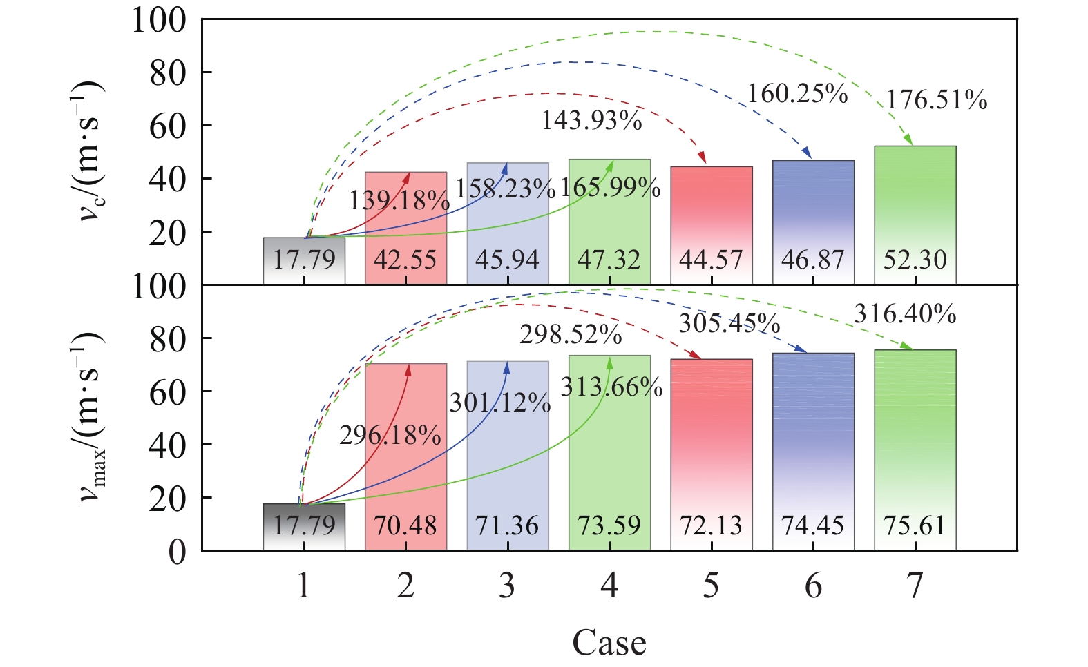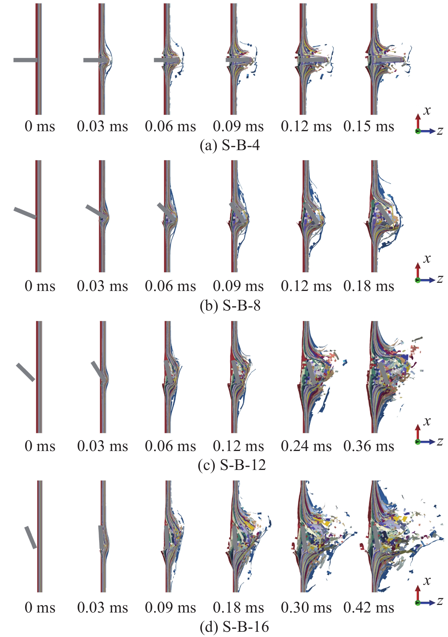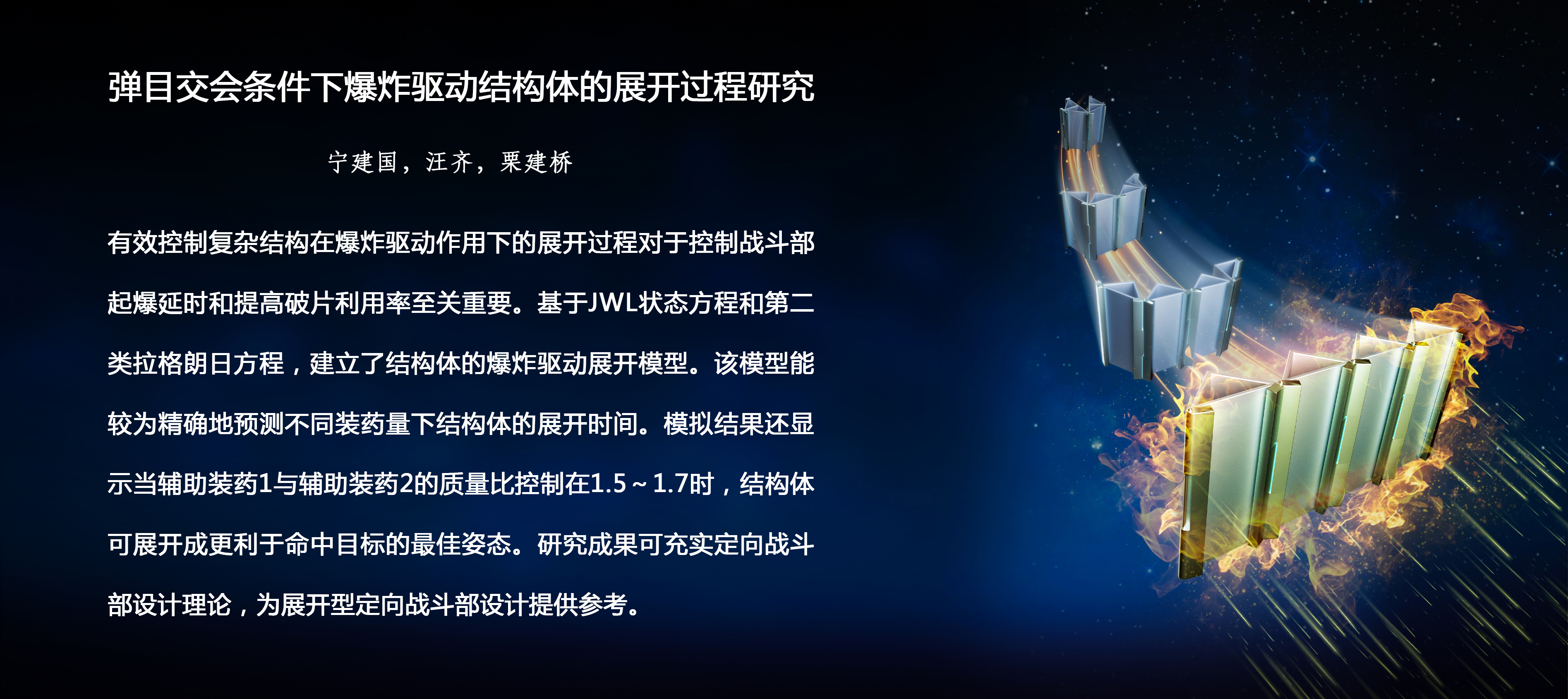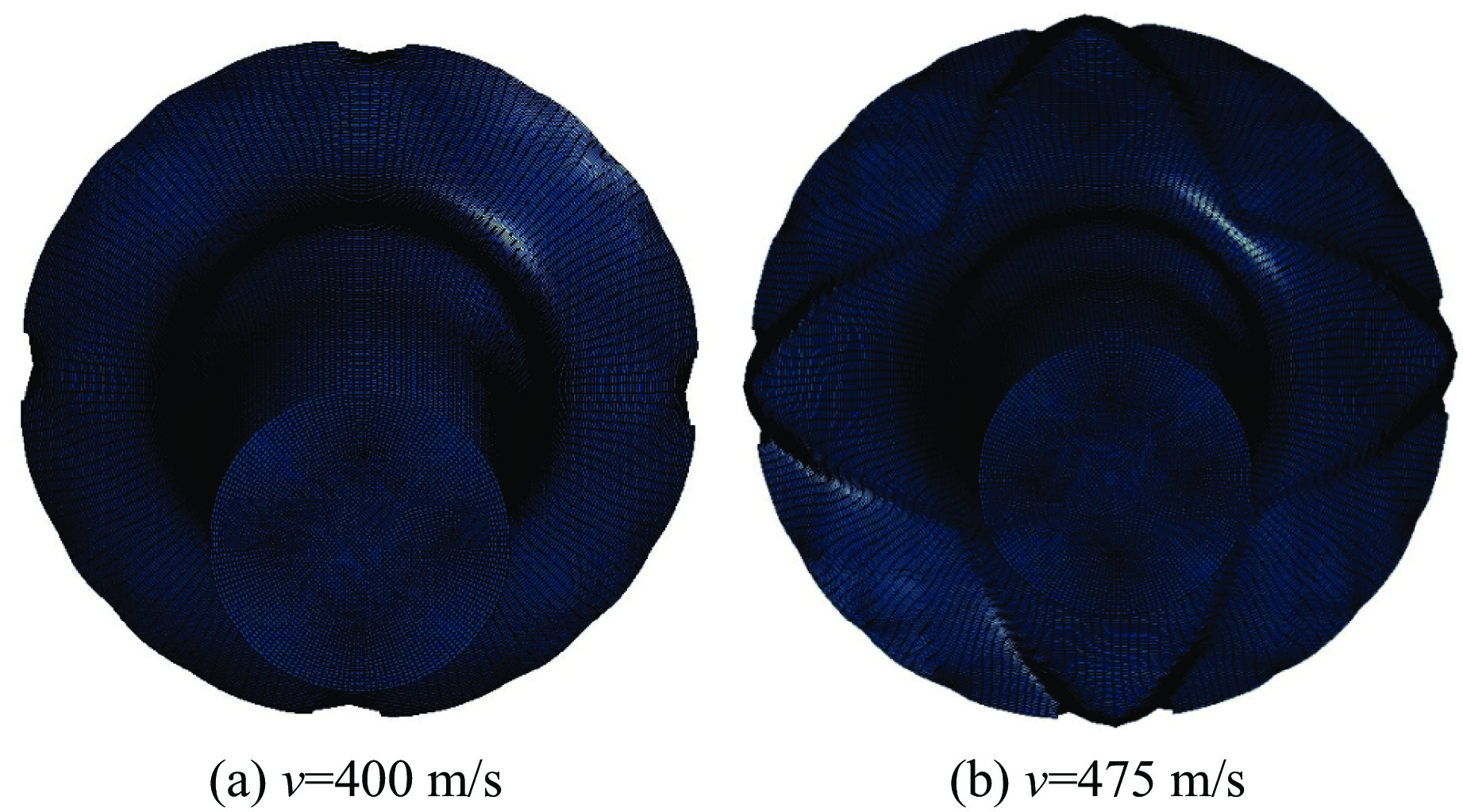 为探究隔板在小口径聚能装药中的作用,开展隔板参数与中心通孔药型罩匹配对爆轰产物泄露以及射流侵彻性能的影响规律研究。基于爆轰波正规斜反射理论,推导了药型罩表面不同位置处爆轰波初始入射角和所受压力与隔板参数之间的定量关系式。采用LS-DYNA软件,系统分析了隔板直径、高度对射流成型和侵彻性能的影响规律。结果表明:在通孔药型罩中添加隔板能有效提高药型罩上的压垮压力,抑制爆轰产物泄漏,提高能量利用效率和射流侵彻性能;射流侵彻能力随隔板直径增大呈现先增后减的变化趋势;隔板高度对射流性能的影响呈多极值响应;当隔板直径为6 mm且隔板高度为4 mm时,对45钢靶的侵彻深度达到较大值,为158.17 mm,较无隔板结构,提升了17.21%。研究结果可为小口径聚能战斗部设计提供参考。