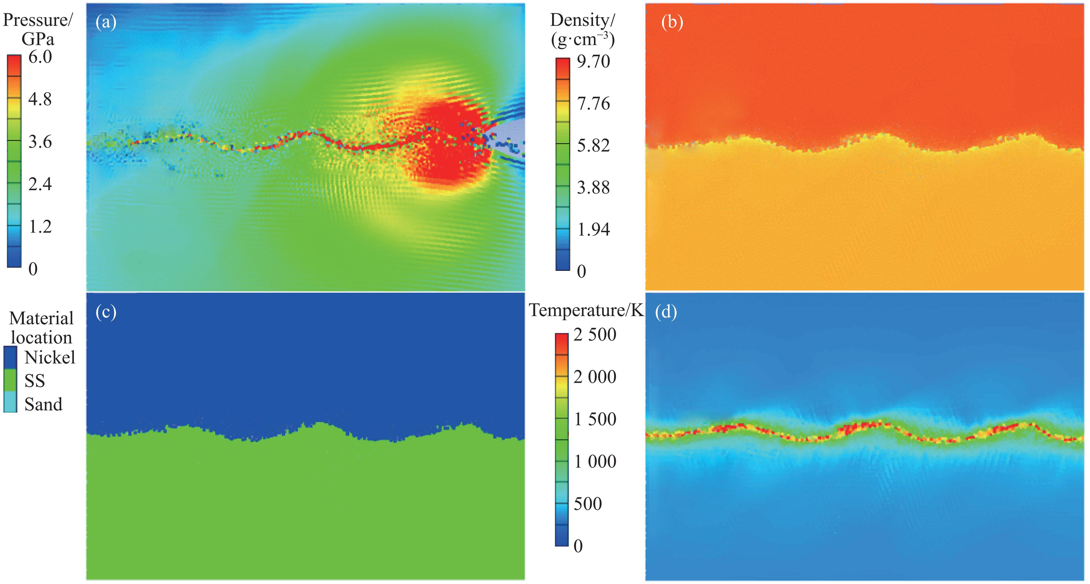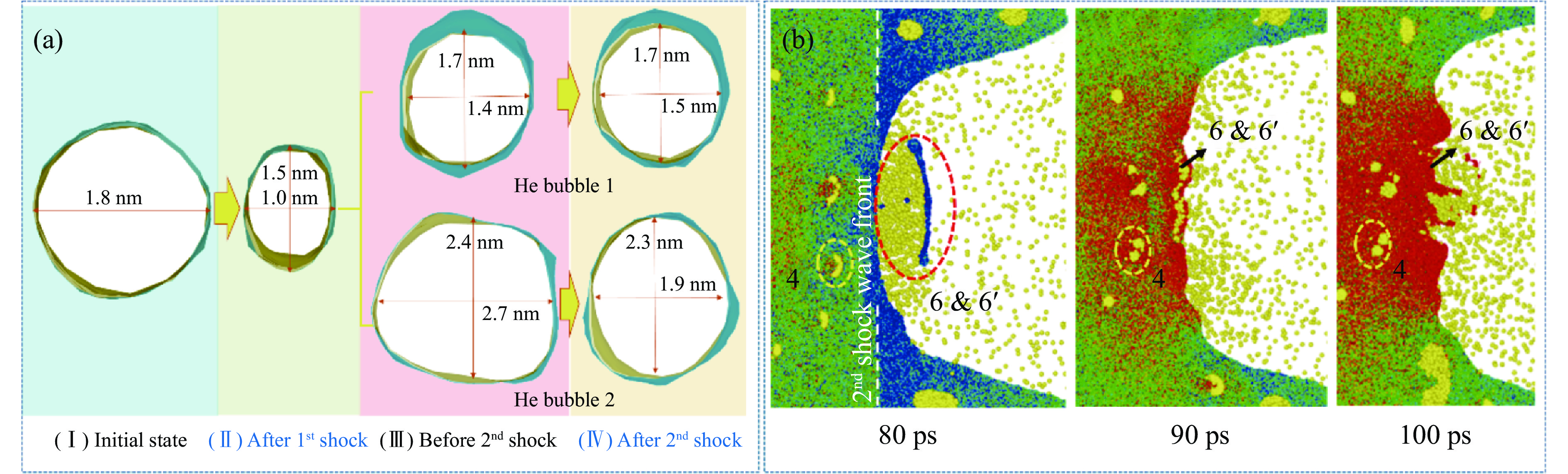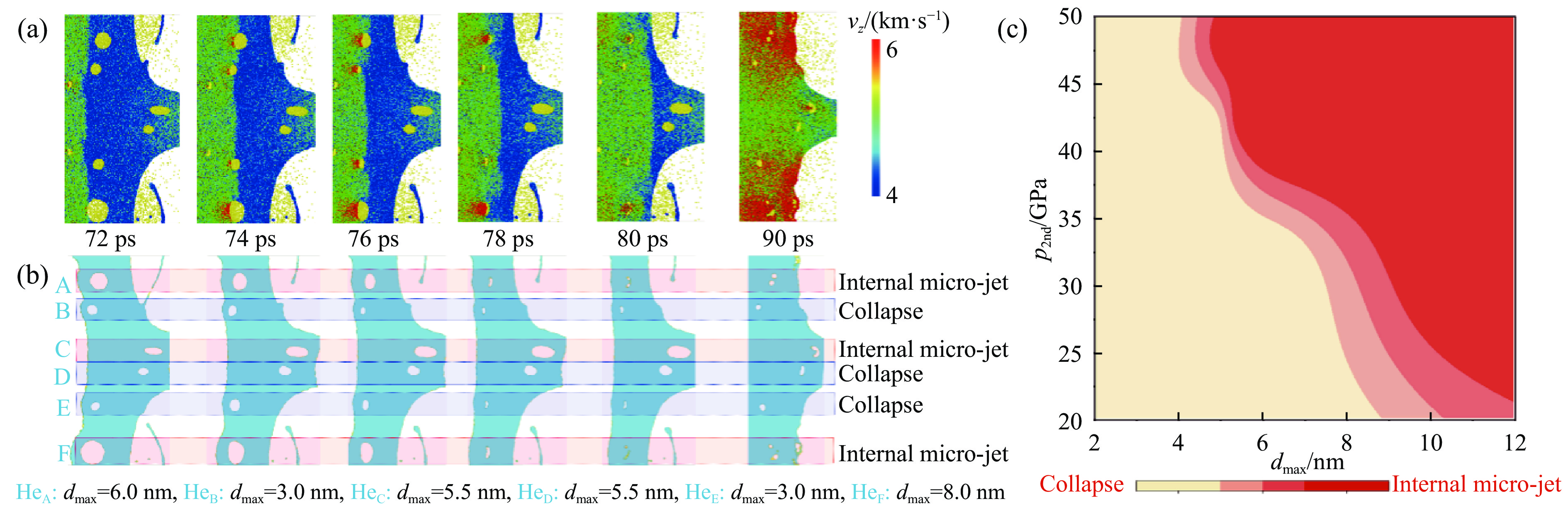 采用分子动力学方法,研究了含氦泡铜在两次稳态波加卸载作用下的微射流增长与损伤演化过程,对比了含氦泡与不含氦泡金属的损伤特征、激活应力阈值、微射流形态和速度分布以及不同区域氦泡的变形特征。结果表明:二次冲击后,氦泡膨胀的临界激活应力阈值低于孔洞形核的应力阈值,且与氦泡分布及氦泡数密度密切相关。低压首次冲击下,含氦泡金属比纯金属形成更显著的微射流;二次冲击下,氦泡使微射流更易断裂,且微射流头部最大速度更高,但微射流主体速度分布相当。二次冲击波对于已经经过首次冲击压缩、由于稀疏波作用发生轻微回弹但未恢复至初始状态的体氦泡几乎不起作用。二次冲击后,近表面已破裂飞出的氦泡壁也可能贴回气泡底部,使得部分氦原子被再次封存。二次冲击卸载后,被封存的氦泡会再次发生膨胀破裂,释放氦原子。在二次冲击作用下,氦泡塌缩机制与氦泡尺寸及冲击强度紧密关联。研究结果将为后续的辐照氦泡对金属微喷-微层裂耦合演化影响的跨尺度理论研究提供物理认识和理论依据。