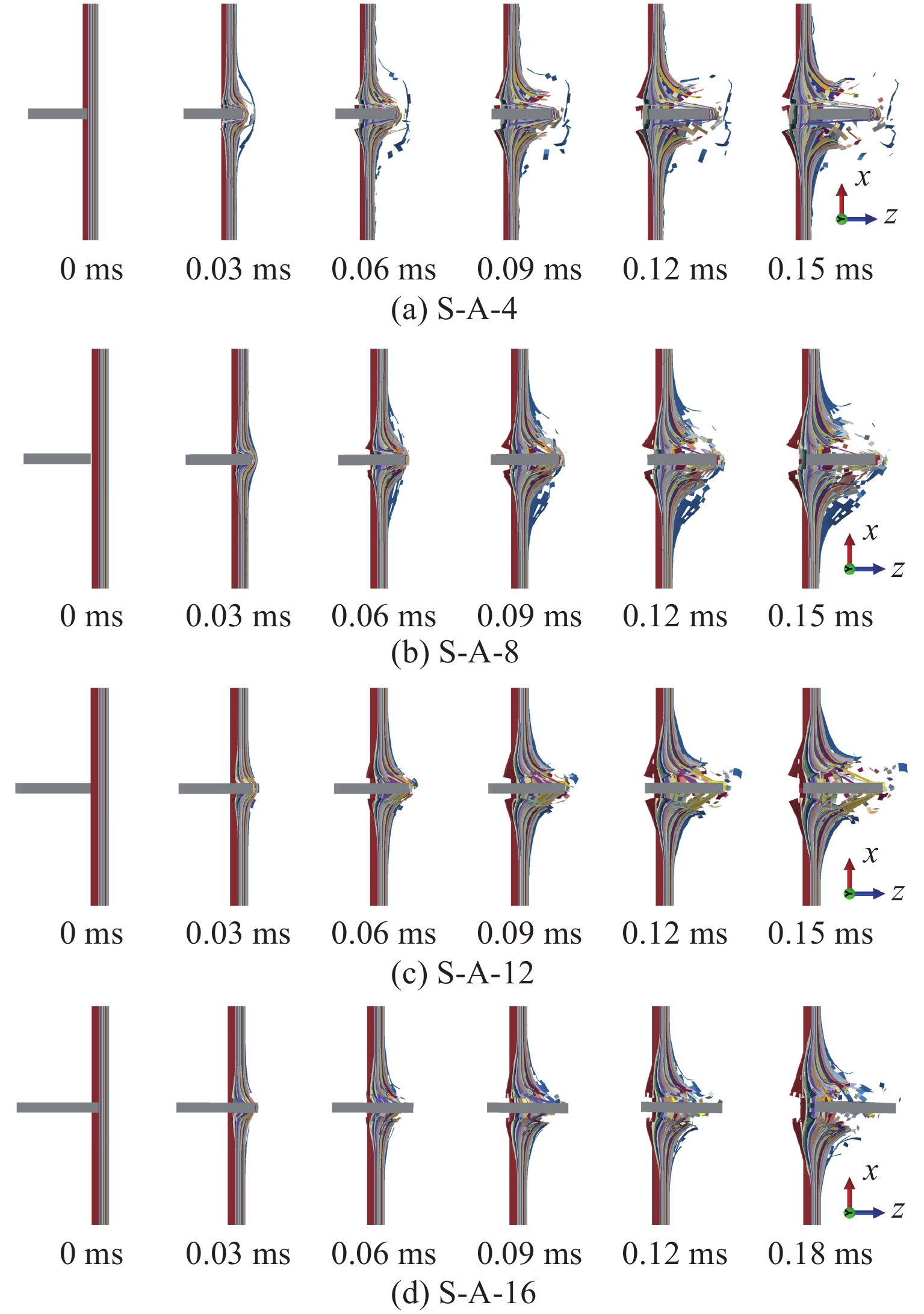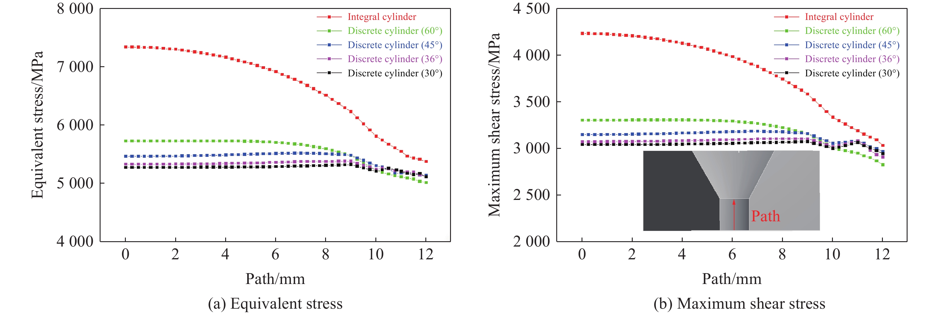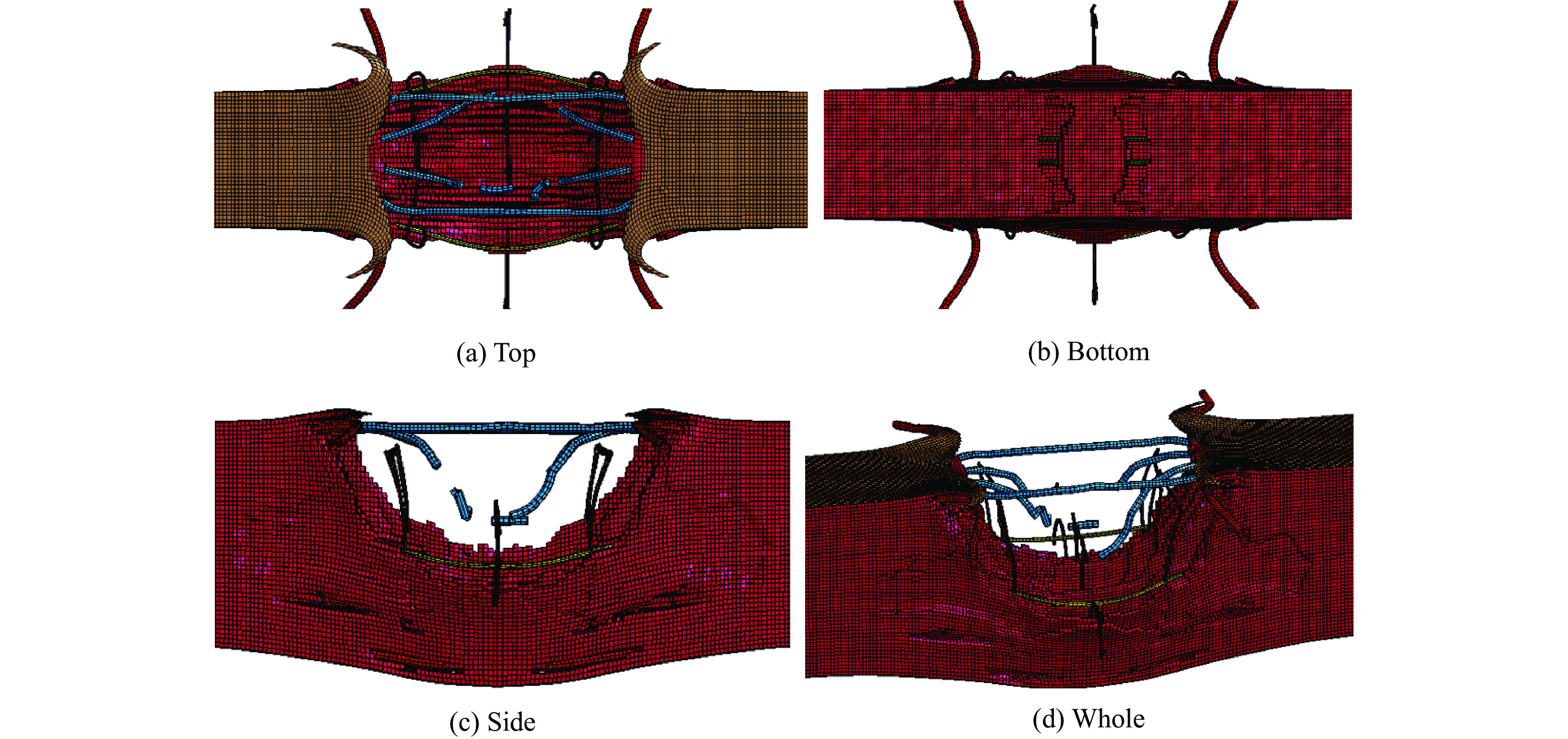 为了研究鱼雷制导头段结构对水下聚能战斗部毁伤威力的影响,采用AUTODYN有限元分析软件,对聚能侵彻体受不同模拟头段结构影响下的毁伤性能进行了数值仿真,分析了不同模拟头段结构下冲击波绕射、靶后载荷传播和毁伤靶板的全过程。研究表明:侵彻体头部速度和后效靶扩孔半径随模拟头段总长度和模拟头段层数增大而整体呈上升趋势;在一定范围内,增加模拟头段层数可以有效地优化爆炸成型弹丸(explosively formed projectile,EFP)的成型形态,从而提升其后续侵彻能力;在不同模拟头段总长度条件下,存在一个最佳总长度使侵彻体保持较高头部速度的同时不发生颈缩断裂。