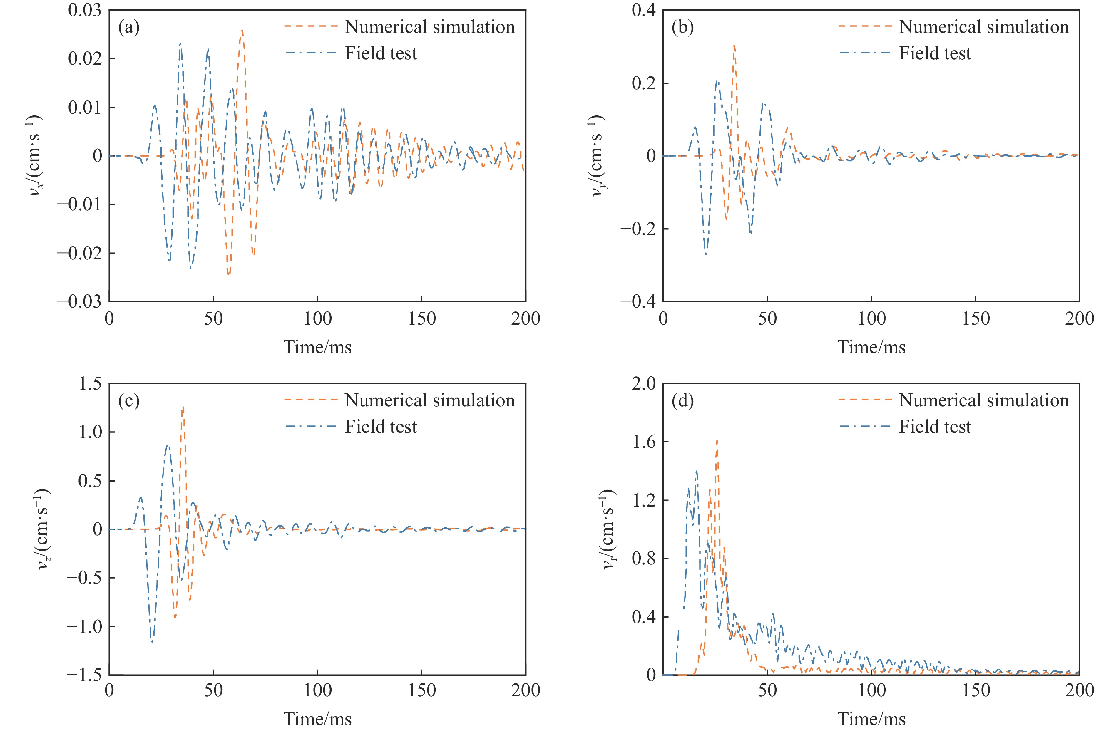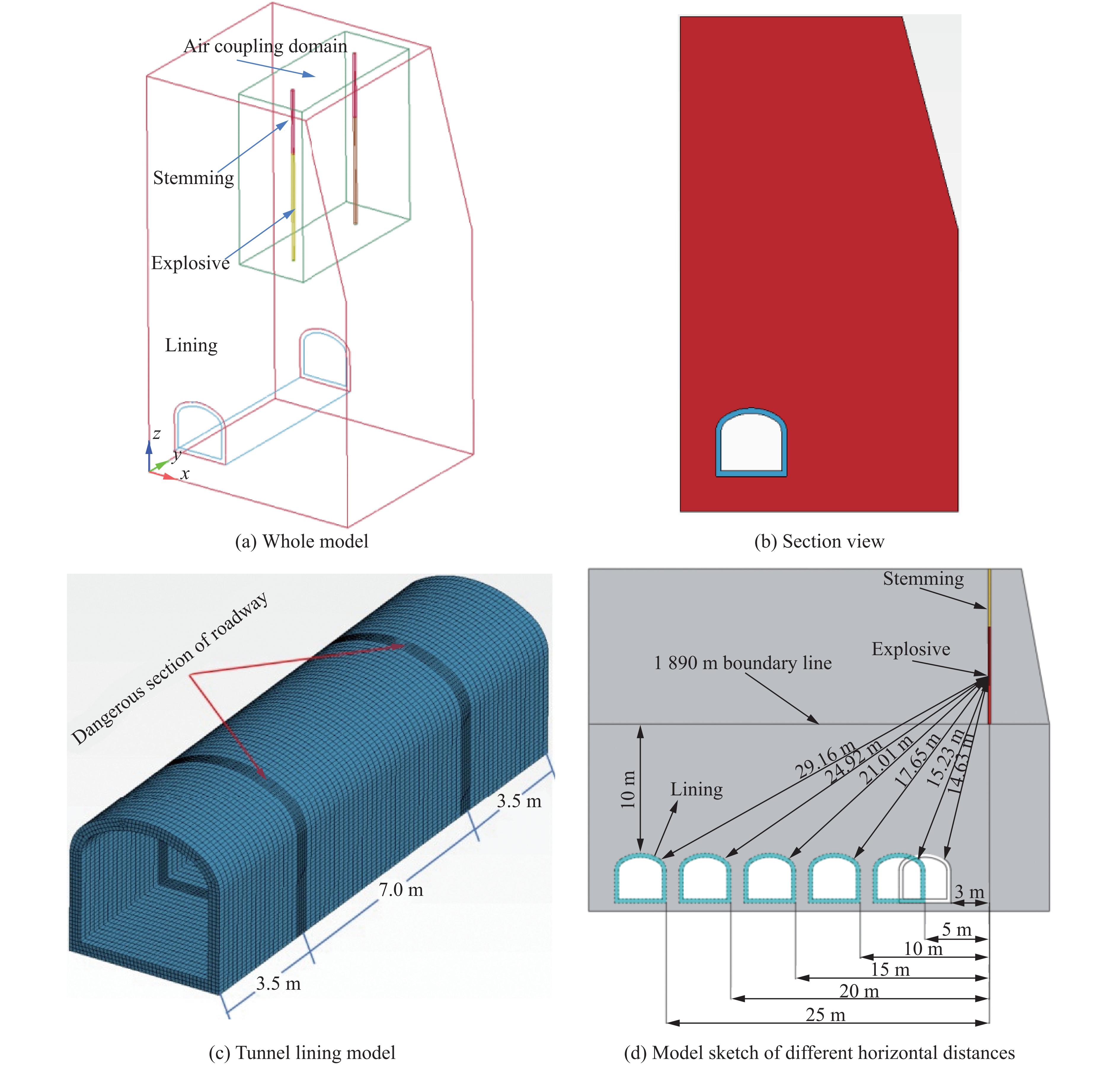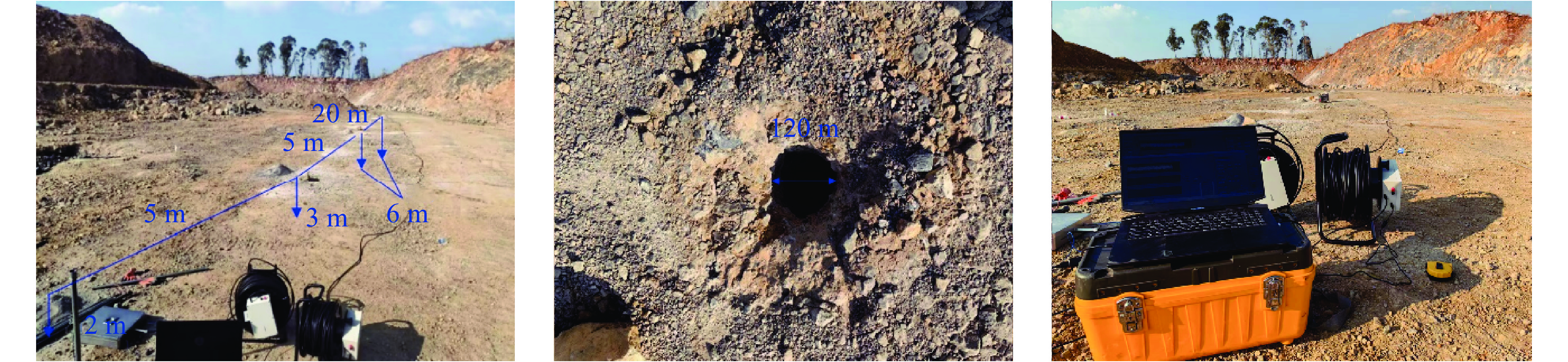在露天爆破中,最小抵抗线决定了爆破能量释放的主导方向和岩石运动速度的方向,是控制爆破作用范围、岩石破碎效果及抛掷路径的核心因素。基于DEM-PBM(discrete element method-population balance model)耦合的爆破漏斗数值模拟方法,通过多尺度建模与试验数据协同分析,结合现场爆破漏斗试验,对不同最小抵抗线下爆破漏斗破岩规律进行了研究,以优化爆破参数,提高爆破效率和安全性。数值模拟结果表明:当抵抗线长度为1.05 m时,20 ms时的爆破扩腔面积比5 ms时增长70.33%;当抵抗线长度为1.85 m时,爆破扩腔面积增长11.42%。对比不同抵抗线下破碎块度的抛掷作用效果,当抵抗线长度为1.05 m时,抛掷效果最佳。现场爆破漏斗试验结果显示:当抵抗线长度增大时,爆破漏斗体积变小;当抵抗线长度为1.05 m时,爆破漏斗体积最大,与数值模拟得到的爆破扩腔规律相似。现场爆破块度尺寸分形规律分析结果表明,当抵抗线长度为1.05 m、炮孔深度为1.2 m时,抛掷岩石块体较多,块度分布适中,破碎块体抛掷作用效果最佳。研究结果可为现场钻爆参数优化提供一定参考。