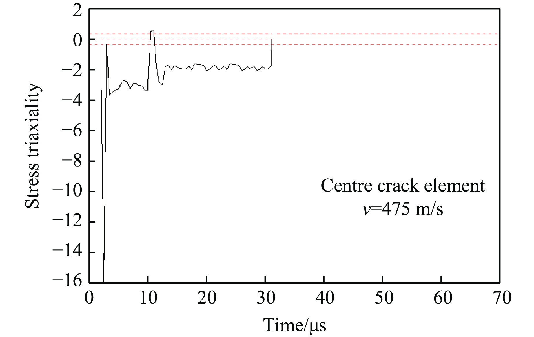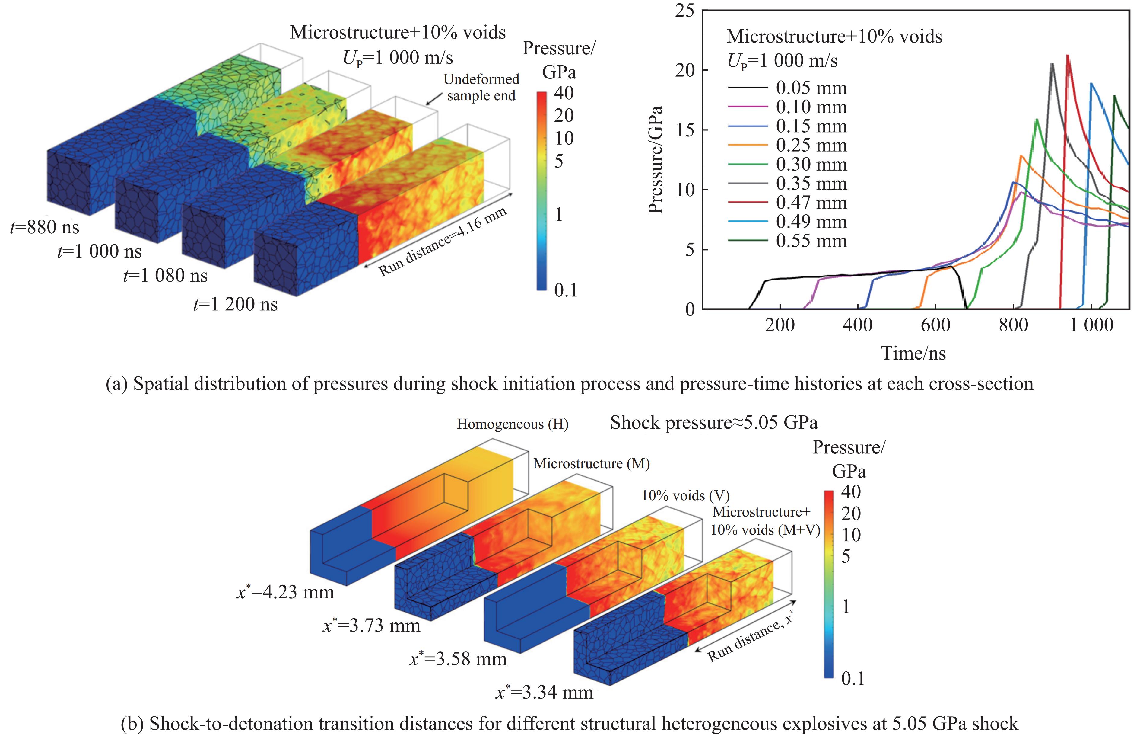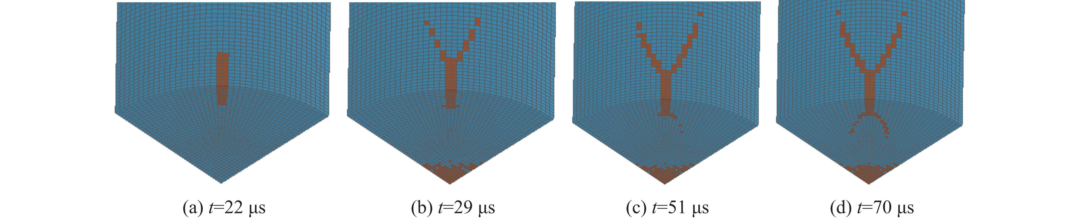 为探究裂纹及其间隙对2,4-二硝基苯甲醚(DNAN)基含铝炸药机械热点形成后反应传播特性的影响规律,制备了含不同初始裂纹的炸药药柱,采用基于发射药燃烧加载方式的炸药点火试验装置,模拟了炸药的反应传播过程,获取了加载过程和炸药反应过程的压力变化曲线以及试验后的炸药形貌特征,结合数值仿真,分析了不同预制裂纹的炸药药柱在相同药量发射药燃烧加载下的应力场分布特征。结果表明:无裂纹或无间隙“一”字裂纹工况下,药柱残骸完整,加载压力峰后迅速下降,未发生反应,热点区域位于底部;含1 mm间隙裂纹工况下,药柱发生断裂并出现局部低速反应,压力衰减过程缓慢。其中“一”字裂纹的热点区域转移至侧表面,而“十”字裂纹形成侧表面与底部的双重热点区域,反应程度进一步提升。这表明预制裂纹通过改变应力分布和扩展热点区域,进而显著影响炸药的反应进程。