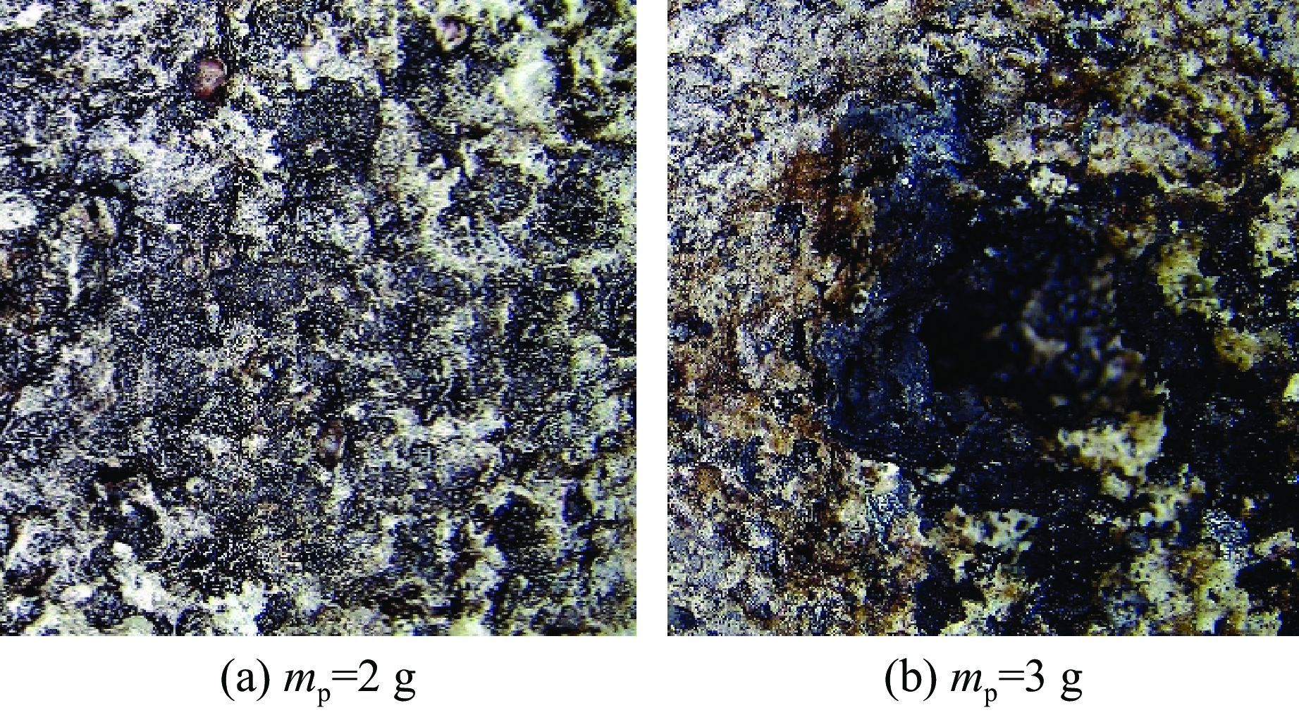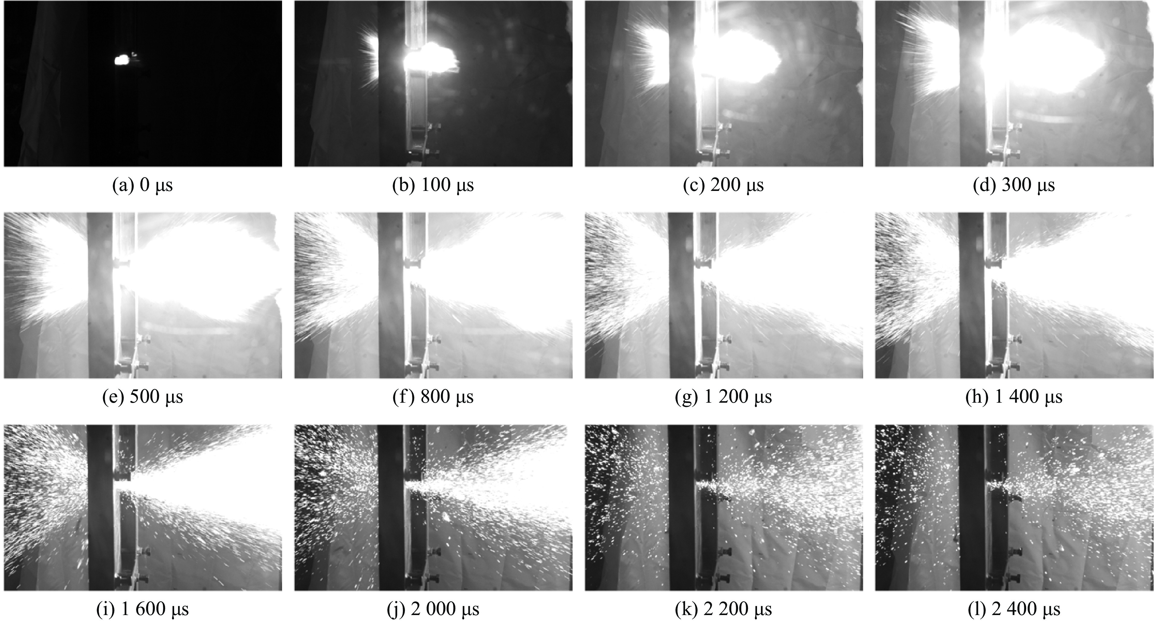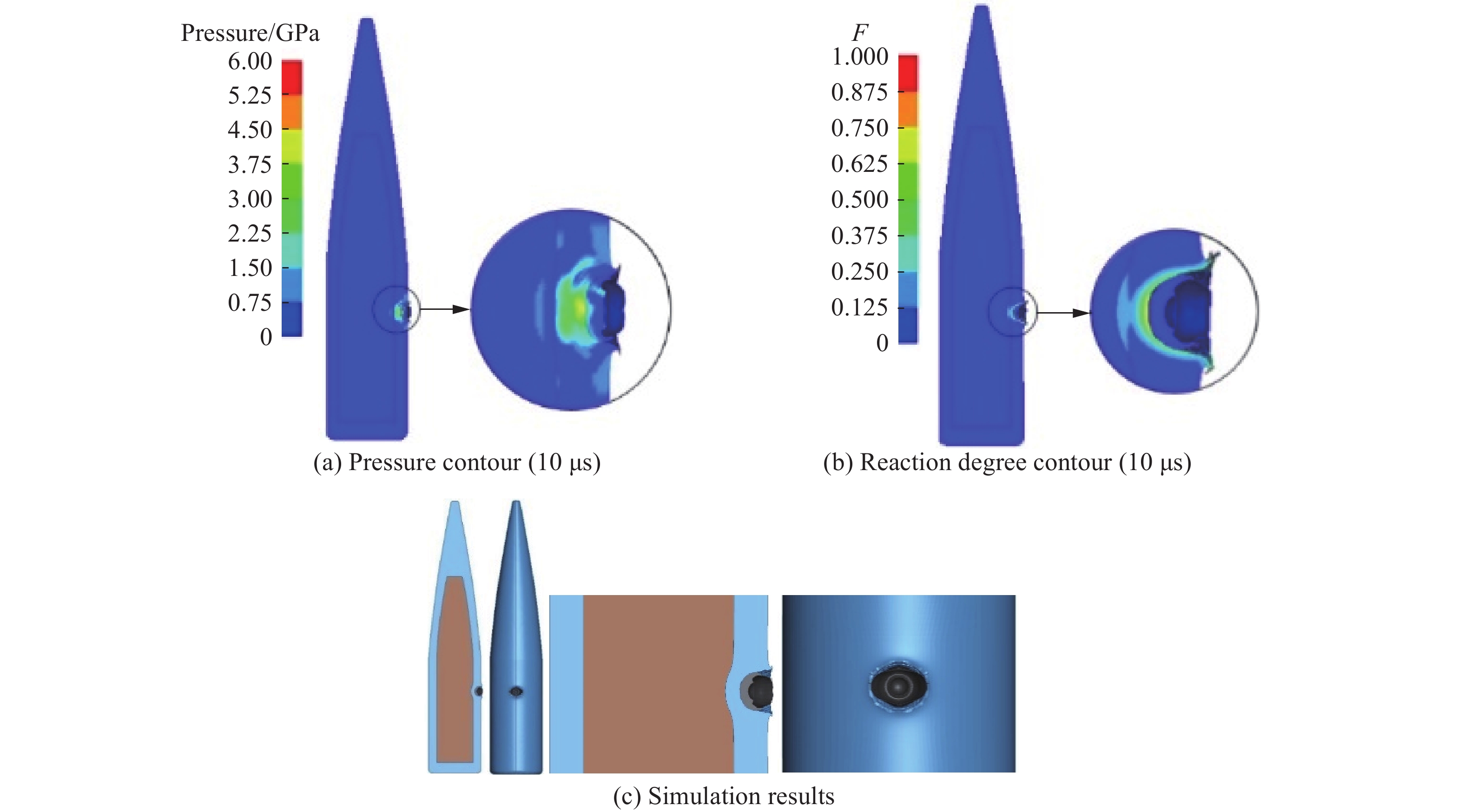 为探究裂纹及其间隙对2,4-二硝基苯甲醚(DNAN)基含铝炸药机械热点形成后反应传播特性的影响规律,制备了含不同初始裂纹的炸药药柱,采用基于发射药燃烧加载方式的炸药点火试验装置,模拟了炸药的反应传播过程,获取了加载过程和炸药反应过程的压力变化曲线以及试验后的炸药形貌特征,结合数值仿真,分析了不同预制裂纹的炸药药柱在相同药量发射药燃烧加载下的应力场分布特征。结果表明:无裂纹或无间隙“一”字裂纹工况下,药柱残骸完整,加载压力峰后迅速下降,未发生反应,热点区域位于底部;含1 mm间隙裂纹工况下,药柱发生断裂并出现局部低速反应,压力衰减过程缓慢。其中“一”字裂纹的热点区域转移至侧表面,而“十”字裂纹形成侧表面与底部的双重热点区域,反应程度进一步提升。这表明预制裂纹通过改变应力分布和扩展热点区域,进而显著影响炸药的反应进程。
