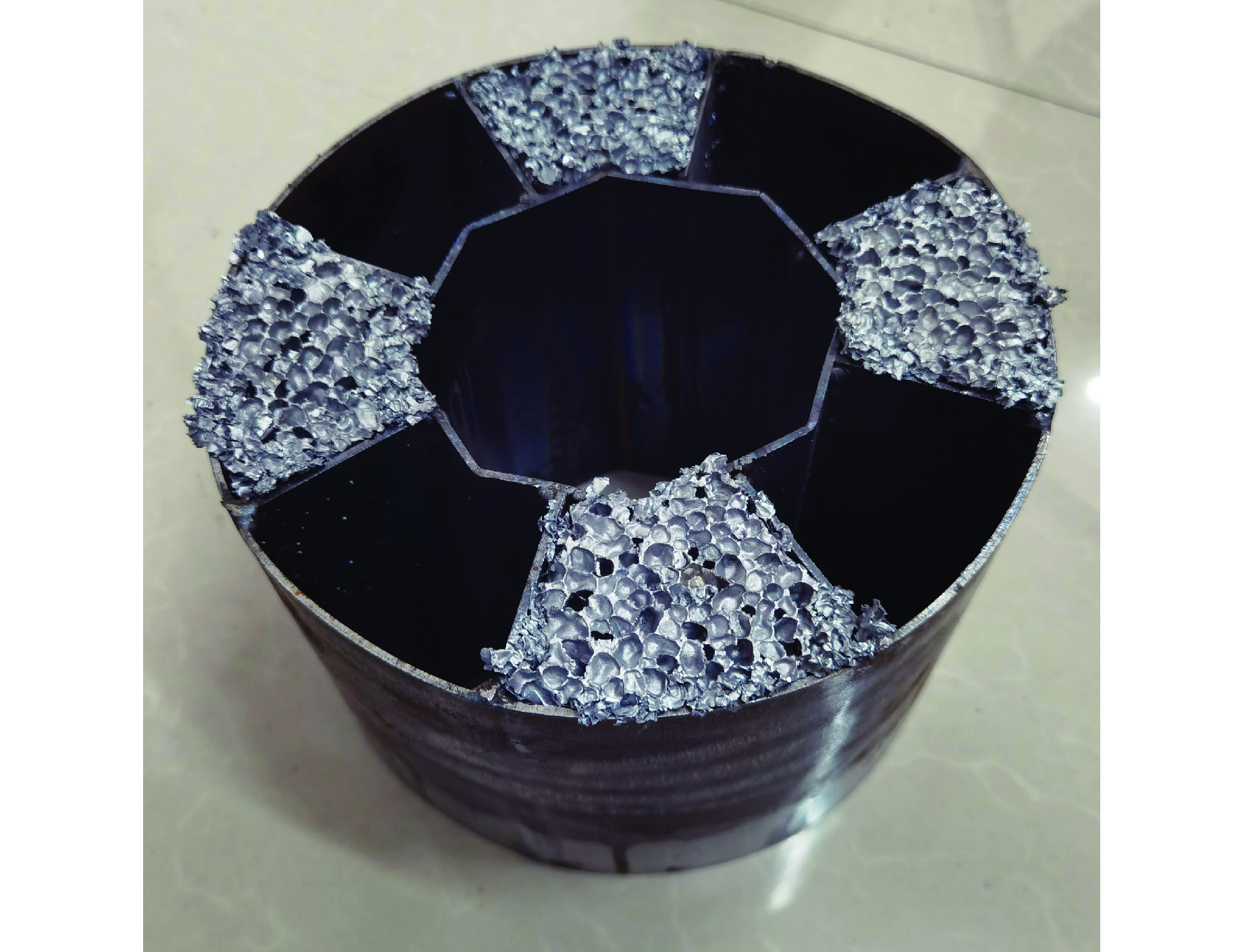 针对深层/超深层油气勘探对高性能聚晶金刚石复合片(polycrystalline diamond compact,PDC)齿的迫切需求,通过正交试验法优化PDC齿的合成配方,在高压烧结(8.5 GPa,1750 ℃)条件下,成功制备出传统均匀混合型PDC齿(H-PDC)以及具有“细晶工作层/粗晶过渡层”梯度结构型PDC齿(G-PDC)。梯度结构有助于促进钴烧结助剂的均匀分布,抑制钴的聚集,增强层间的界面结合,并产生较高的残余压应力。G-PDC工作层的钴含量为9.16 wt.%,经酸浸脱钴后,钴含量降低至2.49 wt.%。性能测试表明:G-PDC的耐磨寿命达到920 车磨次数(passes),优于H-PDC(800 passes);G-PDC的平均冲击能为740 J,较H-PDC提升约107%;同时,梯度结构缓解了PDC齿的热失配问题,使热稳定温度提高约30 ℃。实验结果表明,高压烧结与梯度结构设计的协同作用会显著提升PDC齿的耐磨性、冲击韧性及热稳定性。研究结果为面向极端工况的下一代超硬复合材料开发提供了可行路径。