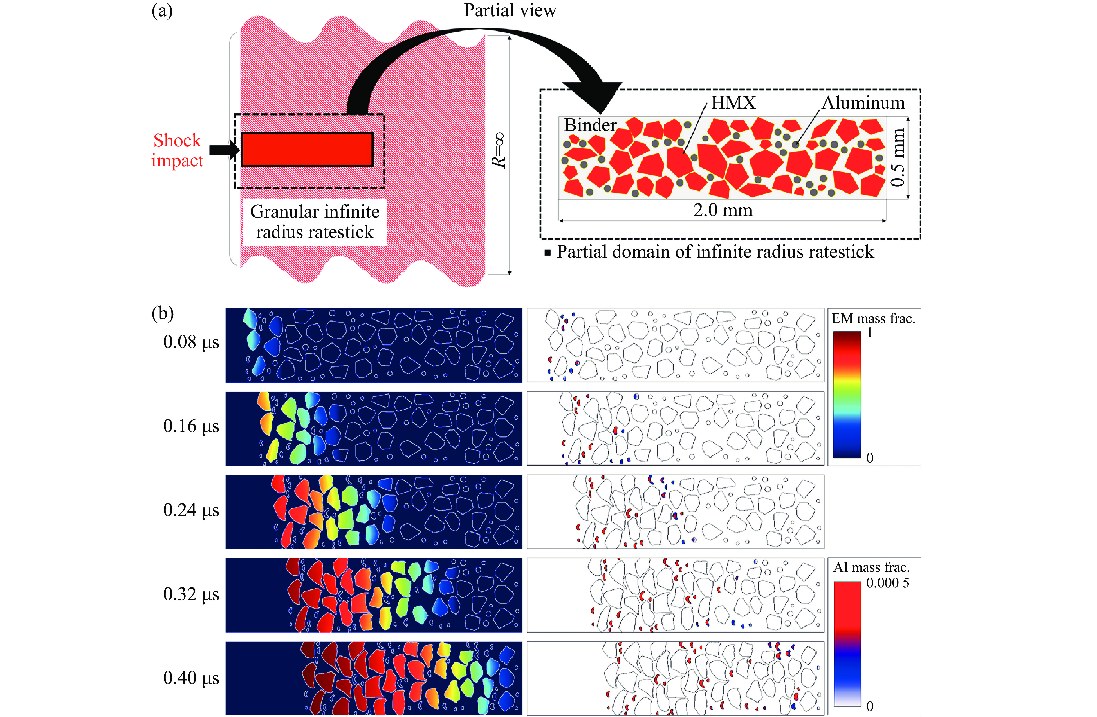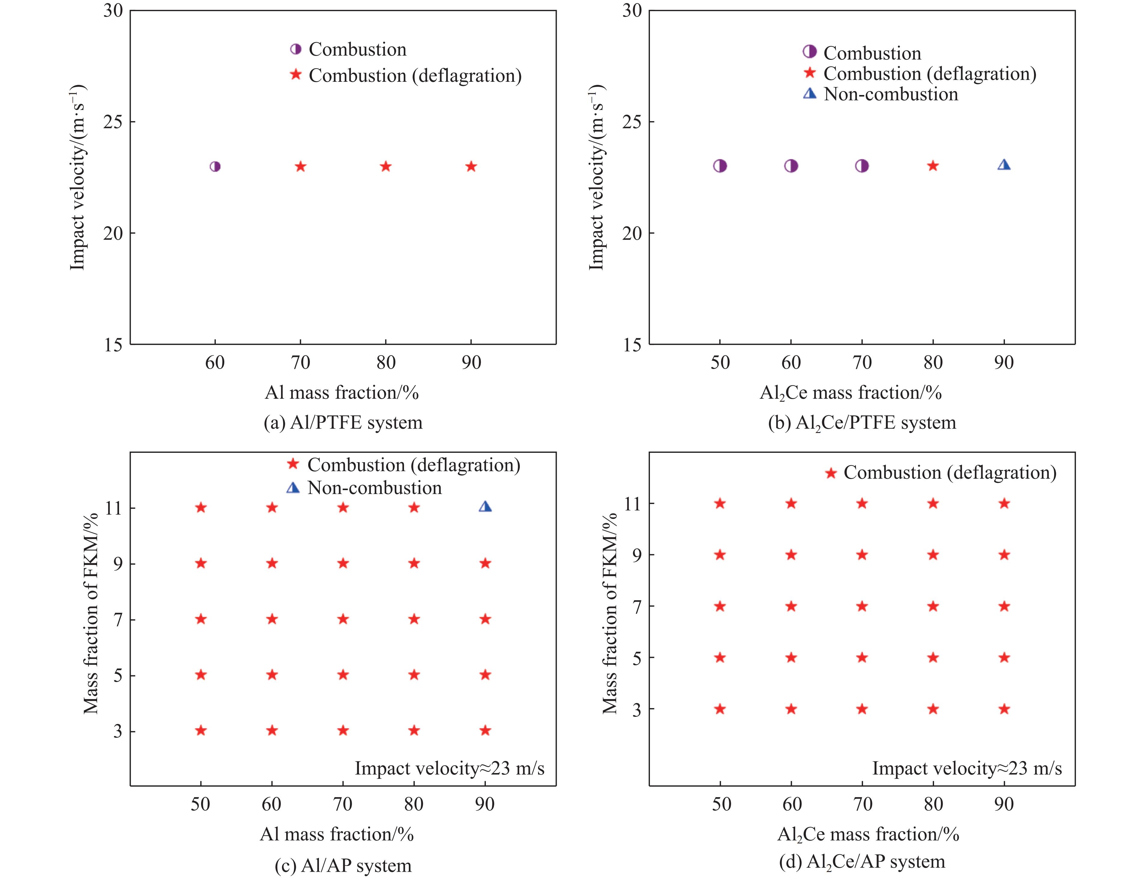 金属铝(Al)作为常用的活性金属之一被广泛应用于活性材料体系中,但Al也存在反应活性偏低制约体系能量释放的问题。本研究将铝铈合金(Al-Ce alloy)引入反应体系中,利用稀土铈的高反应活性特点强化铝的反应活性。为研究稀土基活性材料在冲击过载下的力学特性和点火性能,开展了Al2Ce/PTFE、Al/PTFE、Al2Ce/AP、Al/AP四种活性材料体系的制备和表征,通过霍普金森杆实验系统动态加载,研究四种活性材料体系的动态应力-应变、点火延迟、燃烧持续时间等性能;通过热分析测试,研究不同含量活性金属对AP的热分解性能的影响。研究表明,四种活性材料存在未燃烧、燃烧和爆燃三种冲击点火形态;Al2Ce/PTFE和Al/PTFE材料点火性能较差;Al2Ce/AP体系的极限强度和临界失效应变较高,且冲击点火形态为爆燃,点火延迟和持续燃烧时间均低于Al/AP体系;Ce元素的引入加速AP的分解,并使Al2Ce/AP体系的焓值大幅提高,能量释放更集中。Ce元素可以有效提高金属铝的反应活性,其高反应活性特点使活性体系材料的反应进程加速,并显著强化活性材料体系在冲击作用下的能量释放。综上所述,稀土铝合金材料因其具有高反应活性优势,对于研制新型铝基冲击反应材料具有重要意义。