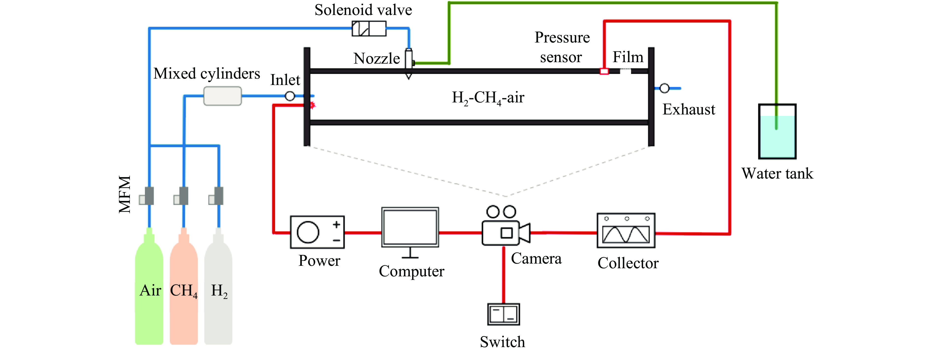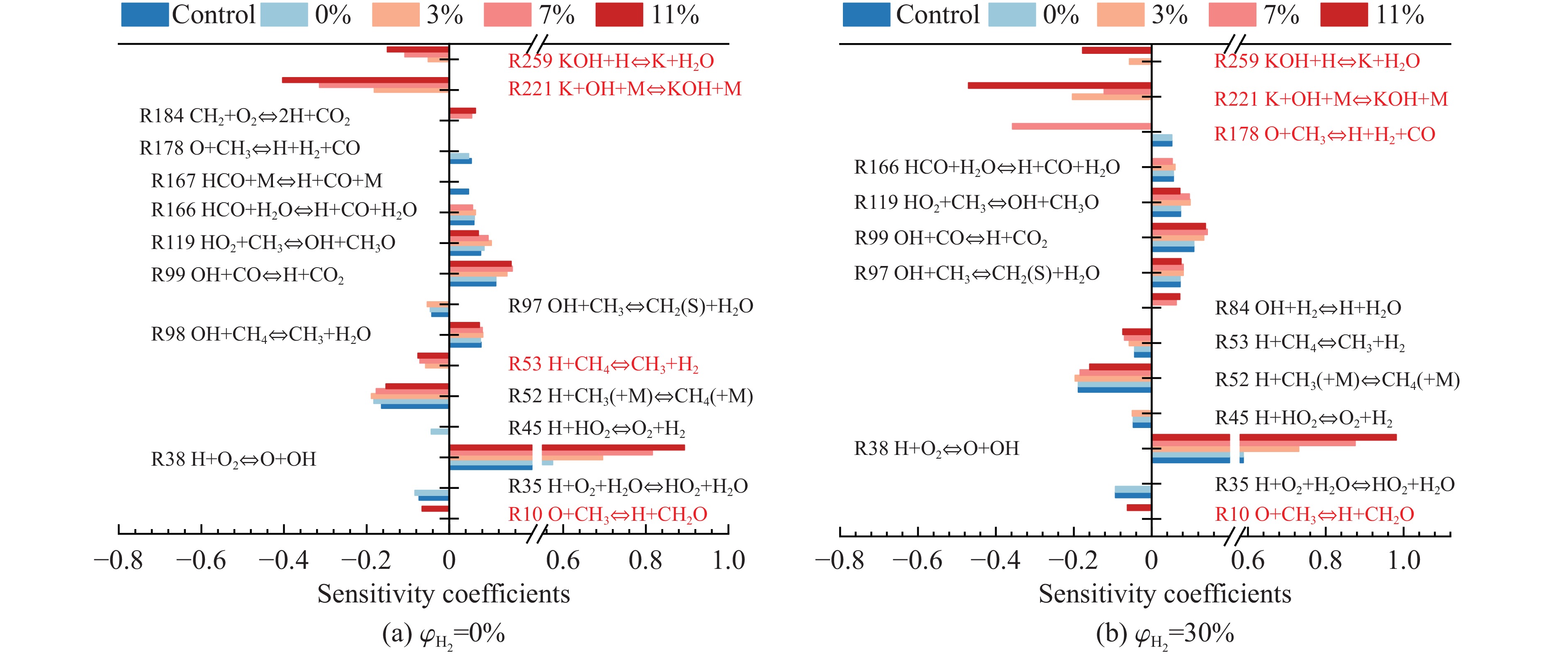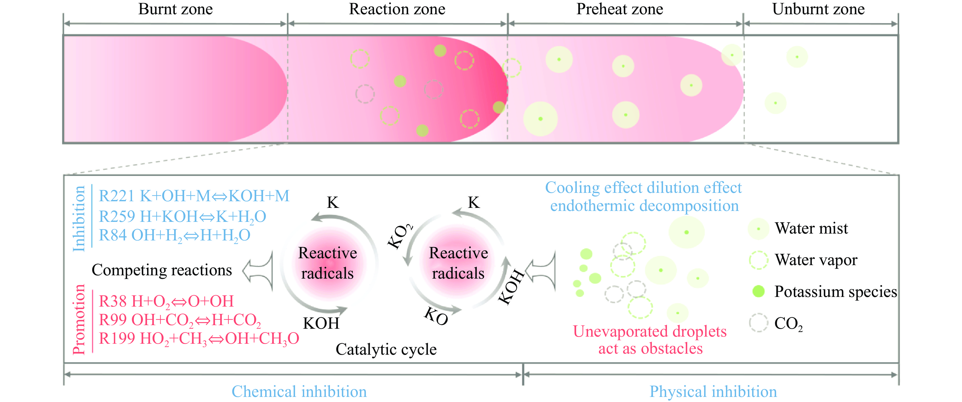 甲烷-氢气混合气体的爆炸防控技术是保障氢能安全应用的重要课题。通过实验与数值模拟相结合的方法,系统研究了含KHCO3细水雾对甲烷-氢气预混爆燃的抑制机理。结果表明,含KHCO3细水雾对甲烷-氢气预混爆燃具有显著抑制效果,且抑制性能与KHCO3的质量分数呈正相关。以氢气体积分数为10%的混合气体为例,与对照组相比,KHCO3的质量分数为11%时,峰值压力和平均压力上升速率分别降低34.64%和44.57%,层流燃烧速度最高下降66.43%。KHCO3兼具物理与化学双重抑制效应:物理上,雾滴相变吸热和蒸气稀释效应降低火焰温度并稀释可燃物;化学上,KHCO3分解产生的钾化合物通过KOH→K→KOH重组循环消耗关键自由基(·H、·O、·OH),与链分支反应形成竞争,中断燃烧链式反应。此外,抑制过程是抑制与促进效应的竞争。高掺氢比和高KHCO3质量分数下,物理蒸发效率成为限制化学抑制作用的瓶颈,导致抑制效率出现饱和现象,但整体上仍表现出显著的抑制效果。