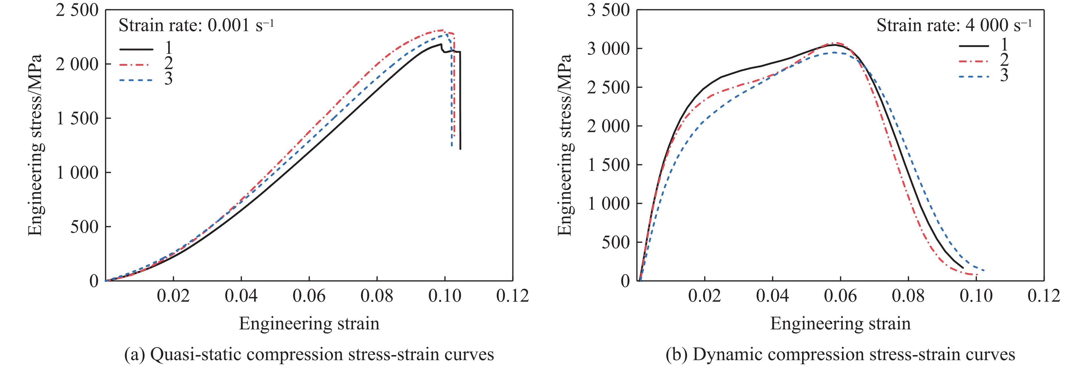 碳纤维增强塑料(CFRP)作为一种先进复合材料,在工程领域应用广泛。然而,针对超薄CFRP层压复合材料动态力学行为的研究较为有限。采用单向超薄预浸料和热压成型工艺,制备了单层厚度仅为0.1 mm的超薄CFRP层压复合材料,系统研究了0°、90°、0°/90°、45°与±45° 5种铺层角度试件的应变率效应。准静态压缩实验结果表明:45°铺层增强了塑性行为,但削弱了材料强度与模量;而90°铺层则有助于提高模量与强度,并减少塑性变形。动态冲击结果表明,90°铺层能够提升动态模量与动态强度,并降低动态屈服应变;45°铺层虽降低了动态屈服强度,但显著增强了动态模量与动态屈服应变对应变率的敏感性。相较于0°/90°铺层的传统CFRP层压复合材料(层厚0.295 mm,动态强度和模量分别为900 MPa和10.12 GPa),所制备的超薄CFRP复合材料在单位厚度内的纤维含量提升了66%,动态强度和模量分别提高了123%和926%。基于实验数据,进一步建立了超薄CFRP复合材料的本构模型,并给出了相应的本构参数,为预测材料在不同铺层方式和应变率下的力学行为提供了依据。