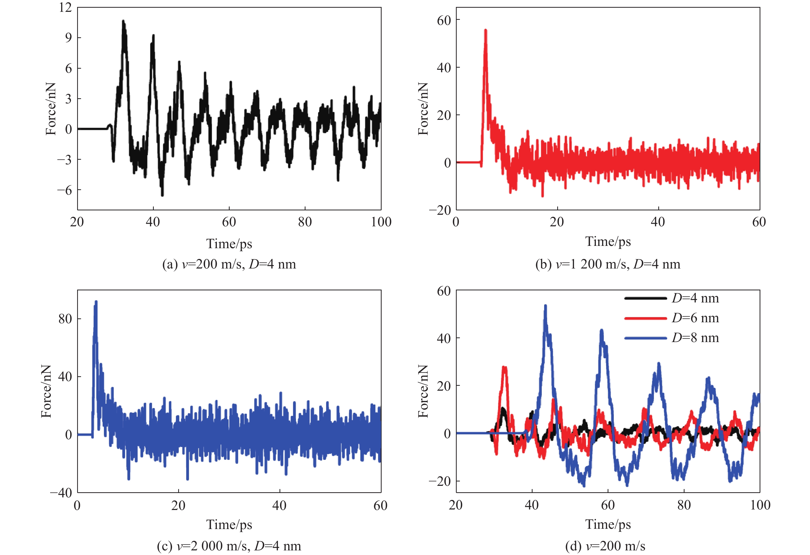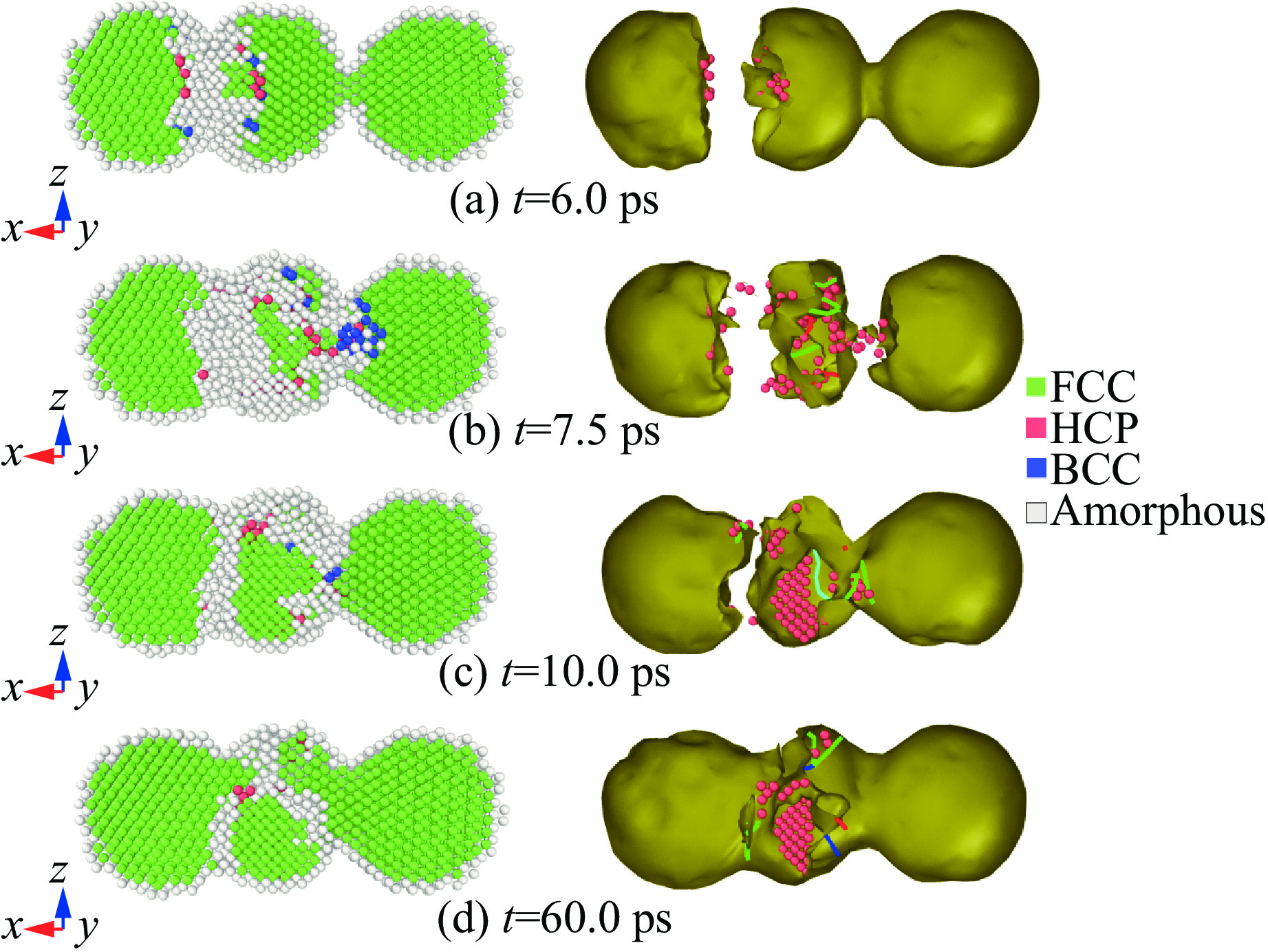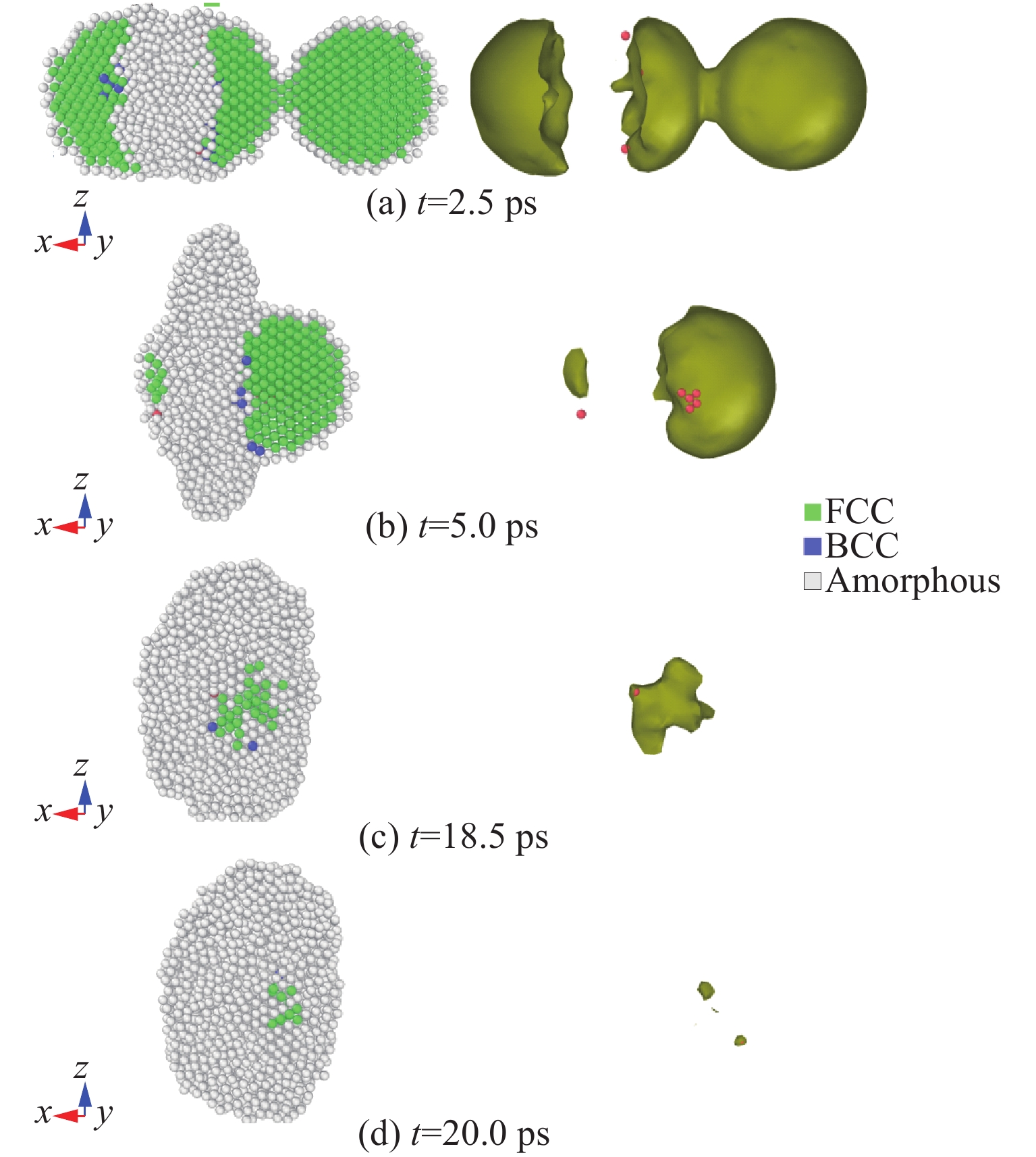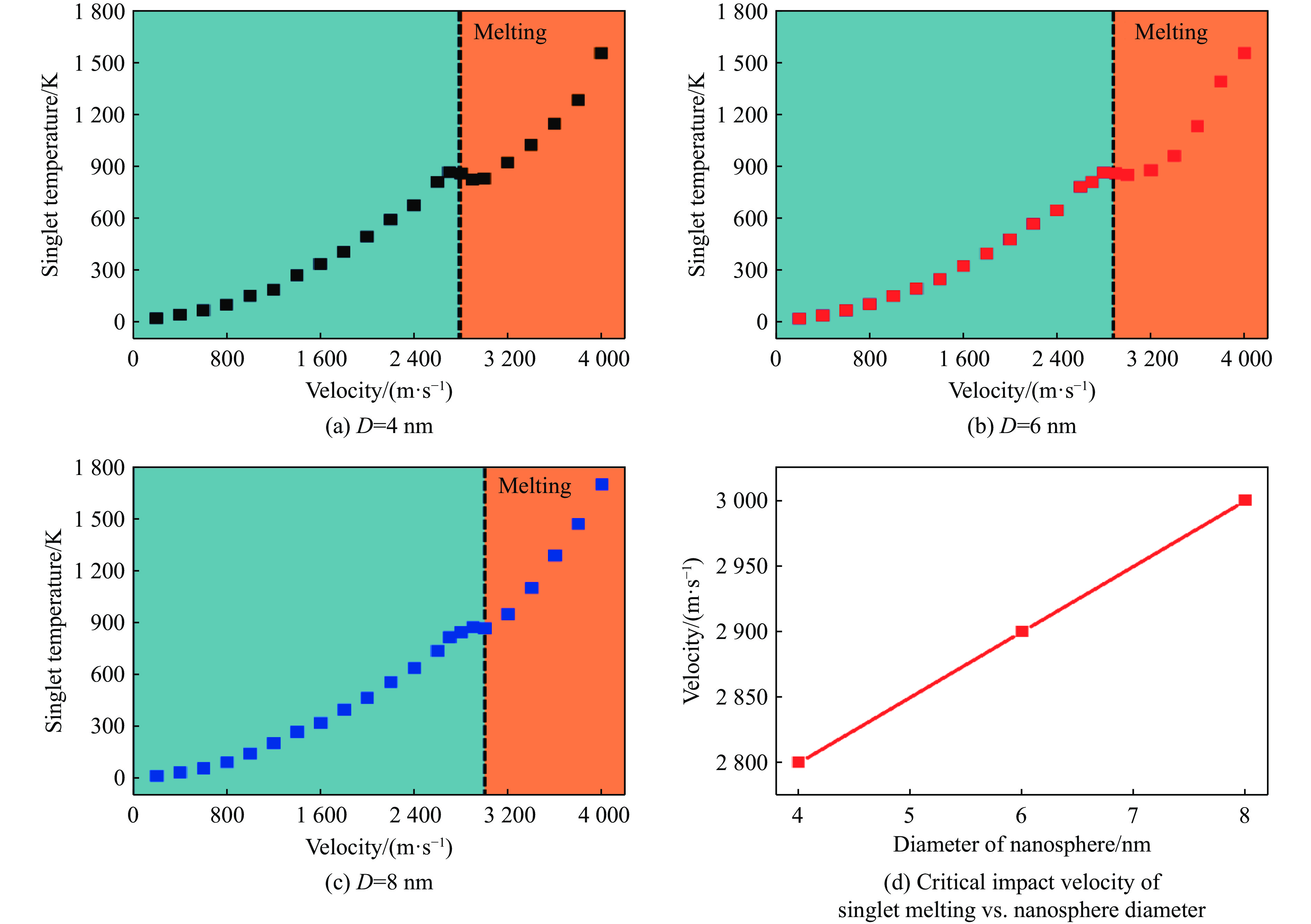利用分子动力学模拟研究了单个铝纳米球(单重态)与初始呈I型构型的两个铝纳米球聚集体(双重态)碰撞的动力学过程。根据初始撞击速度的不同,纳米球体会发生四种碰撞结果:反弹、粘附、聚集和熔融。当撞击速度极低时,纳米球体间的排斥力会使它们无接触反弹,且反弹临界速度会随着纳米球体直径的增大而降低。随着撞击速度增加,纳米球体因相互粘附形成新键而发生烧结。通过共邻分析、位错分析和均方位移等方法,我们定量表征了单重态-双重态碰撞过程中的相变与原子扩散现象,从而揭示了烧结机制的本质。通过监测不同直径单重态的温度变化,最终确定了单重态熔融的临界撞击速度。