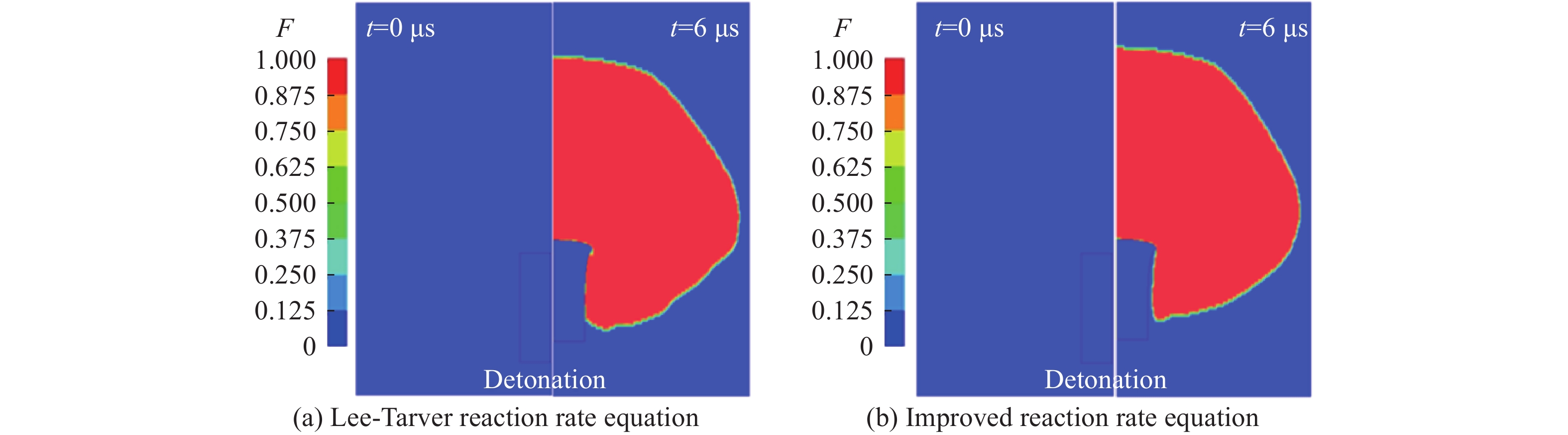 针对Lee-Tarver点火增长反应速率方程参数多且不易标定的问题,在三项式结构的基础上,引入半周期三角函数对模型进行优化。新速率方程优化了点火项的连续性,将增长项和完成项的形状因子最大数值限制为1,减弱了比例系数和形状因子的参数补偿,消除了三项式的反应度极限,将反应速率方程参数由15个降至10个,提高了参数标定的效率。基于LS-DYNA对改进的点火增长模型进行二次开发,对比计算了Lee-Tarver模型和优化模型的冲击起爆仿真结果,炸药内部压力和反应度高度一致,验证了模型开发的正确性。基于炸药驱动金属板试验结果,应用LS-OPT标定了优化的点火增长模型参数,并统计了反应速率方程参数的敏感度,提炼出了关键参数,可为进一步提高参数标定效率提供参考。仿真结果与炸药驱动金属板试验结果的相对误差小于3%,验证了标定参数的准确性。应用改进的点火增长模型,结合子弹/破片撞击弹药的安全性试验,研究了子弹/破片撞击下弹药的冲击起爆响应特性。子弹撞击弹药后66 μs内炸药内部峰值超压达到14.5 GPa(爆压的48.3%),表明炸药未发生爆轰反应;破片撞击条件下,炸药内部峰值超压仅为0.79 GPa,近撞击点的反应度大于其他区域,最大反应度仅为0.01,炸药未起爆。优化模型的仿真结果与试验测试结果的一致性较好,验证了优化开发的点火增长模型的工程应用性。