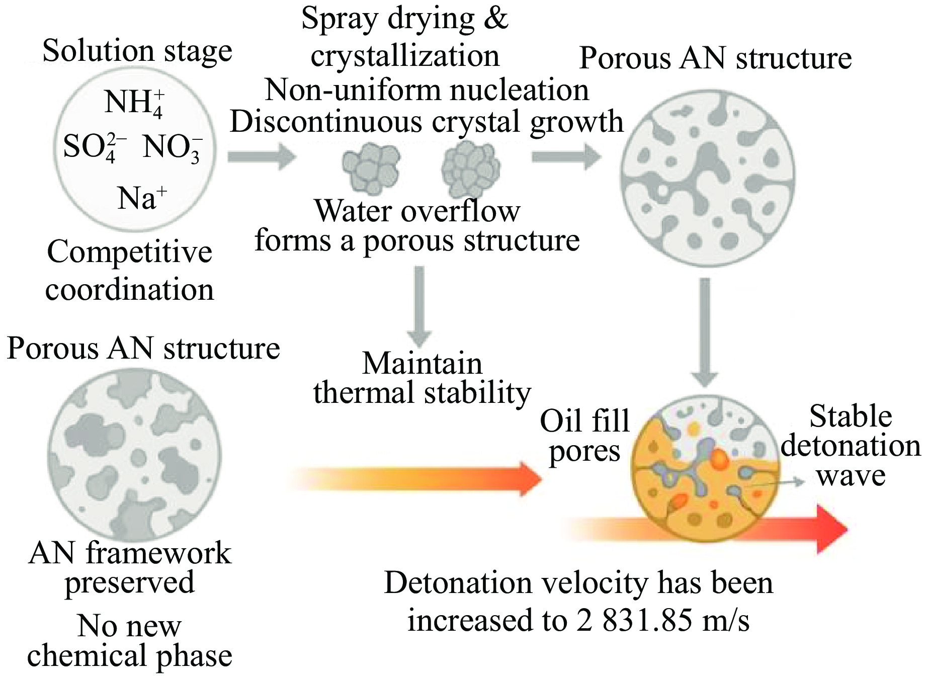 多孔硝酸铵因其多孔隙结构常被用于特定作业,但其运输成本较高。为此,以离子表面活性剂PST为添加剂,通过喷雾造粒法制备了多孔隙改性硝酸铵,研究了不同质量分数(0~0.4%)的PST对硝酸铵孔隙结构、吸油率、热稳定性及爆炸性能的影响。结果表明:随着PST含量的增加,硝酸铵由致密颗粒逐步转变为具有明显连通孔隙的多孔结构,热稳定性基本保持不变,基体化学组成未发生本质改变,但吸附水降低。改性后样品与油相的结合能力提高,所配装药的爆速由未改性时的“未正常起爆”提升至