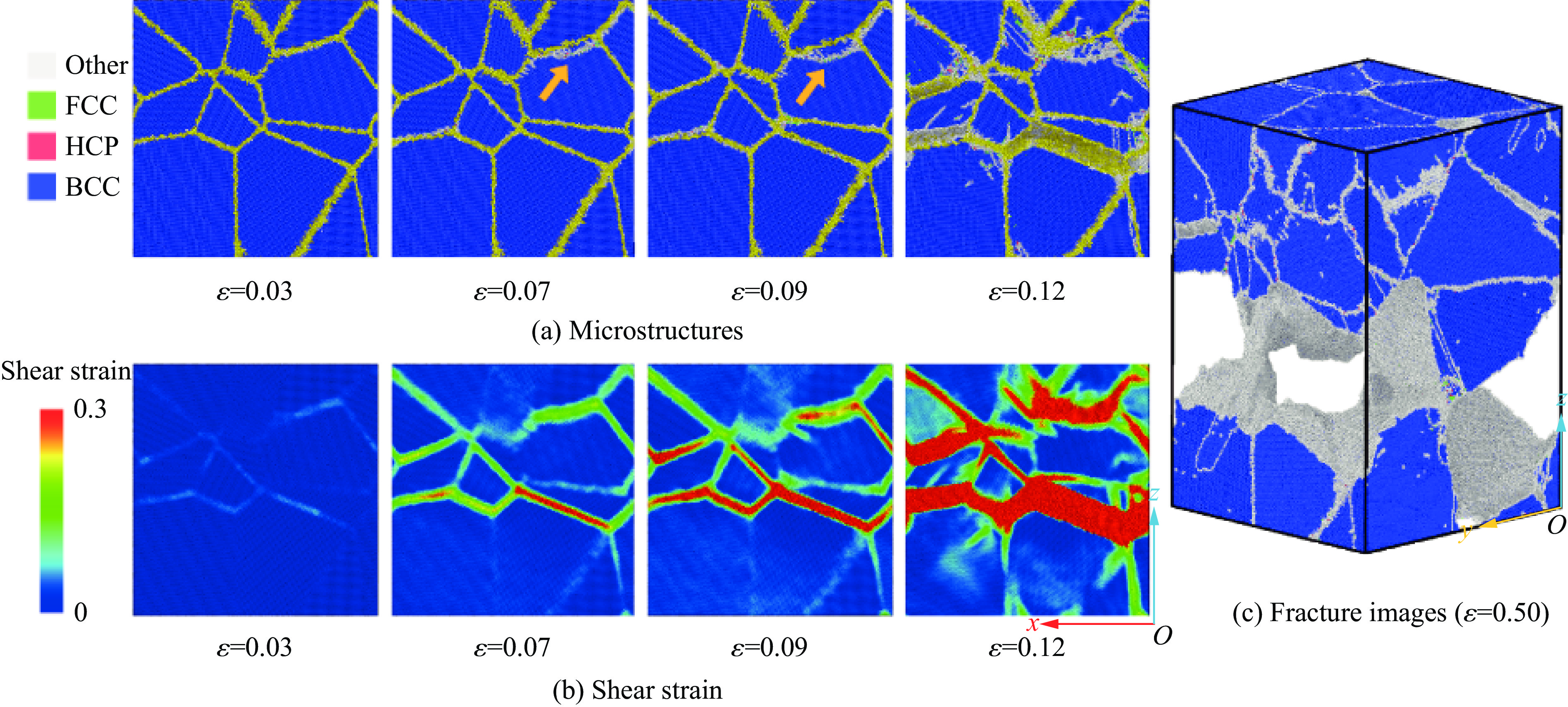 高熵碳化物(high-entropy carbide, HEC)因其显著的化学无序与晶格畸变,展现出优异的强-韧协同特性,有望成为冲击防护与高温结构应用的前沿材料。然而,在高压、高应变率等极端服役条件下,其微结构演化与动态力学响应仍缺乏系统认识。为此,基于高精度机器学习势,以 (Zr0.2Hf0.2Ti0.2Nb0.2Ta0.2)C为研究对象,开展了沿 [0 0 1]、[0 1 ¯1] 和 [1 1 1] 3个典型晶向的准等熵压缩以及斜波加载分子动力学模拟。从晶向与加载路径角度,系统地揭示多重“高熵”效应如何影响高熵碳化物在原子尺度下的塑性变形机制。研究发现,引入多主元金属的高熵碳化物显著改善了陶瓷材料的塑性激活方式、滑移系竞争关系及局域变形模式。局域应力扰动与晶格畸变不仅强化了金属子晶格 Bain 型瞬态堆垛重排,提高了材料的承载能力和延展性;也促进了多滑移系协同激活,使剪切带由单向延伸转变为多向、网络化扩展。第一性原理计算还表明高熵碳化物中的碳空位形成能较单组分过渡金属碳化物显著降低,因此,在压缩过程中碳原子更易先发生大位移形成碳空位并参与剪切带成核。
