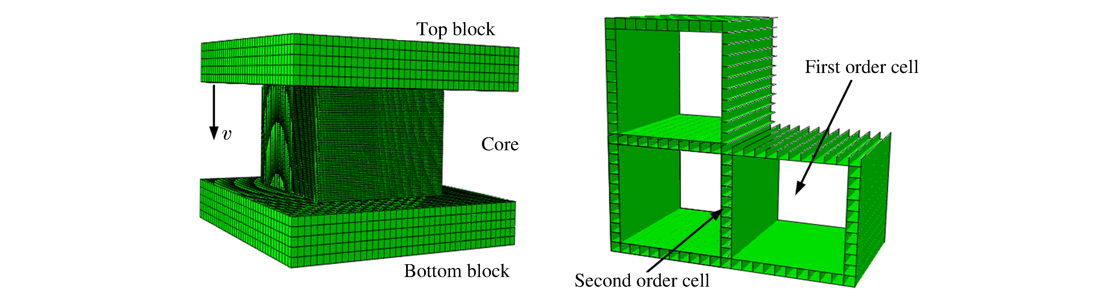 运用ABAQUS对在冲击载荷作用下二阶自相似四边形蜂窝面外方向的动态压缩行为进行了数值模拟,分析了其在冲击载荷作用下的动态压缩过程,并对孔径尺寸、冲击速度和基体材料屈服强度对其压缩模式及应力-应变关系的影响进行了研究。数值模拟表明:孔径较小的二阶自相似四边形层级蜂窝在冲击载荷作用下更易出现整体坍塌的压缩失效模式;随着基体材料屈服强度增大,平台应力值随之增加,但对平台长度没有影响;随着冲击速度的增加,冲击端平台应力值和平台长度都有所增加。