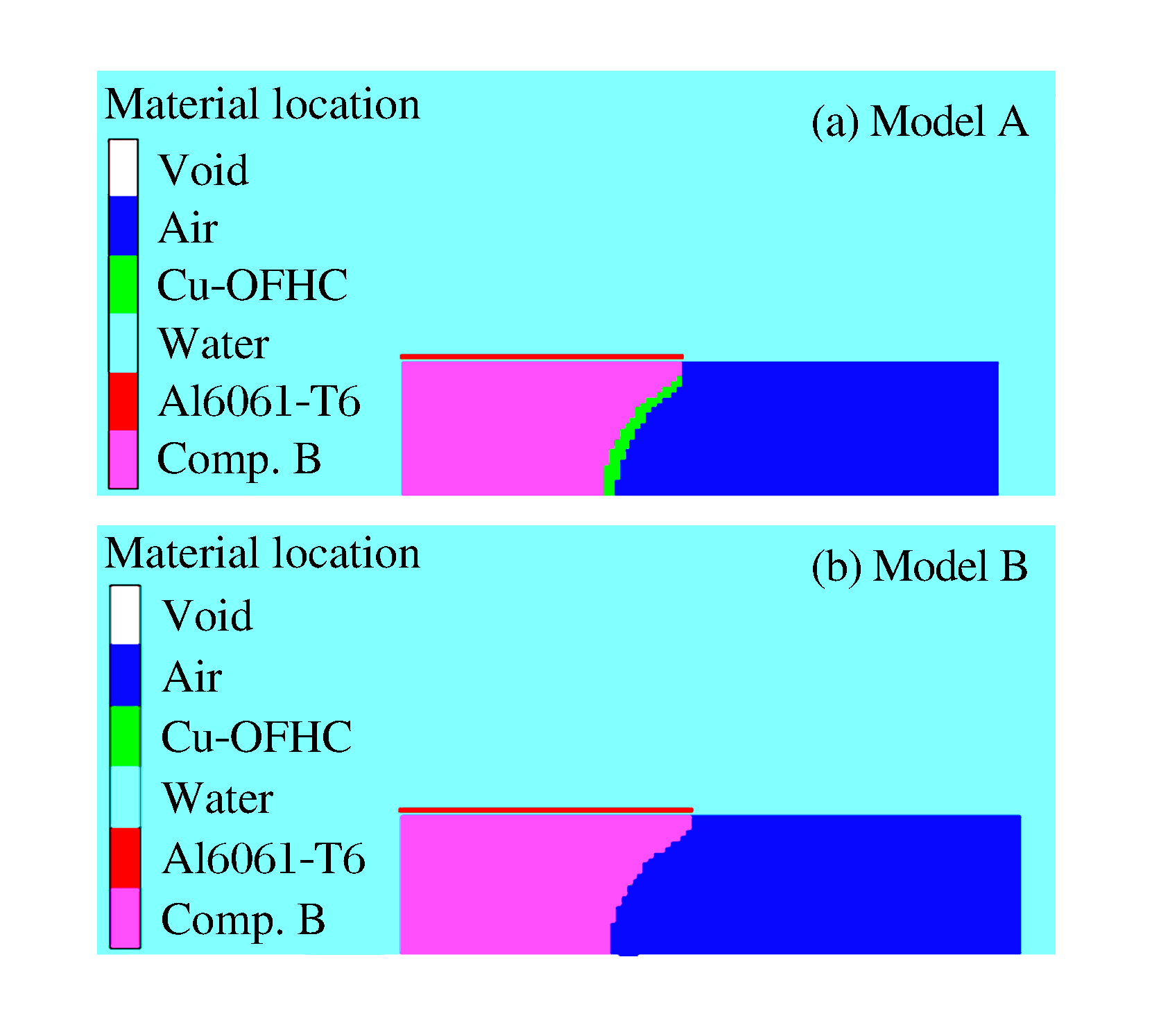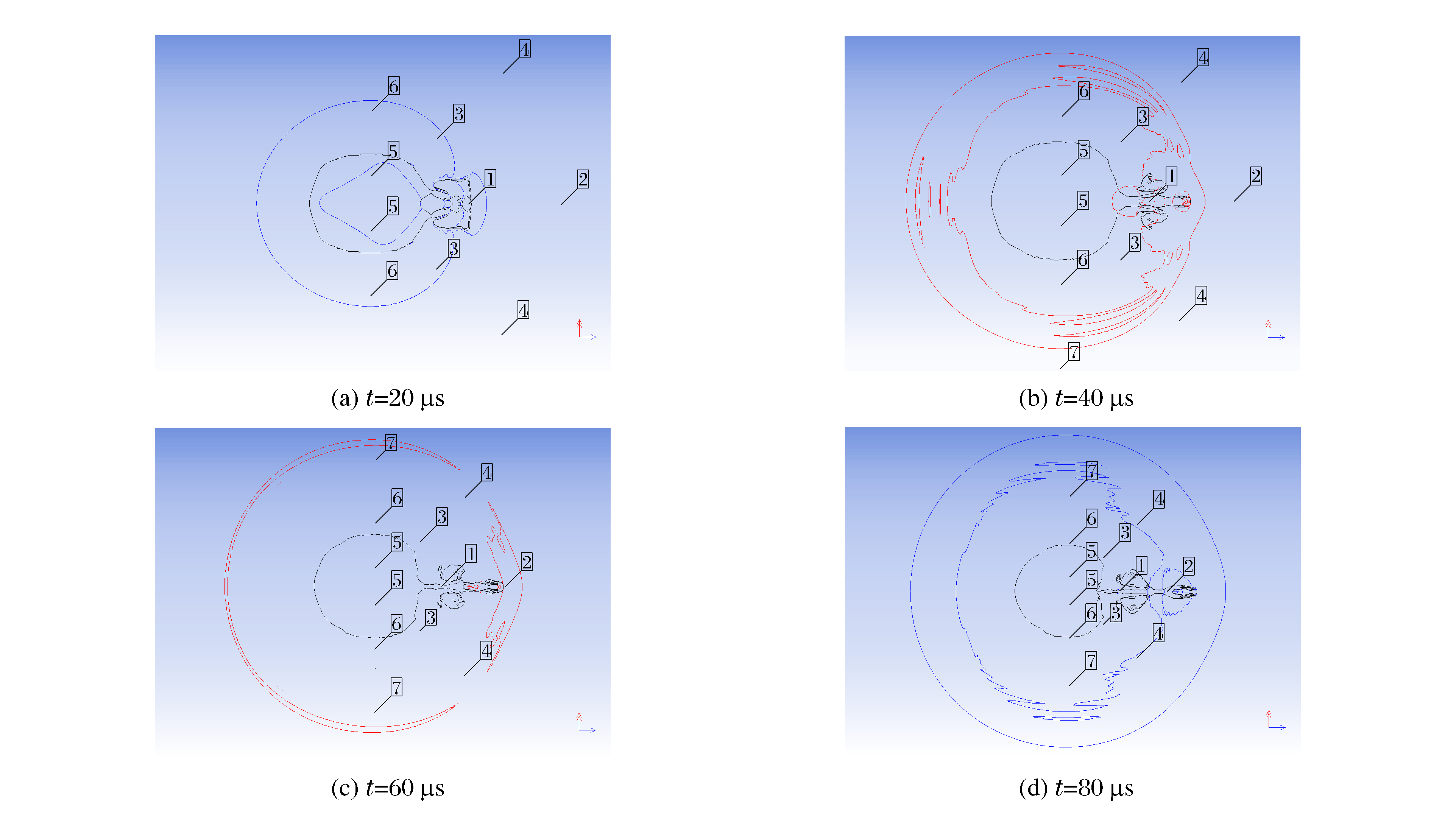 对聚能装药水下爆炸近区压力分布进行了实验研究,将其结果与数值计算结果进行比较,验证了计算模型及方法的可靠性;利用数值计算方法研究了聚能装药水下爆炸冲击波的分布规律、不同装药形式冲击波的传播以及能量的分布。结果表明:水中近场冲击波具有较强的不均匀性,侵彻体前端的水介质中有较强的压力扰动,对正向冲击波有增强作用,等压线呈不规则形状,近场冲击波阵面呈“梨形”演化。