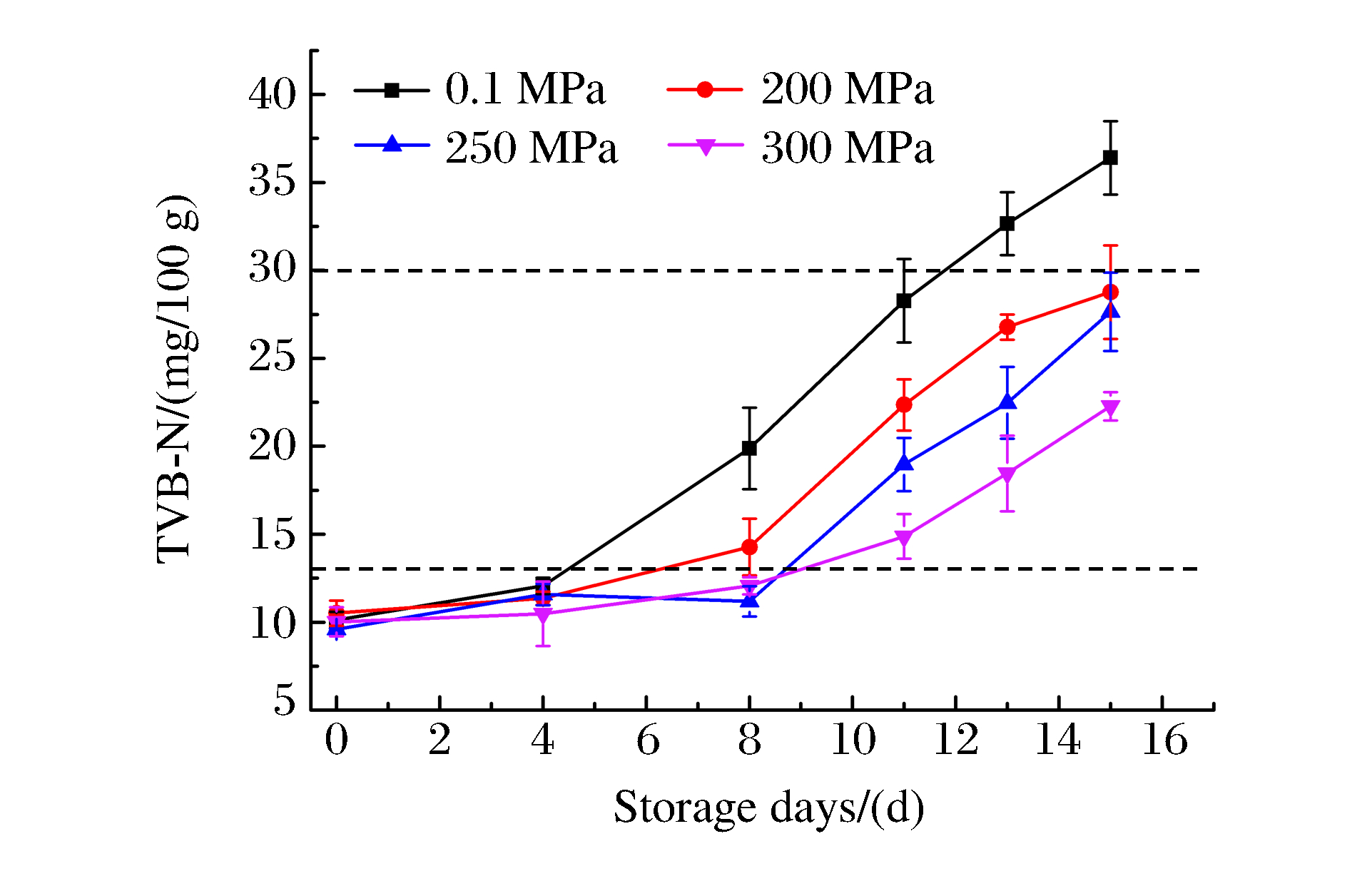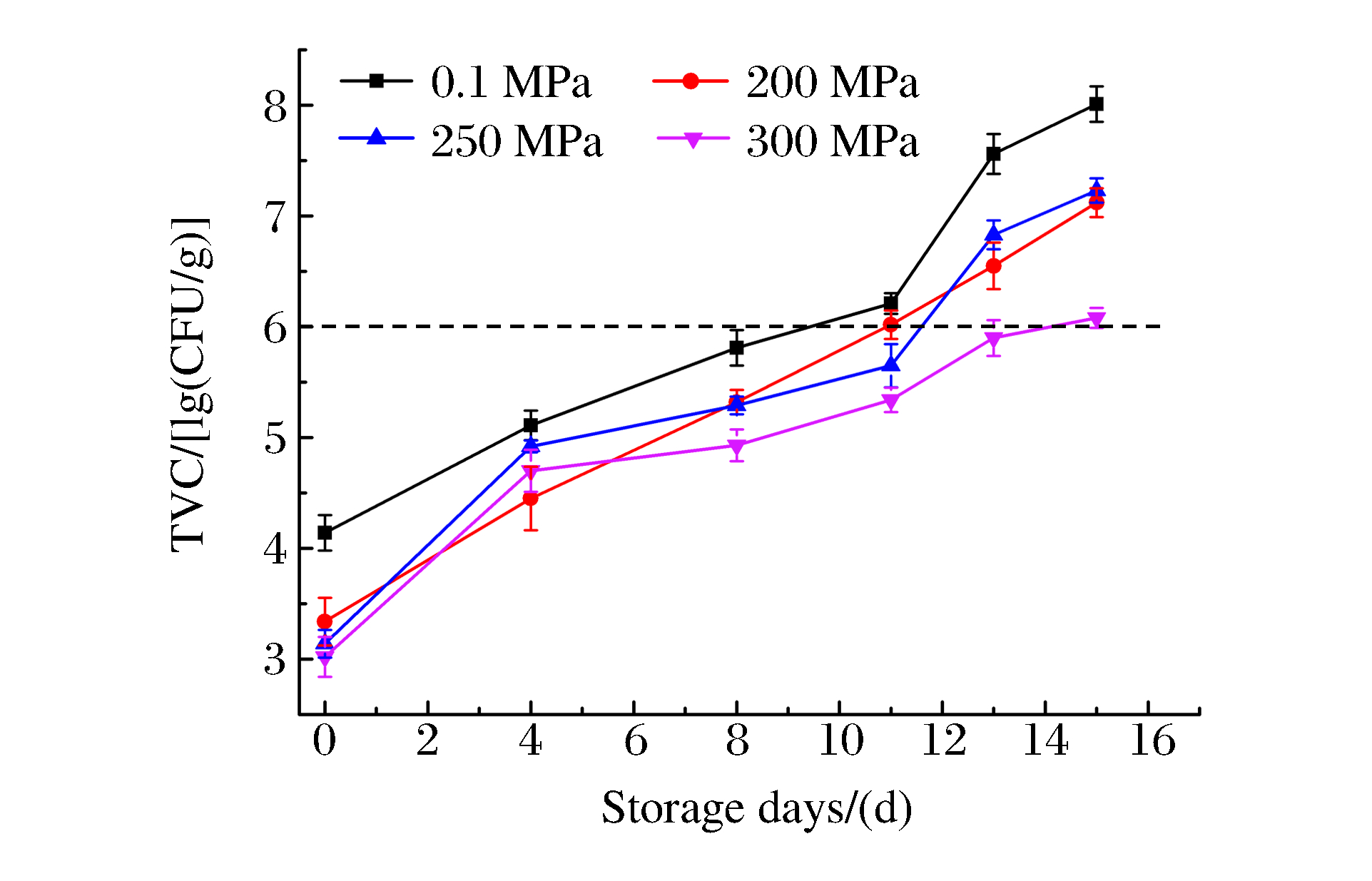 为研究超高压处理对冷藏鲈鱼片品质及组织结构变化的影响,将新鲜鲈鱼片经不同超高压(200、250、300MPa,保压时间9min)处理后,置于4℃条件下贮藏。分别于0、4、8、11、13、15d进行样品的理化指标(pH值、硬度、持水力、硫代巴比妥酸(TBA)值、挥发性盐基氮(TVB-N)值)和微生物指标(菌落总数)测定,并结合低场核磁共振技术表征其水分迁移状态,辅以外观及微观结构观察,进行指标间的相关性分析,以综合评价超高压处理对冷藏鲈鱼片品质及组织结构变化的影响。结果显示:随着贮藏时间的延长,样品的pH值呈先降后升的变化趋势,压力大小与pH值变化正相关,与硬度值、持水力负相关;超高压处理能抑制样品的TBA值、TVB-N值及菌落总数的上升,压力越高,抑制效果越显著。低场核磁共振技术结合持水力数据显示:超高压处理后鱼肉水分迁移变化明显;随着压力的增大,鱼肉样品表面呈乳白色,蒸煮效果显著。观察样品肌肉组织的微观结构得出,经超高压处理后,鱼体肌肉组织变得模糊,肌纤维结构紧致无序,其中300MPa处理组样品呈明显凝胶状。超高压处理能抑制样品的脂肪氧化和微生物生长,但会对样品外观、色泽及持水力产生不利影响。进行指标间的相关性分析得到,TVB-N、TBA值和菌落总数能作为判断鲈鱼鲜度的重要指标。比较各组别间的结果差异性,以250MPa、9min超高压处理的综合评价效果相对较好,能使鲈鱼片的冷藏货架期至少延长4d。