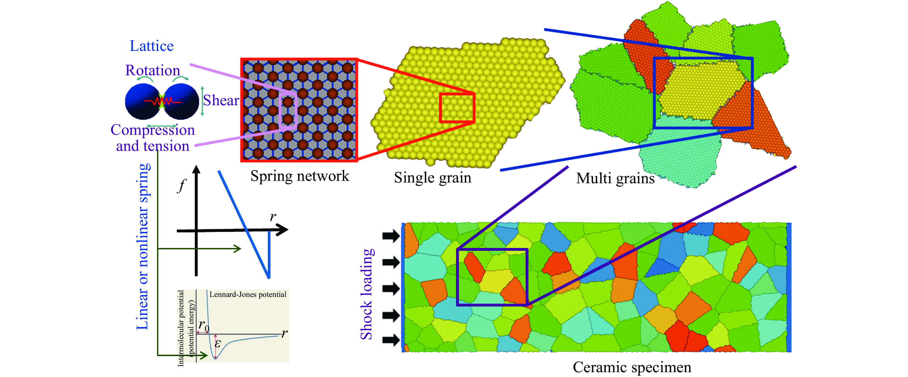 岩石、陶瓷、玻璃、固体炸药等脆性材料在爆炸与冲击施加的强动载荷作用下易发生迅速的裂纹扩展和灾难性的断裂破碎,造成材料、器件、装置的功能失效和事故危害。理解脆性断裂过程中介观裂纹网络演化与宏观动态响应的关联是提升脆性材料可靠性和安全性的关键,但同时也是计算建模与数值模拟研究面临的难点。为了解决爆炸与冲击加载下脆性材料中裂纹网络随机萌生、裂纹面挤压摩擦、大量裂纹交错扩展等复杂过程带来的算法困难,一种无网格/粒子方法—“格子模型”得到了持续的关注和长足的发展。本文综述了格子模型的原理和方法,介绍了运用格子模型开展脆性断裂研究的代表性成果,分析了格子模型存在的不足与改进的方向。