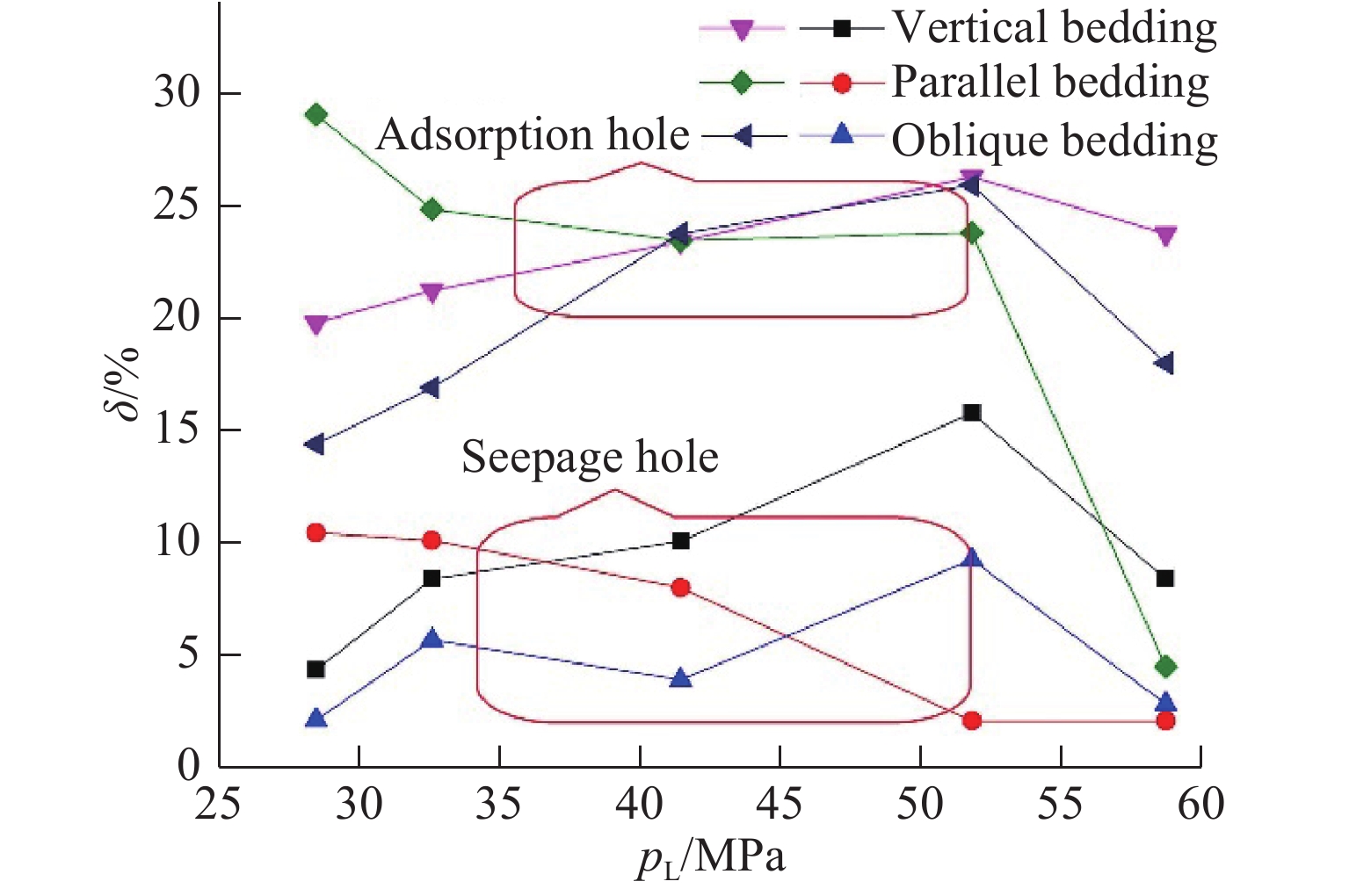 为了揭示冲击荷载对无烟煤微观孔隙结构的影响规律,利用分离式霍普金森压杆(SHPB)冲击实验系统模拟了冲击应力在不同衰减过程中的冲击波和应力波,基于冲击前后压汞实验及低温液氮实验测试数据,运用分形理论,研究了赵固二矿不同方向煤体(与层理方向分别呈垂直、平行、45°斜交)冲击前后孔隙结构的分形特征。结果表明:对于渗流孔,冲击荷载提高了瓦斯的渗流与运移速度,对于吸附孔,冲击荷载减小了吸附孔的吸附能力,促进了瓦斯的解吸;分形维数具有明显的冲击方向性,且吸附孔的分形维数明显小于渗流孔;不同方向无烟煤的最佳冲击荷载不同,垂直和斜交层理方向的最佳冲击荷载为51.80 MPa,平行层理方向的最佳冲击荷载为28.46 MPa。研究结果可为冲击荷载促进瓦斯抽采机理的探讨提供参考。