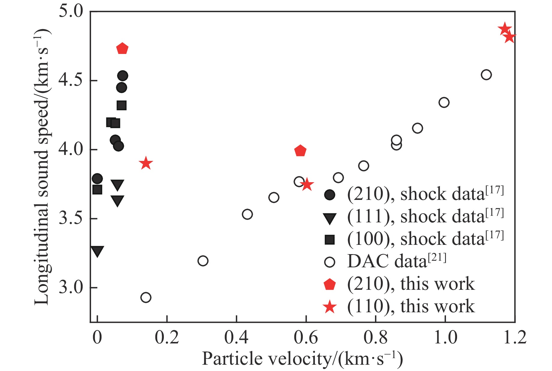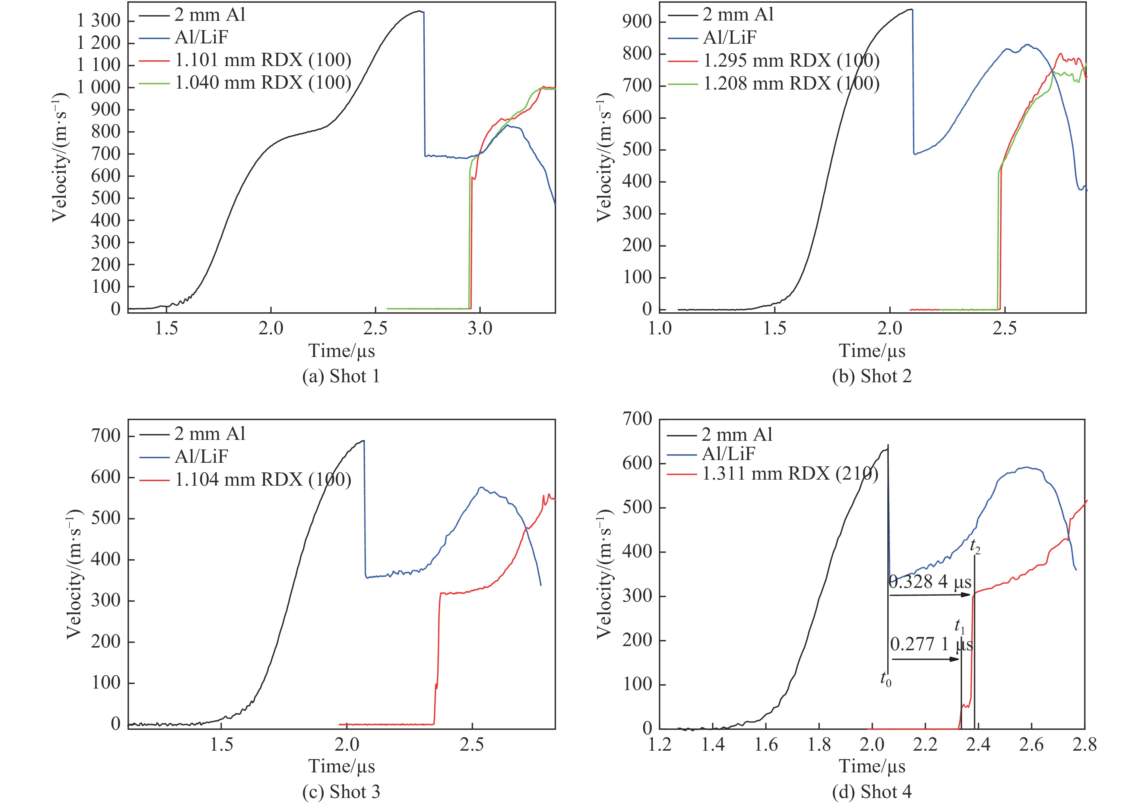 基于磁驱动加载装置CQ-4,完成了冲击-斜波复杂加载实验设计,开展了RDX单晶(210)、(100)两个晶向在不同加载压力下的冲击-斜波压缩实验,获得了RDX单晶样品与LiF窗口界面的速度历史曲线和纵波声速。实验结果显示:速度波剖面可分为冲击压缩、斜波压缩和卸载3部分;当冲击压力较高时,冲击压缩段中不再出现弹塑性转变以及4 GPa附近相变的速度特征波形;当冲击压力较低时,在冲击压缩段观测到了弹-黏塑性波形。