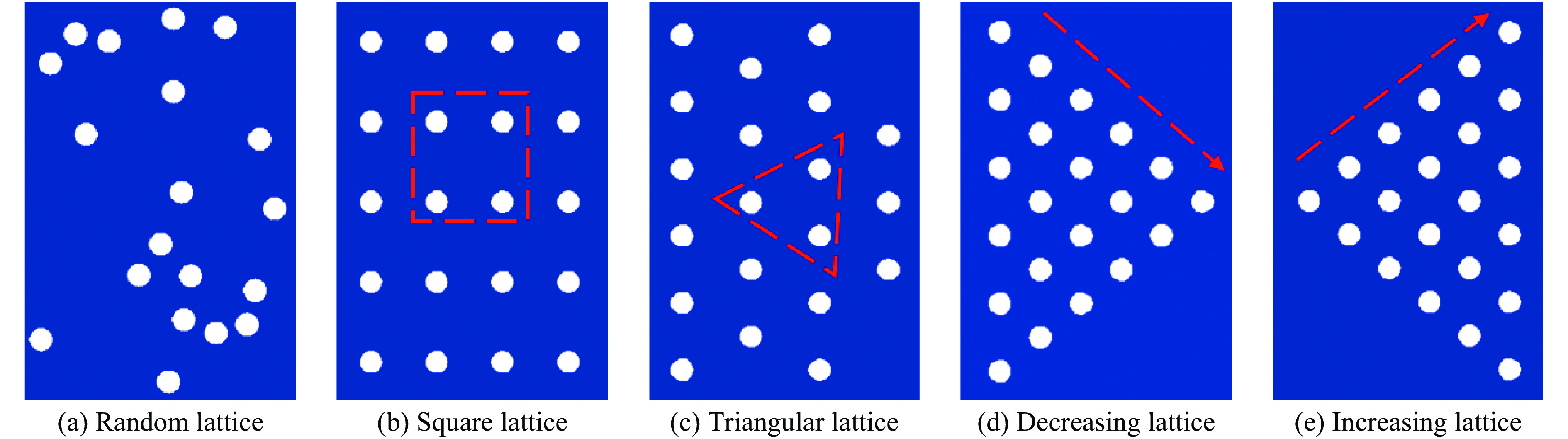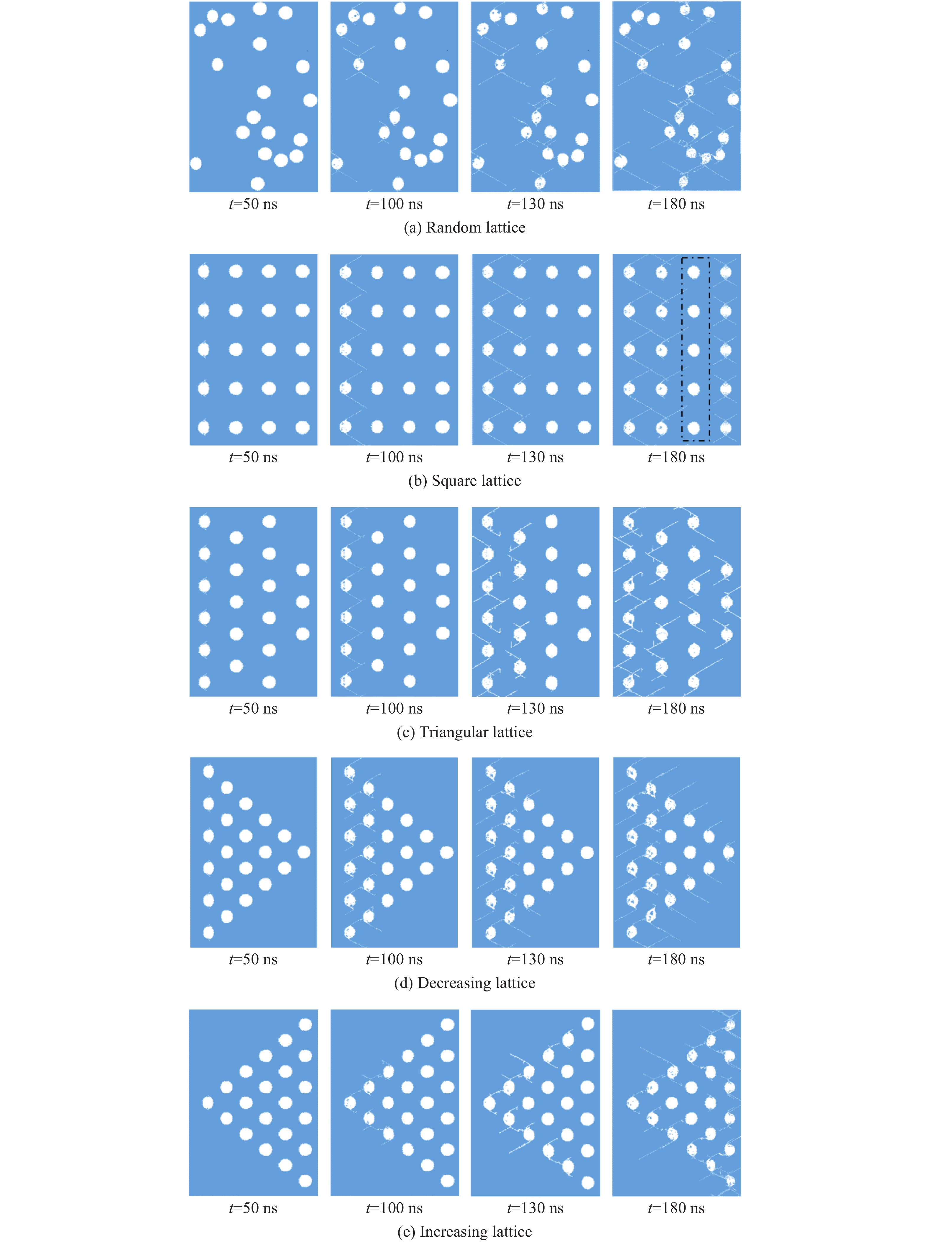 多孔材料具有轻质、缓冲减震、吸能等特点,在加载路径调控、爆炸或冲击防护领域具有广泛的应用前景。采用格点-弹簧模型(离散元方法),模拟多种孔洞排布方式的PMMA多孔材料在冲击加载过程中的早期孔洞塌缩破坏、应力分布与粒子速度等冲击响应行为。结果表明:在冲击加载过程中,裂纹萌发于孔洞侧向(垂直于冲击波方向)附近区域,孔洞破坏形式以剪切断裂为主;在不同的孔洞排列模型中,孔洞与孔洞之间均存在剪切裂纹相互贯通现象,促进孔洞体积压缩致密化,且孔洞排列方式不影响冲击波传播速度;四角点阵模型有效减缓孔洞附近区域的应力集中;四角点阵、三角点阵、锥形递减排列、锥形递增排列模型都显著影响PMMA多孔材料的冲击波阵面平整性;孔洞的随机排列模型对降低粒子速度最有效,四角点阵排列模型对降低波阵面后压力贡献最大。