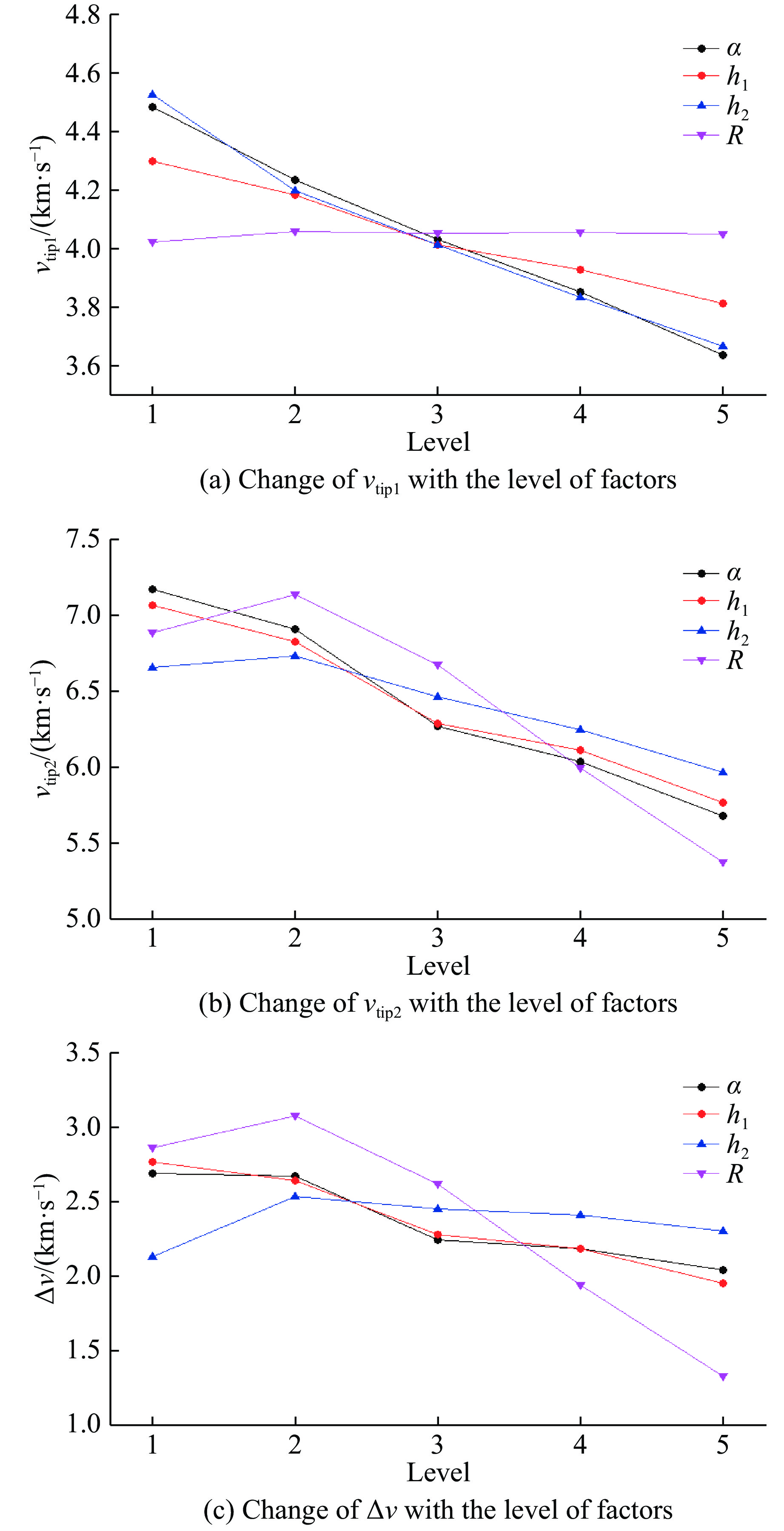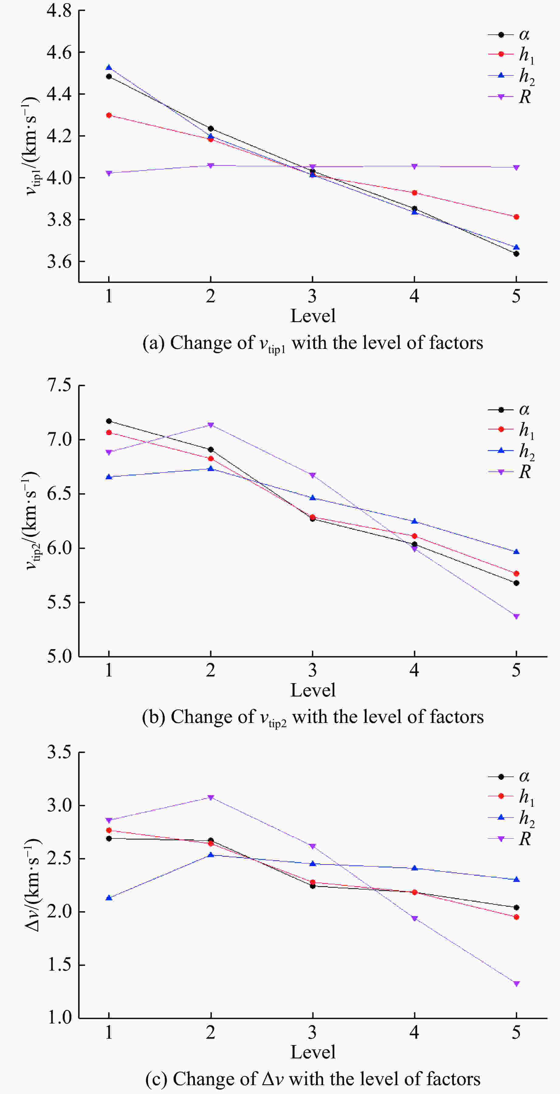 Factor Svtip1/(m·s−1) Svtip2/(m·s−1) SΔv/(m·s−1) α 845.6 1 494.8 649.2 h1 487.6 1 304.0 816.4 h2 861.2 766.0 408.4 R 36.8 1 762.8 1 752.6 -