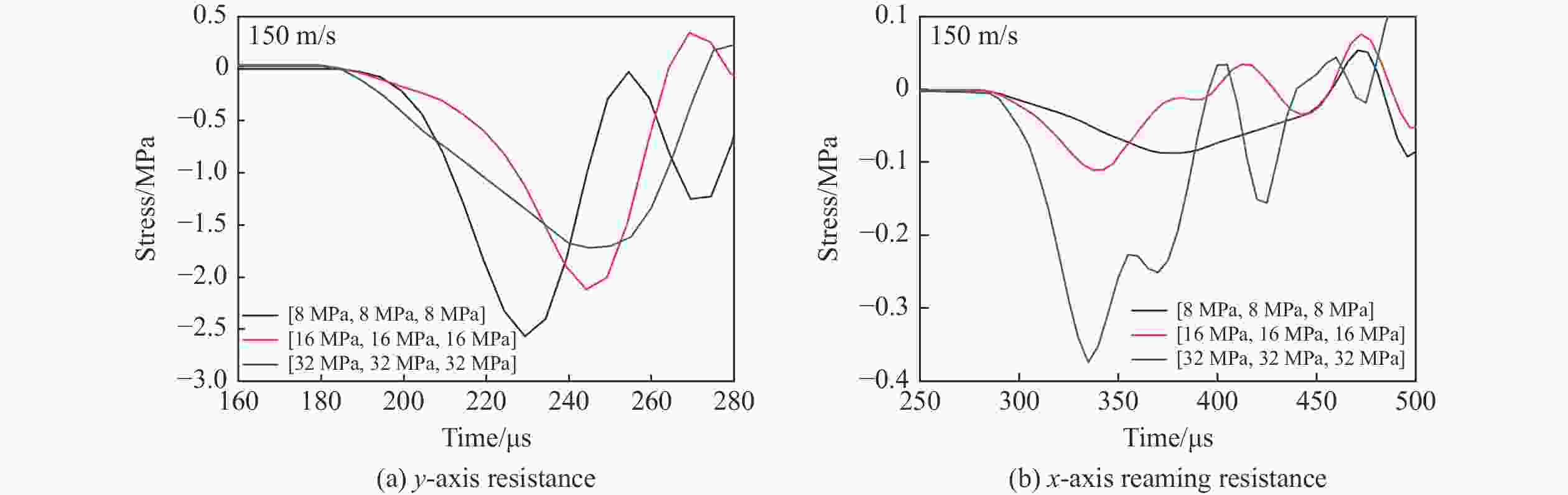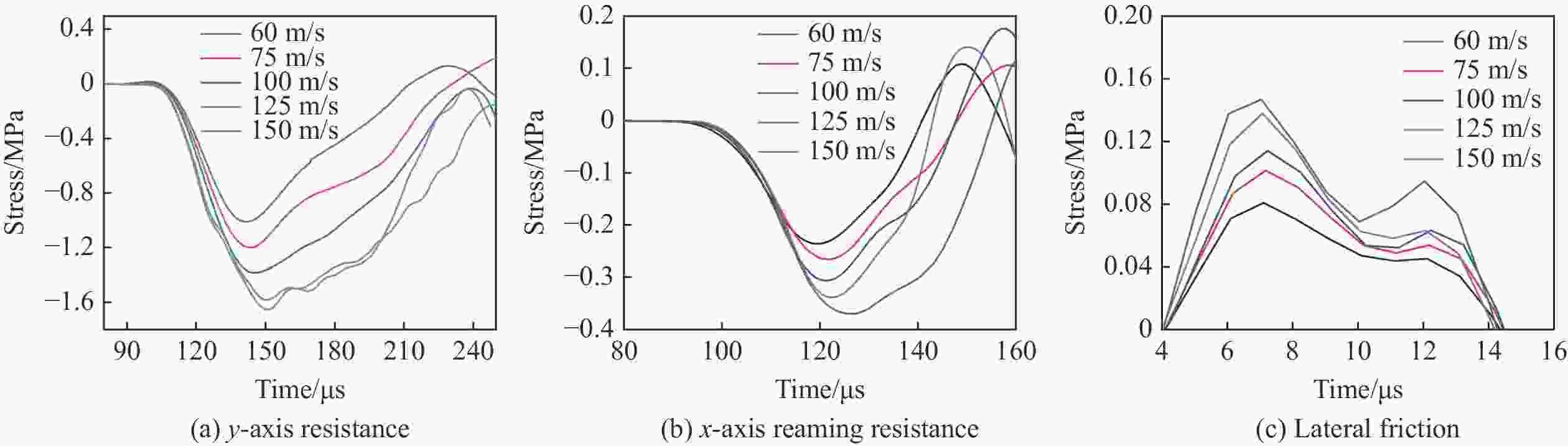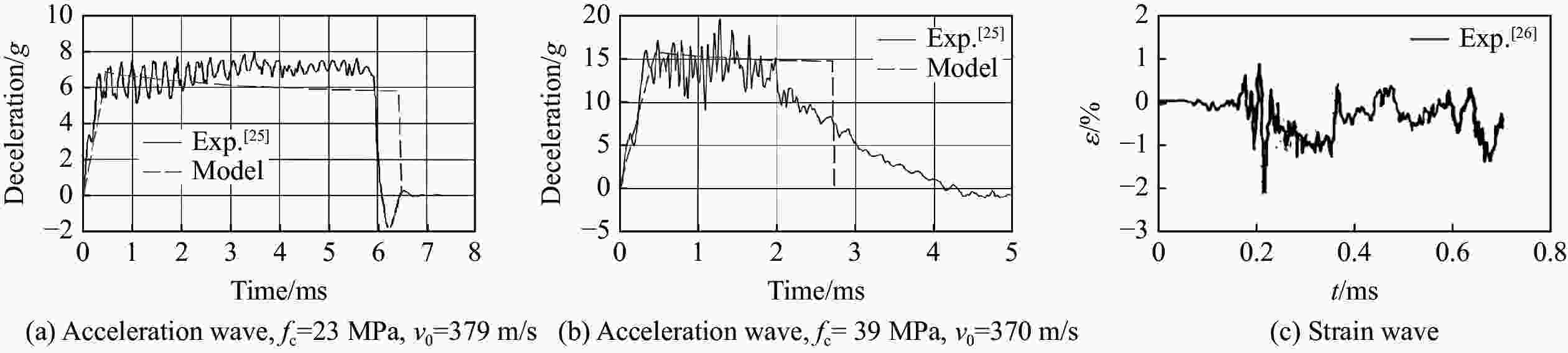 ${\;\rho {_0} }$/(kg·m−3) $G$/GPa AHJC/GPa BHJC/GPa CHJC NHJC $f{'} $/MPa 1844 1.32 0.66 1.335 0.0018 0.845 14.4 T/MPa ${\dot \varepsilon{_0} }$/s−1 $\varepsilon $f,min Smax ${p{\rm{_c}} }$/MPa ${\;\mu {\rm{_c}} }$ ${p{\rm{_l} } }$/GPa 2.0 1 0.01 80.24 13.8 0.0075 1.096 ${\;\mu {\rm{_l} } }$ k1/GPa k2/GPa k3/GPa D1 D2 0.15 85 −171 208 0.006629 1.0 表 2 弹丸JC本构模型参数