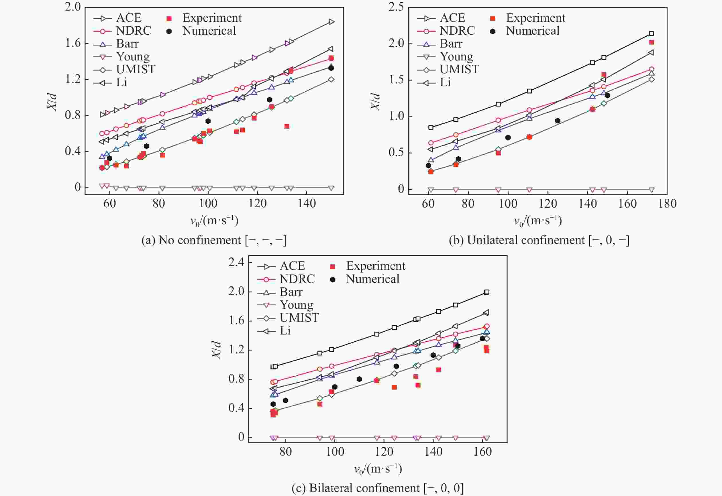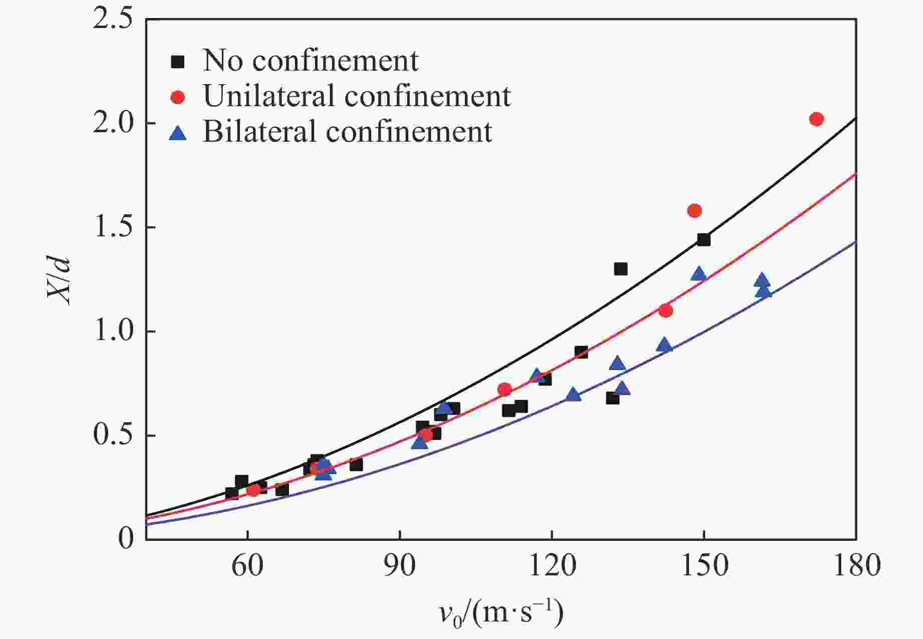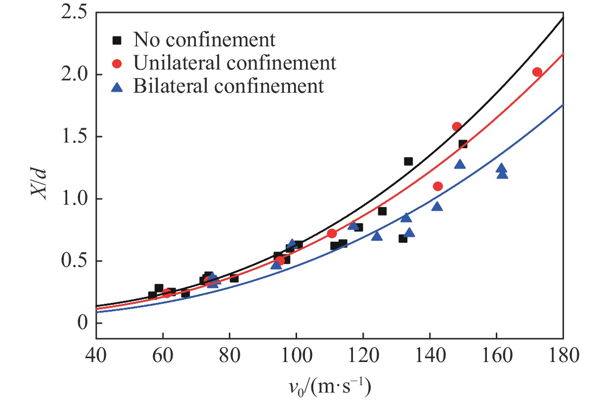 ${\rho{_0} }$/(kg·m−3) G/GPa T0/K c/(J·kg−1·K−1) AJC/MPa BJC/MPa nJC 7830 77 293 477 792 510 0.26 CJC Tm/K d1 d2 d3 d4 d5 0.014 1793 0.05 3.44 −2.12 0.002 0.61 表 3 无量纲侵彻深度公式参数