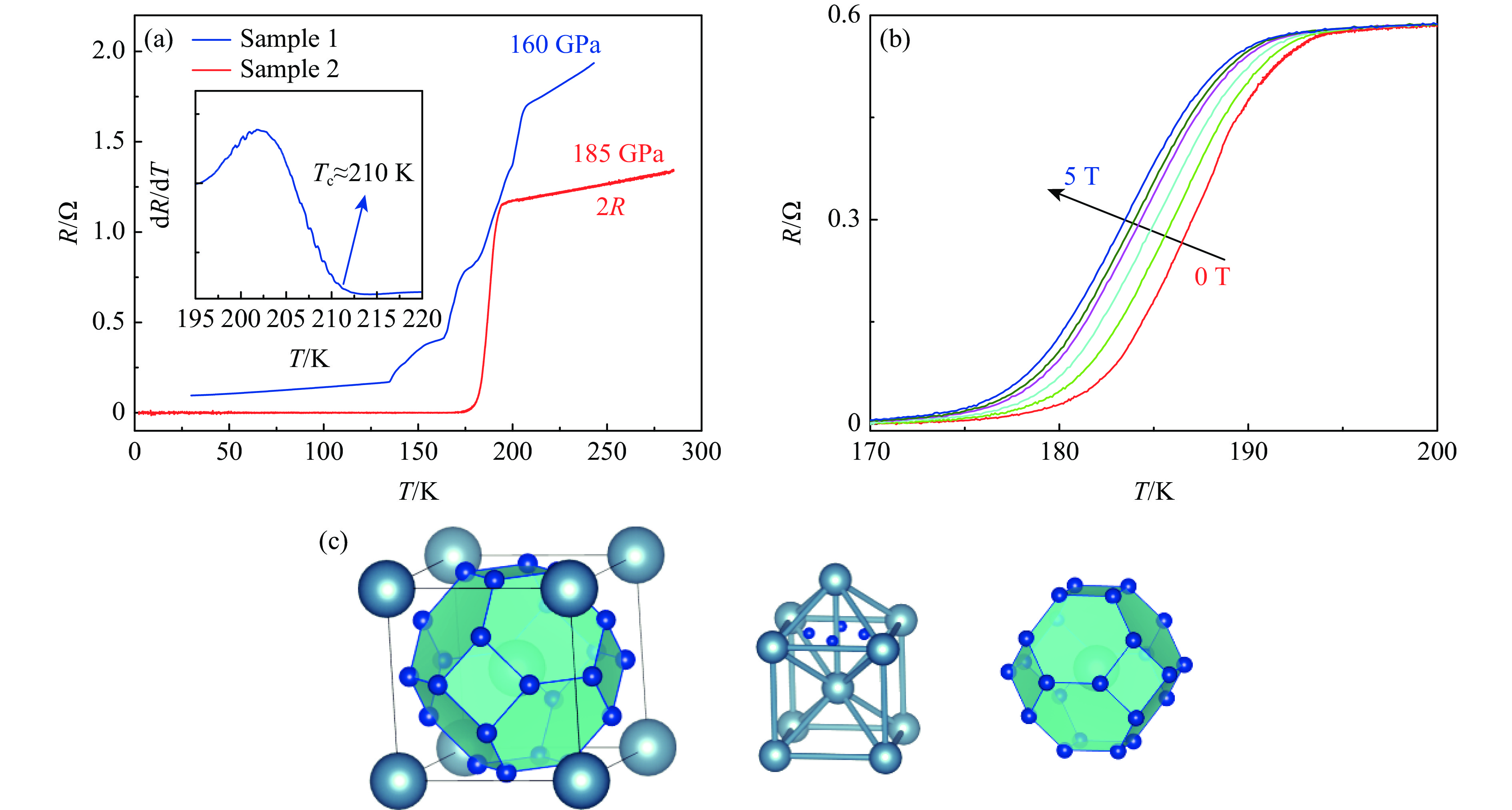 Figure 2. (a) Temperature dependence of resistance measured under high pressure for two calcium polyhydride samples (The inset show the derivative of resistance over temperature. ) [16]; (b) resistance versus temperature measured under different magnetic field for sample 2[16]; (c) scheme of crystal structure of CaH6 (The H atoms occupy the T-site and form H24 cage.)