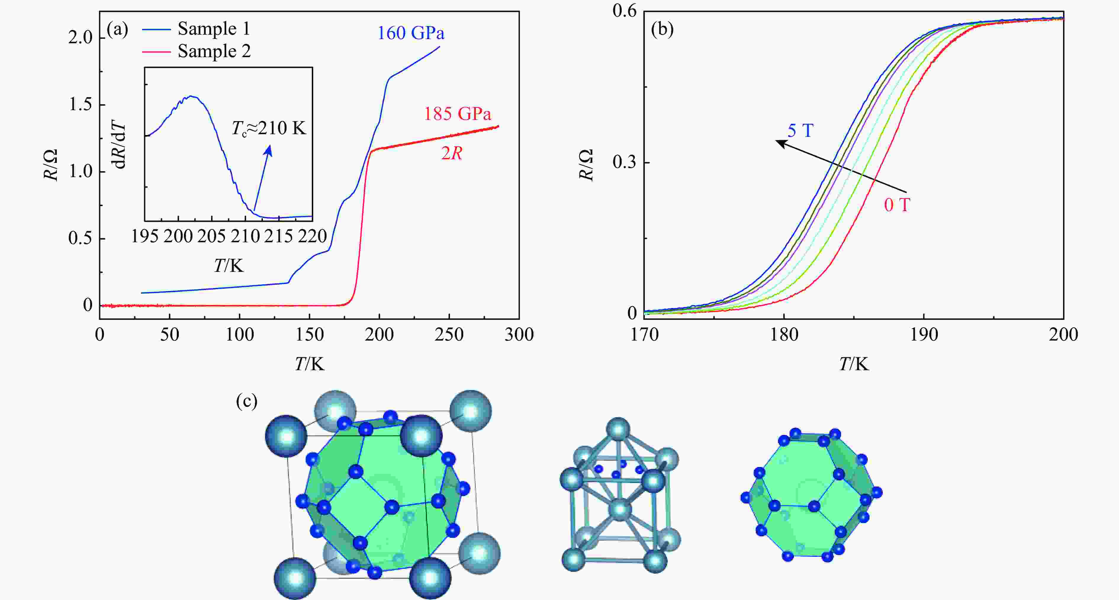 图 2 (a) 钙基富氢样品的高压原位电阻测量数据(插图为样品1电阻数据的微分曲线)[16],(b) 样品2在磁场下的电阻测量数据[16],(c) CaH6晶体结构示意图(H占据体心立方格子的四面体位置,形成H24笼子)