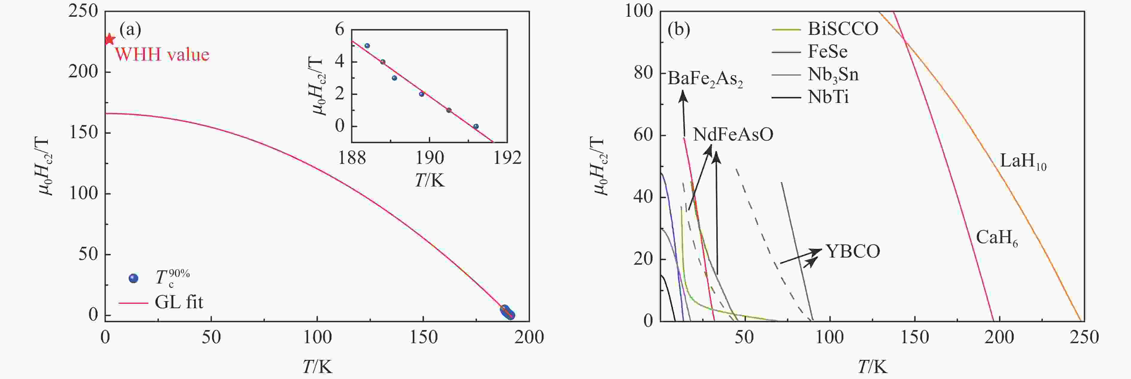 图 3 (a) CaH6超导体上临界场随温度的变化及其GL公式拟合(插图为上临界场数据的线性拟合)[16],(b) 常见超导体及富氢高温超导体CaH6、LaH10的上临界场数据[23]