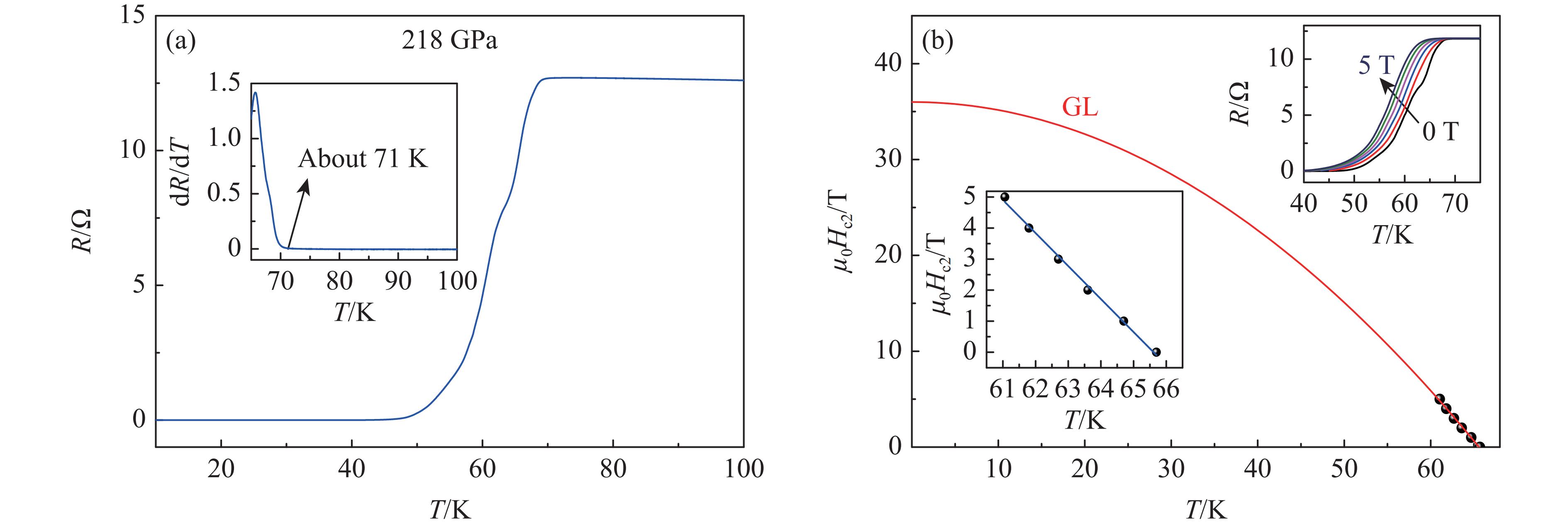 图 4 (a) 218 GPa下镥基富氢样品的原位电阻测量数据(插图为样品电阻数据的微分曲线)[27],(b) 镥基富氢样品上临界场随温度的变化及其GL公式拟合(右上插图为磁场下的电阻曲线,左下插图为上临界场数据的线性拟合)[27]