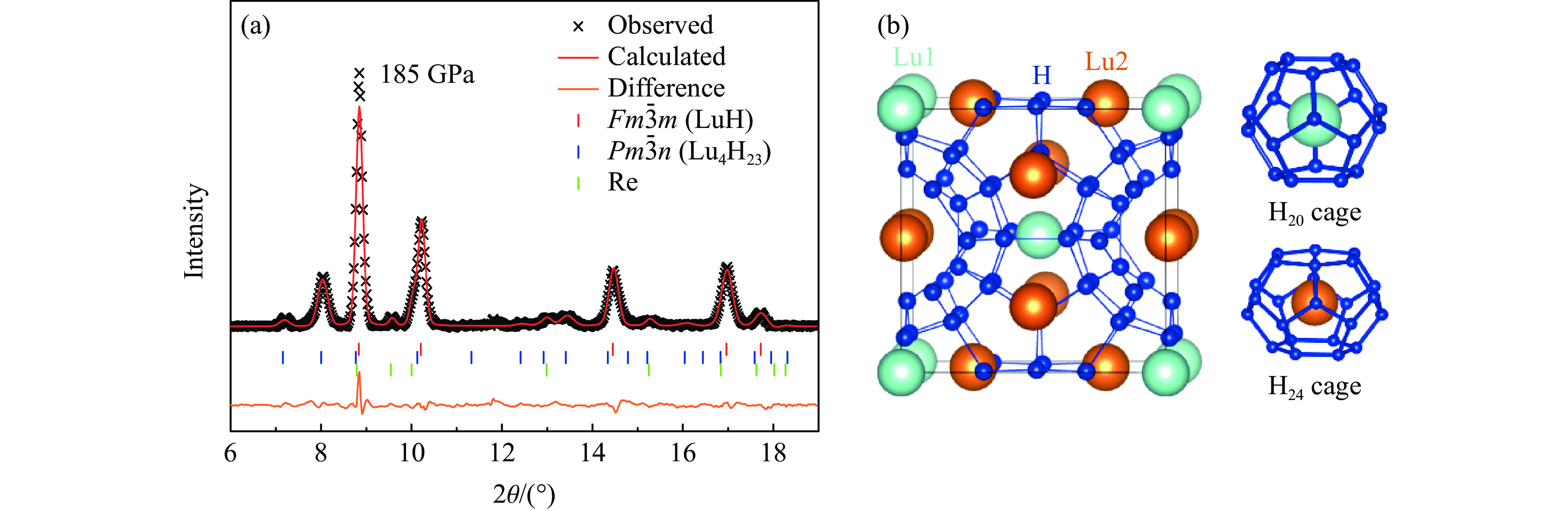 图 5 (a) 185 GPa下镥基富氢样品原位同步辐射X射线衍射谱及其结构精修[27],(b) Lu4H23的晶体结构及其氢笼示意图