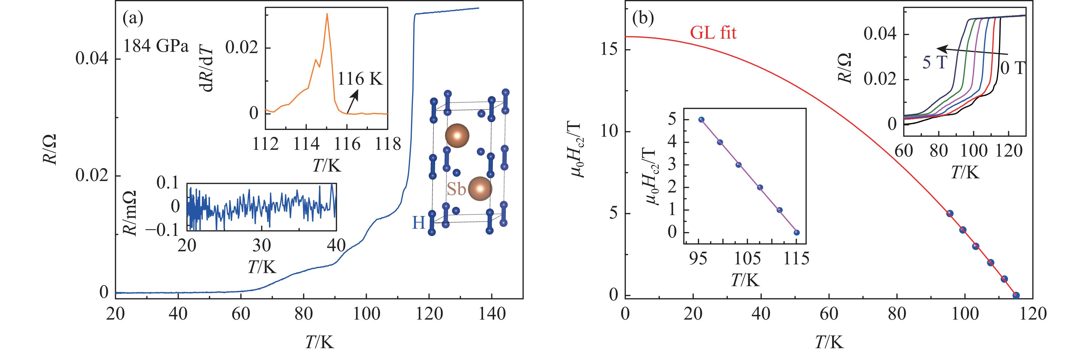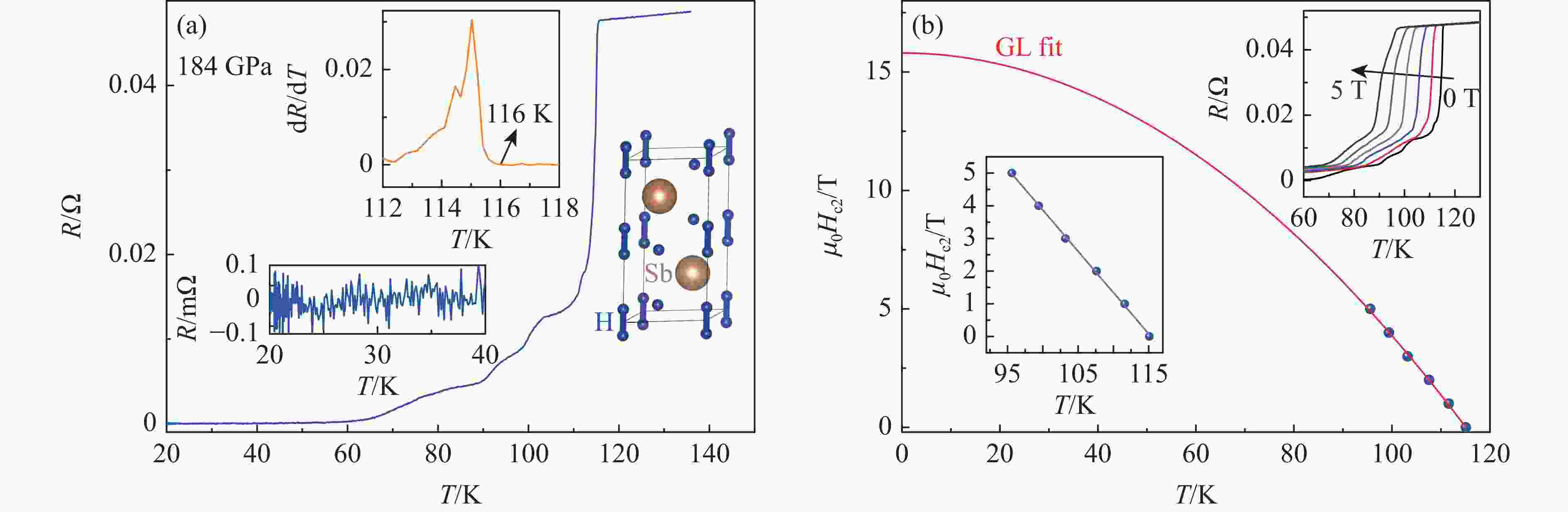 $\overline 3$ n phase of Lu4H23 and its H20 and H24 cages图 6 (a) 184 GPa下锑基富氢样品的原位电阻测量数据(左上插图为样品电阻数据的微分曲线,左下插图为低温下零电阻放大图,右插图为P63/mmc相SbH4的晶体结构示意图)[19],(b) 锑基富氢样品上临界场随温度的变化及其GL公式拟合(右上插图为磁场下的电阻曲线,左下插图为上临界场数据的线性拟合)[19]