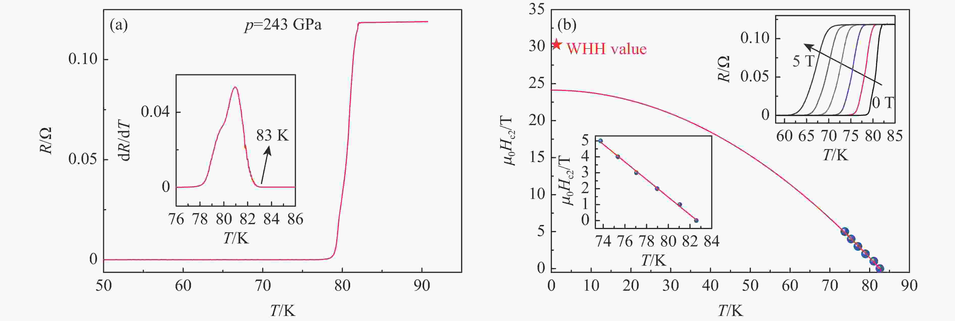 图 7 (a) 243 GPa下铪基富氢样品的原位电阻测量数据(插图为样品电阻数据的微分曲线)[34],(b)铪基富氢样品上临界场随温度的变化及其GL公式拟合(右上插图为磁场下的电阻曲线,左下插图为上临界场数据的线性拟合)[34]