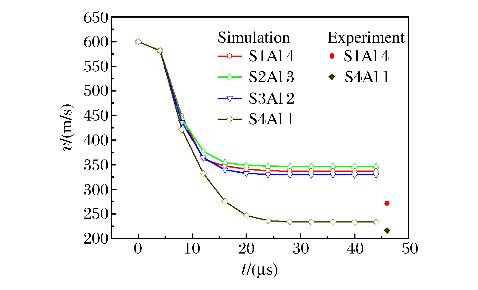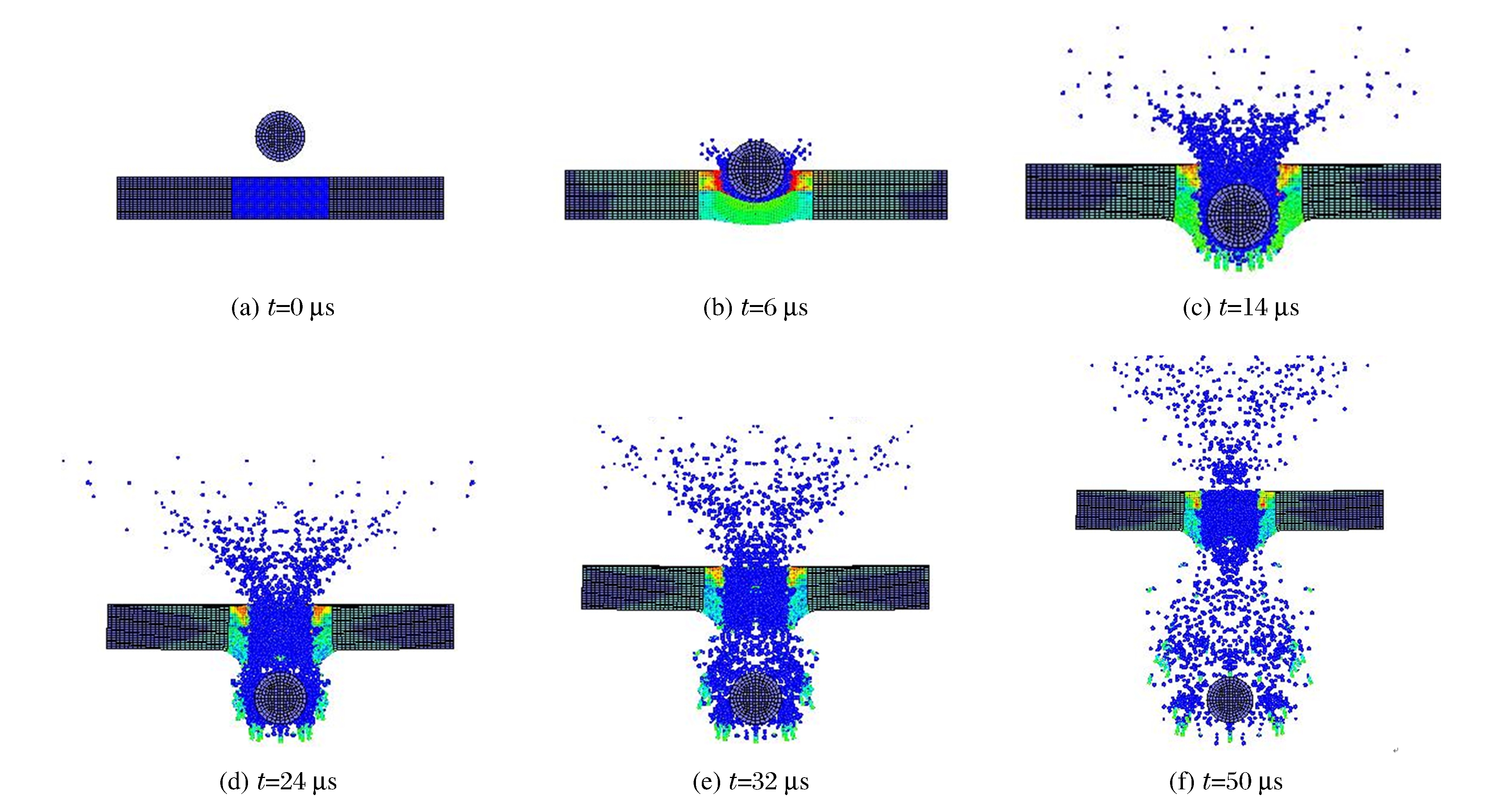 以钢/铝双硬度爆炸焊接复合靶为研究对象,采用系列弹道实验和数值模拟方法,研究了其在球形弹丸垂直侵彻作用下的抗侵彻性能。侵彻实验利用直径为14.5 mm的滑膛枪发射直径为6 mm的钢质球形弹丸;采用LS-DYNA3D非线性有限元程序和有限元-光滑粒子流体动力学(FE-SPH)耦合法,进行数值模拟。基于实验和数值模拟结果,分析了不同靶板的毁伤机理和破坏模式,以及靶板厚度、强度等因素对复合靶抗侵彻性能的影响。结果表明:在球形弹丸的垂直侵彻作用下,钢面板发生剪切冲塞破坏,铝背板发生延性扩孔破坏;对于双层靶而言,钢面板与铝背板的厚度比约为2/3时,复合靶的抗侵彻性能最差;数值计算结果与实验结果吻合良好,表明FE-SPH耦合算法可较好地预测双层复合靶板的抗侵彻性能。